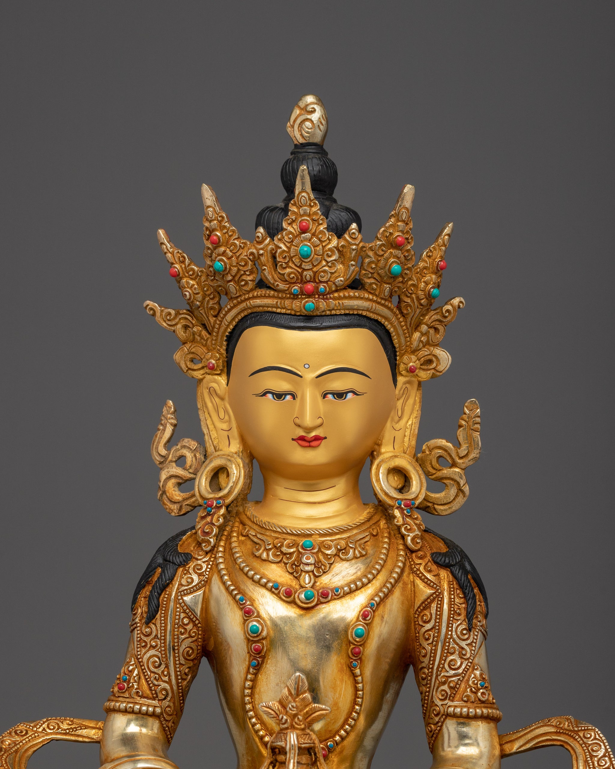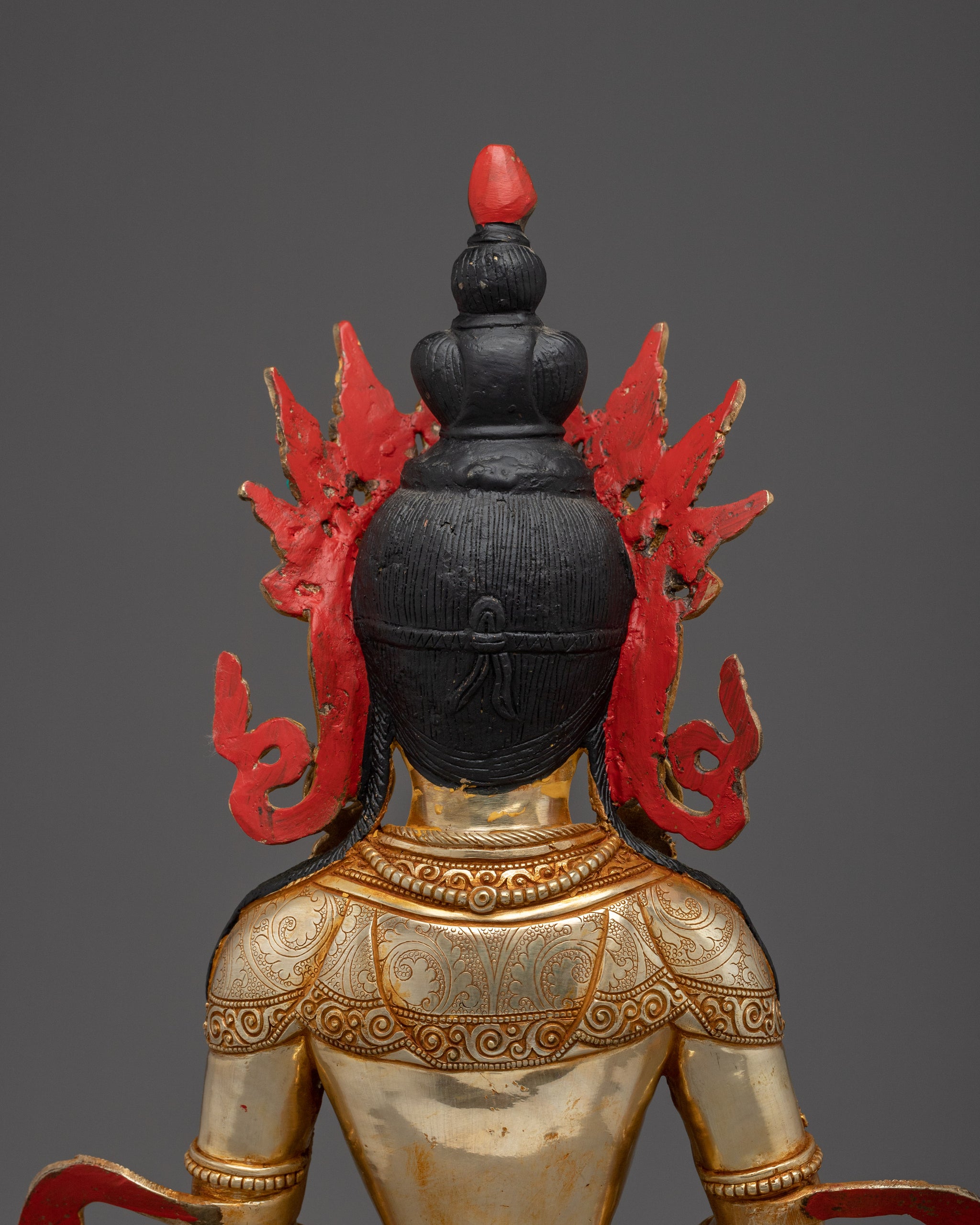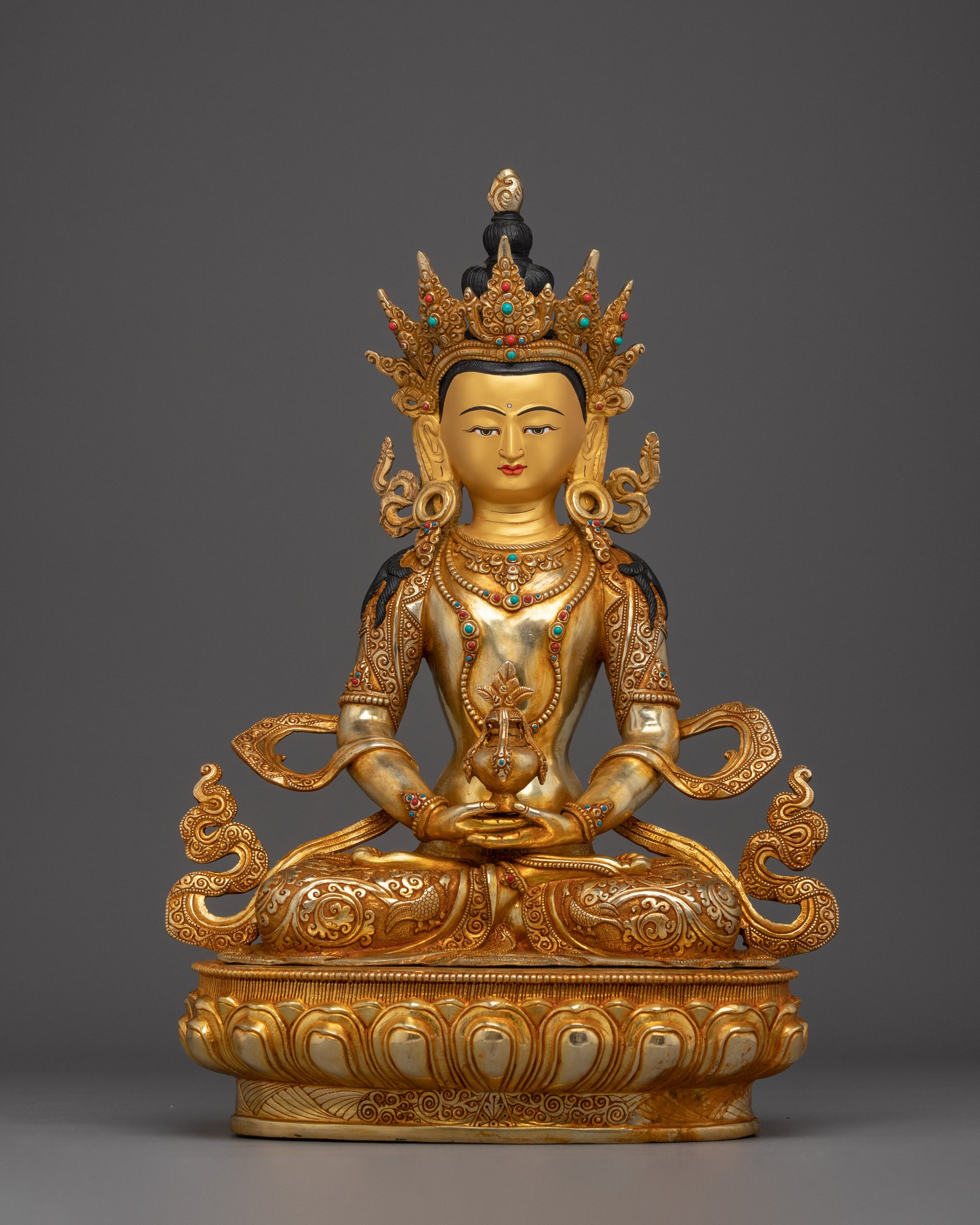 This Amitayus Statue stands 19.1 inches (48.5 cm) tall with a base width of 13.4 inches (34 cm), and weighs 7.83 kg. Expertly handcrafted from a copper body, it is lavishly adorned with 24K gold gilding, intricate gold and acrylic paintings, and decorated with carefully inlaid gemstones that enhance its sacred elegance. Amitayus, the Buddha of Infinite Life, is revered in Tibetan Buddhism as a deity of longevity, merit, and wisdom. His serene expression and regal form embody the blessings of vitality and spiritual abundance. This statue is an ideal addition to altars, meditation spaces, or sacred art collections dedicated to long life and spiritual fulfillment.
