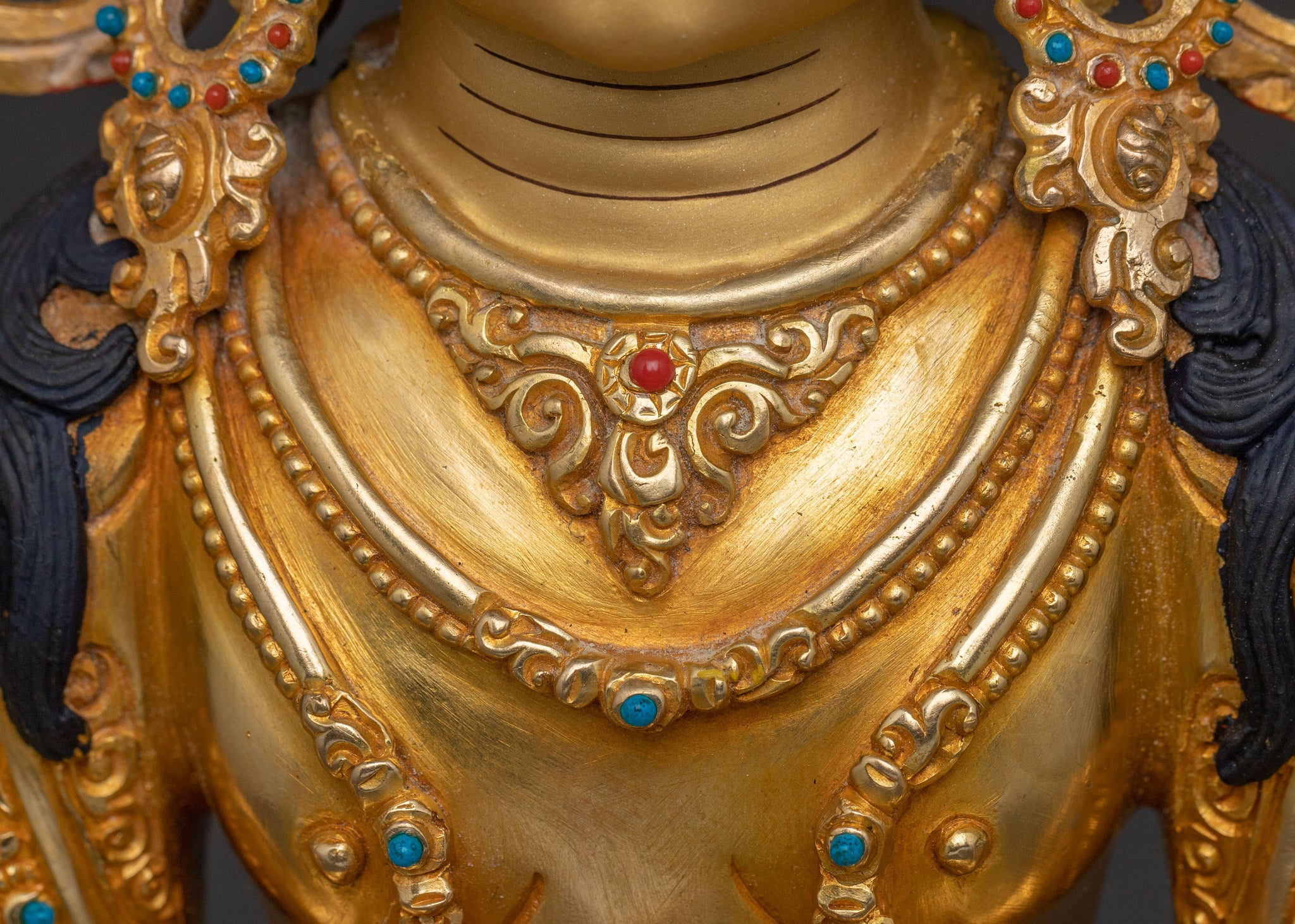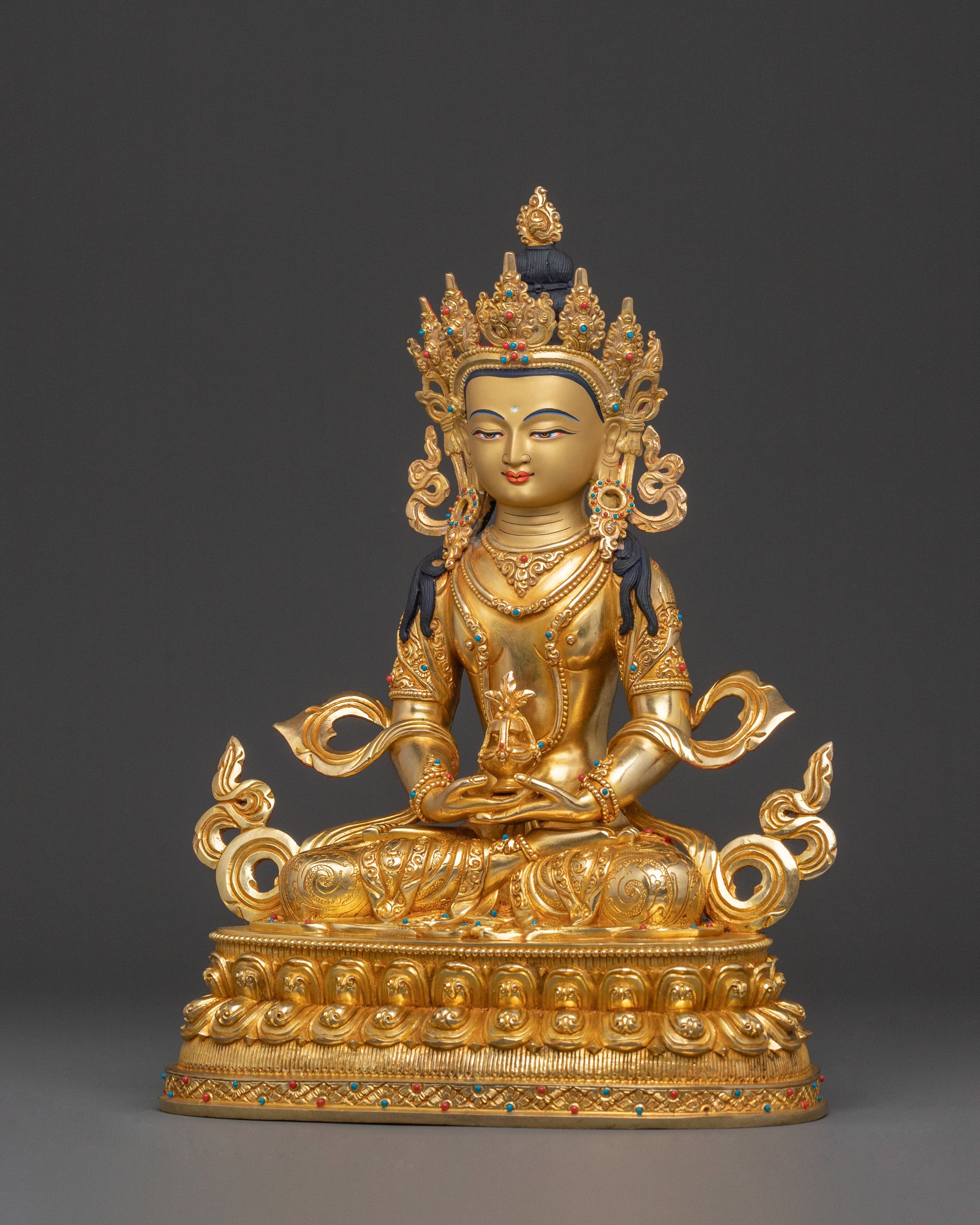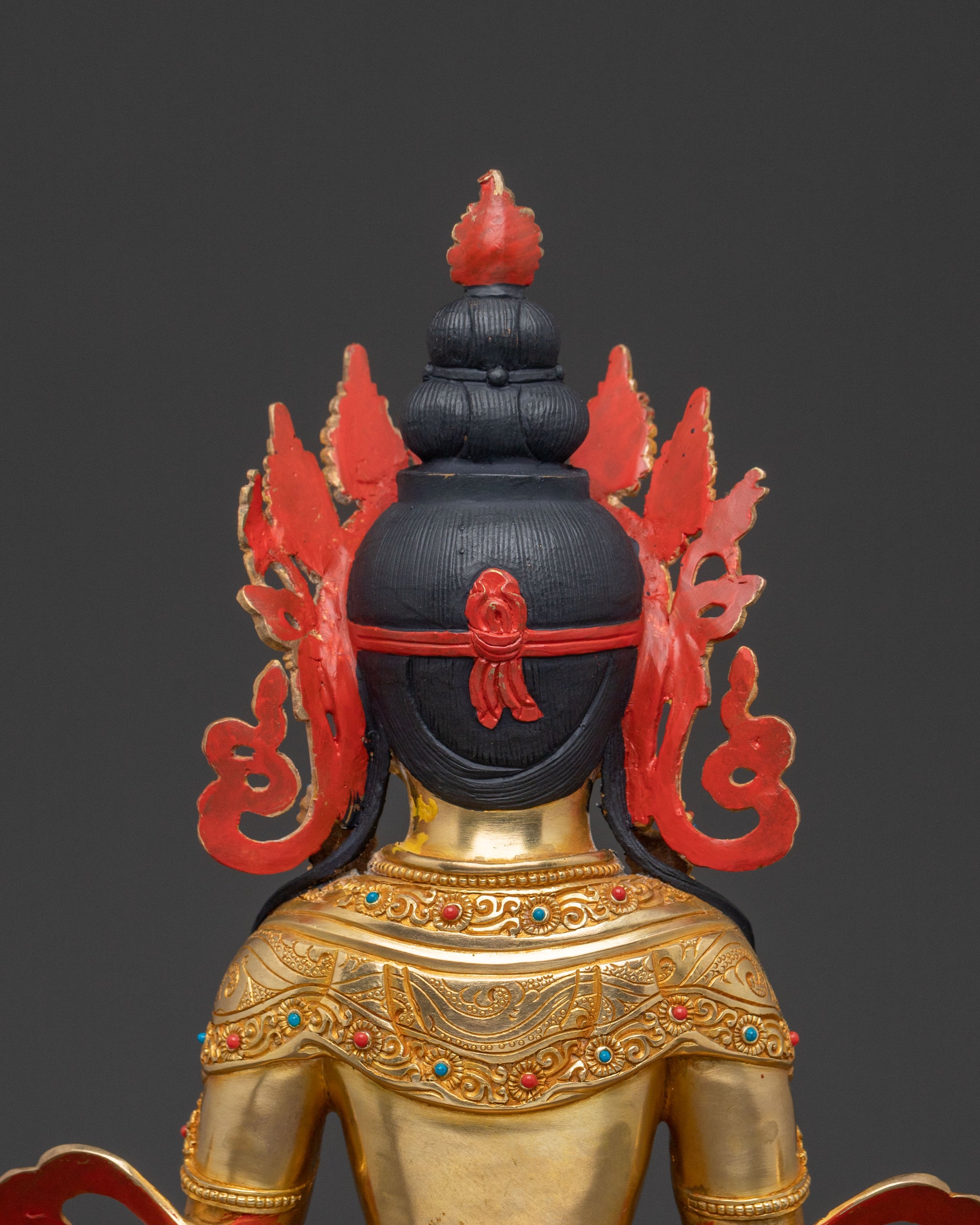 This Amitayus sacred statue emerges as a beacon of eternal life, handcrafted with precision from a copper body and covered with a triple layer of 24K gold gilding, carved with deeply engraved details that create a magnificent 3D-like effect, then enriched with vibrant acrylic hand paintings and fine ornamental accents, offering a profound sense of peace and bringing a hallowed, radiant presence to any altar, meditation room, or sacred space.