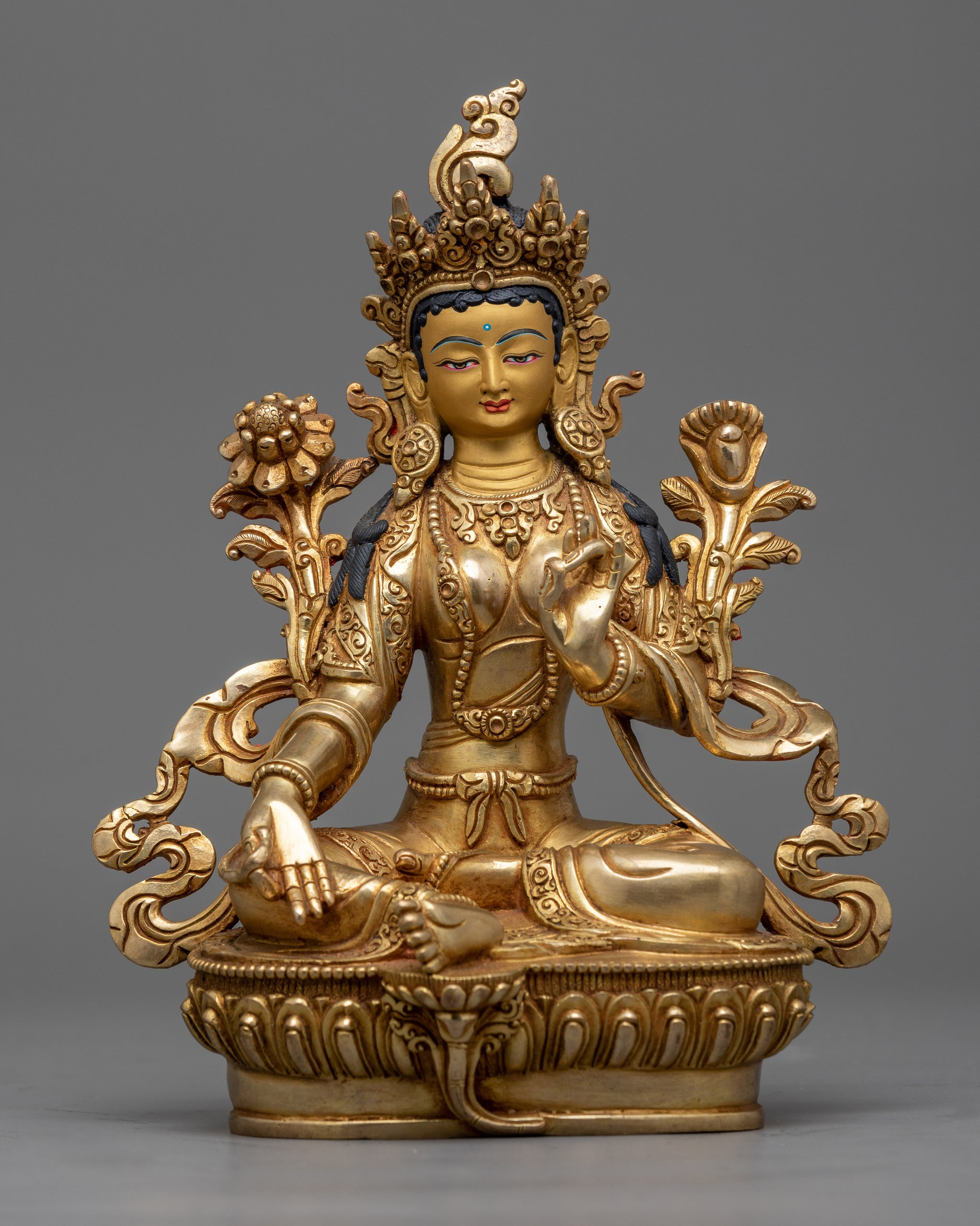 The benevolent goddess of enlightened action, Green Tara, is highly esteemed for her prompt response to the prayers of her followers. She reflects the virtues of development, healing, and transformation, her green color signifying the promise of rejuvenation and the lushness of spring. The "gesture of granting protection," which Green Tara makes with her hand, represents her willingness to shower blessings and clear the way for those who follow her. Green Tara is a sign of divine beauty and compassion that encourages practitioners to develop wisdom and compassion in their daily lives.