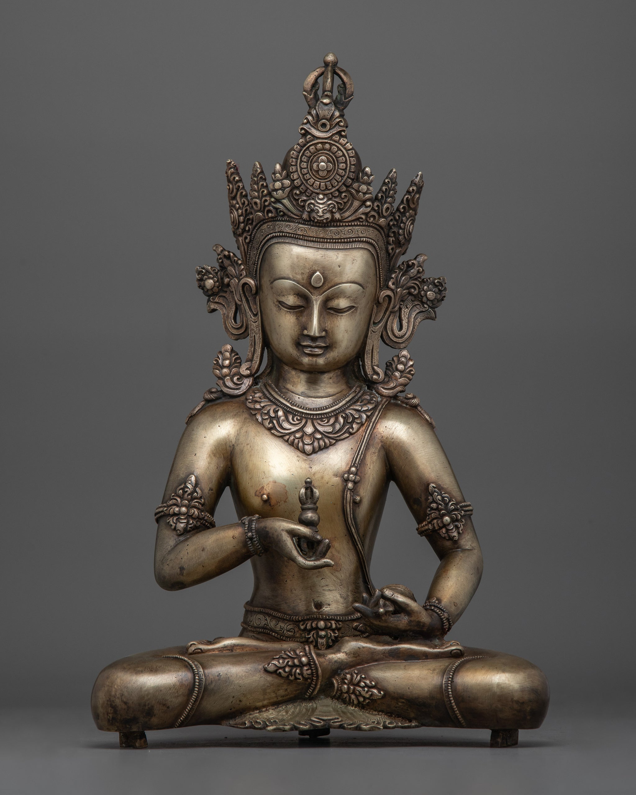 This beautiful antique-finished Vajrasattva Statue stands 15.7 inches (40 cm) tall with a base width of 10.2 inches (26 cm) and weighs 5 kg. This statue, crafted from bronze with a beautiful Antique Finish, exemplifies the fine craftsmanship of ancient Tibetan art. The statue embodies the essence of Vajrasattva, making it an ideal addition to your Buddhist shrine or as a peaceful piece of home decor.