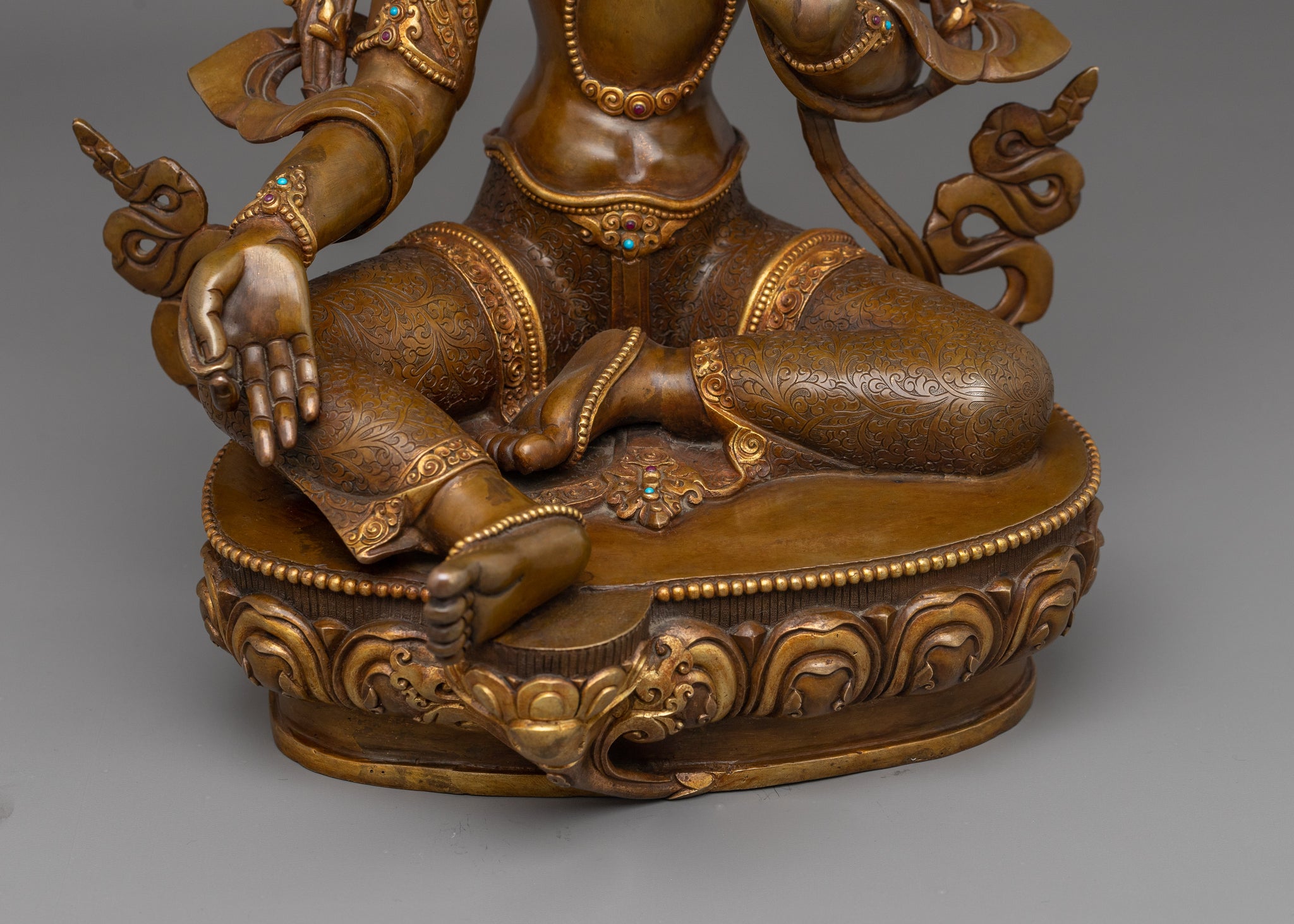 Our Arya Tara Oxidized Figurine, which has been delicately sculpted and adorned with fine details by skilled artisans. This sculpture, which is made of oxidized copper and 24K gold gilding, has a perfected, spiritual atmosphere about it. The artist's hand captures the spirit of Green Tara's heavenly wisdom with each stroke, bringing her calm look and kind approach to life. The figurine's flowing robes and exquisite features showcase Nepali craftsmanship's painstaking attention to detail and commitment to perfection.