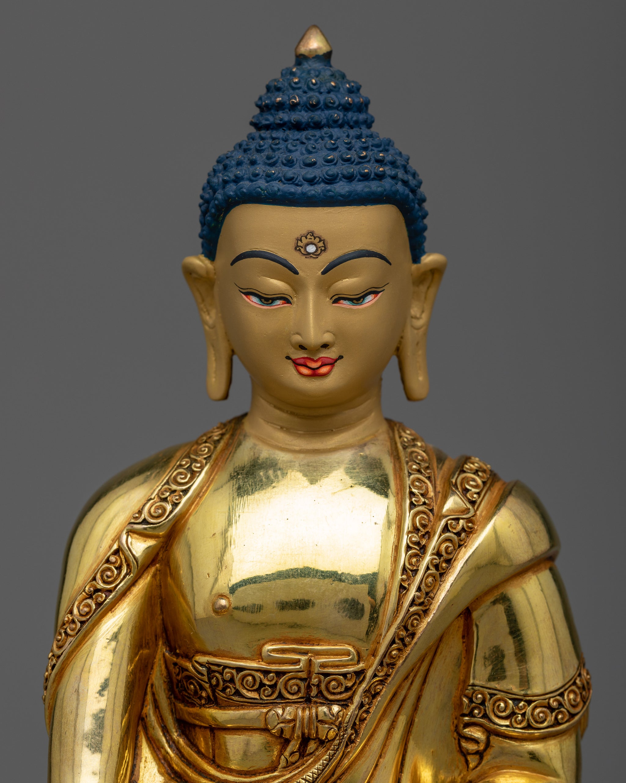 With our Ascetic Shakyamuni Buddha, embark on the profound journey of Buddha's path to enlightenment. This handcrafted statue captures a key period in Buddha's life, masterfully carved from a solid copper body and embellished with 24k gold gilding and brilliant acrylic paintings. It is a powerful symbol of tenacity, sacrifice, and the pursuit of truth, and it would be an amazing addition to any personal or communal place.