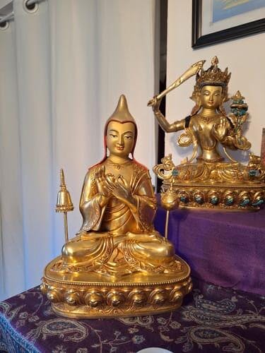 The intricate patterns on Atisa's robes and the textures of the lotus seat are only two examples of the laborious carving that went into creating this statue. The fine characteristics have been expertly emphasized by the craftspeople, lending a sense of refinement and spiritual significance. The use of 24K gold gilding highlights the artists' exceptional skill in addition to signifying the sacredness of Atisa. For those looking for artwork that infuses their surroundings with a sense of tranquility and meditative beauty, this statue is perfect.
