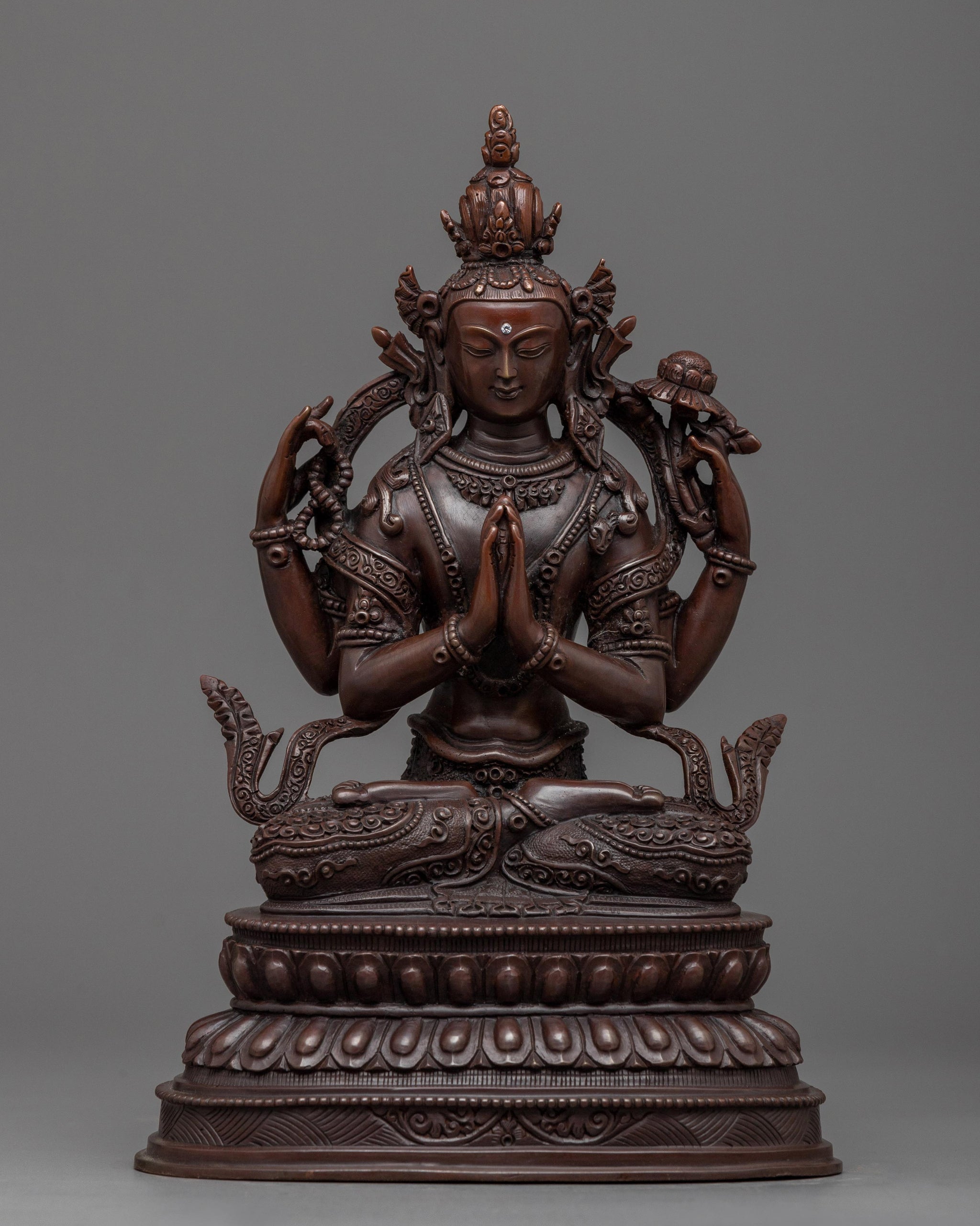 With our gorgeous Chenrezig statue, you may bring Avalokiteshvara, also known as "Avalokiteshvara Lord of Who Witnesses Cries of the Ignorant," into your room. This skillfully made statue, which stands 9.4 inches tall and rests on a 6.2-inch base, serves as a constant reminder of the value of empathy and compassion in our lives. The statue's substantial 2.036 kg weight is evidence of its high craftsmanship and the oxidized copper material used in its construction. This Chenrezig statue was created by our skilled artisans in Nepal, and every element perfectly encapsulates the holy compassion that Avalokiteshvara exemplifies. The piece has depth and charm thanks to the oxidized copper body's vintage appeal.