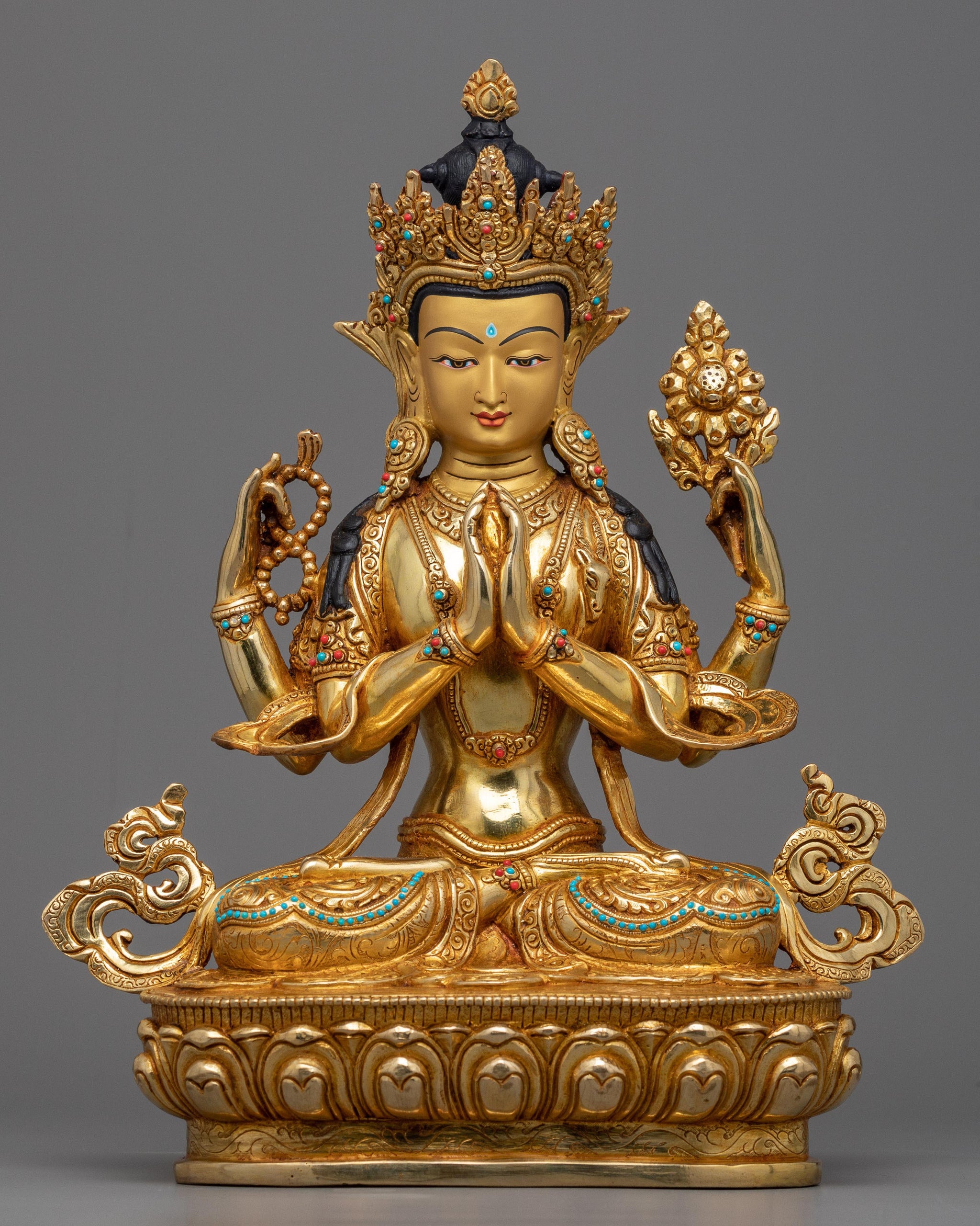 Elevate your spiritual practice and invite the blessings of Chenrezig into your life with this masterfully crafted, gold-gilded statue.