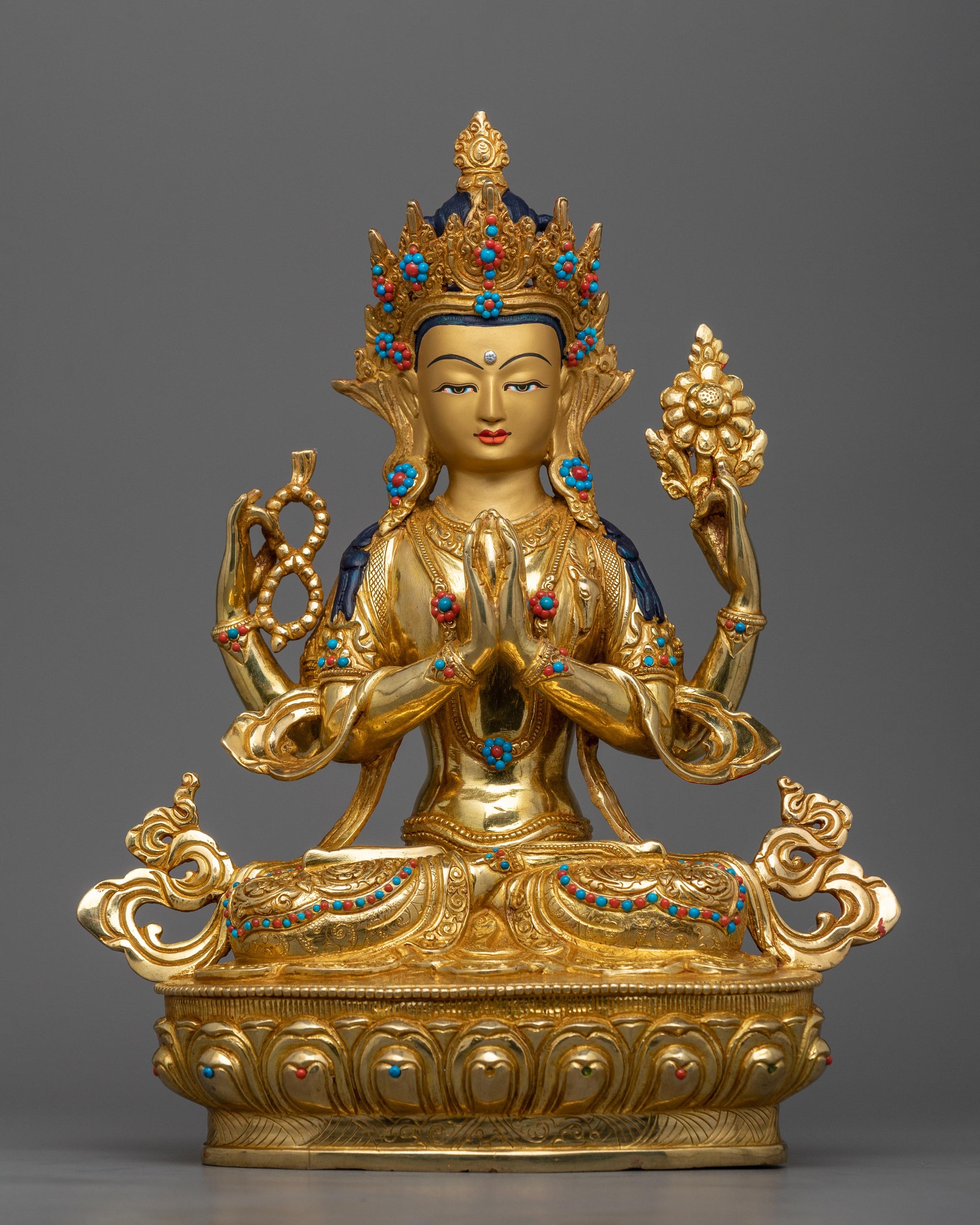 Our 4-Armed Chenrezig Statue, a quality sculpture that oozes spiritual grace and excellent craftsmanship, embodies beauty and compassion. This 13.5-inch-tall statue honors Chenrezig, the Bodhisattva of Compassion, who is renowned in Tibetan Buddhism for his loving-kindness.