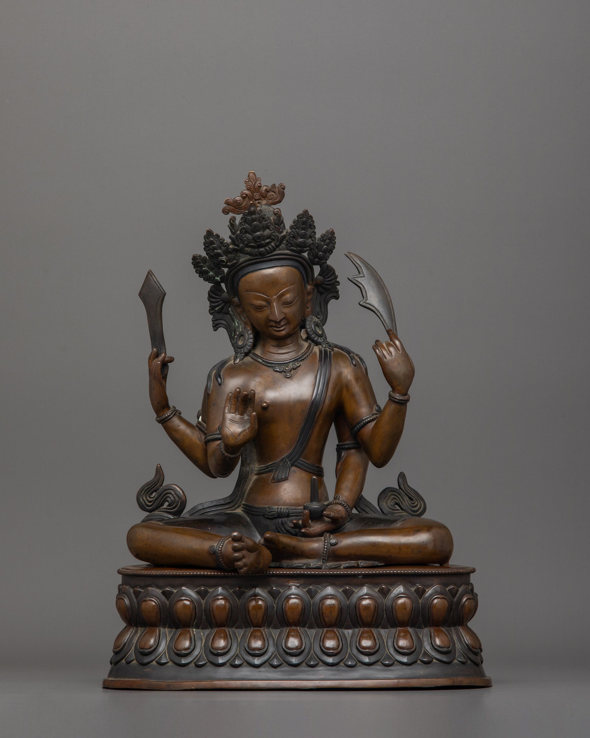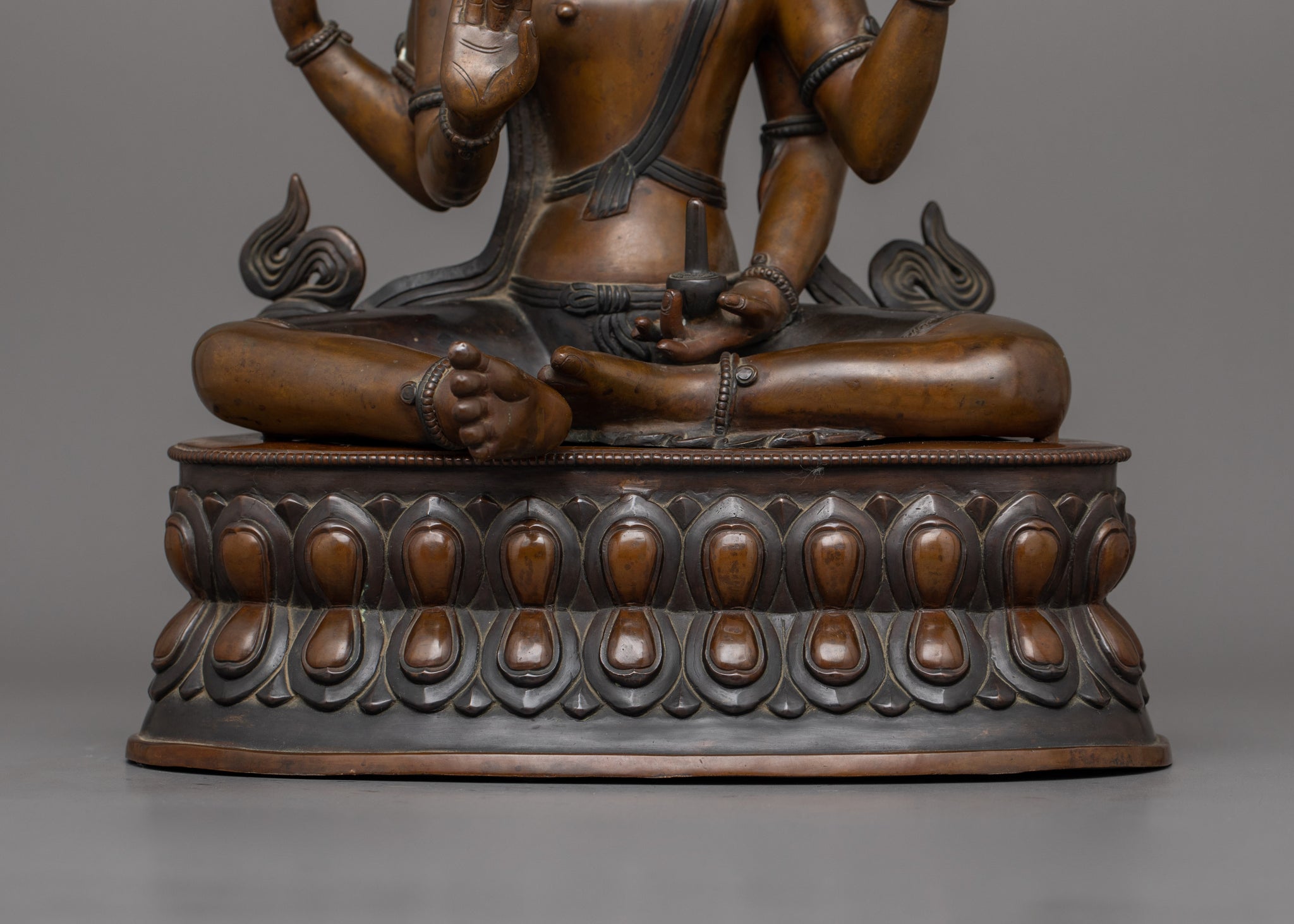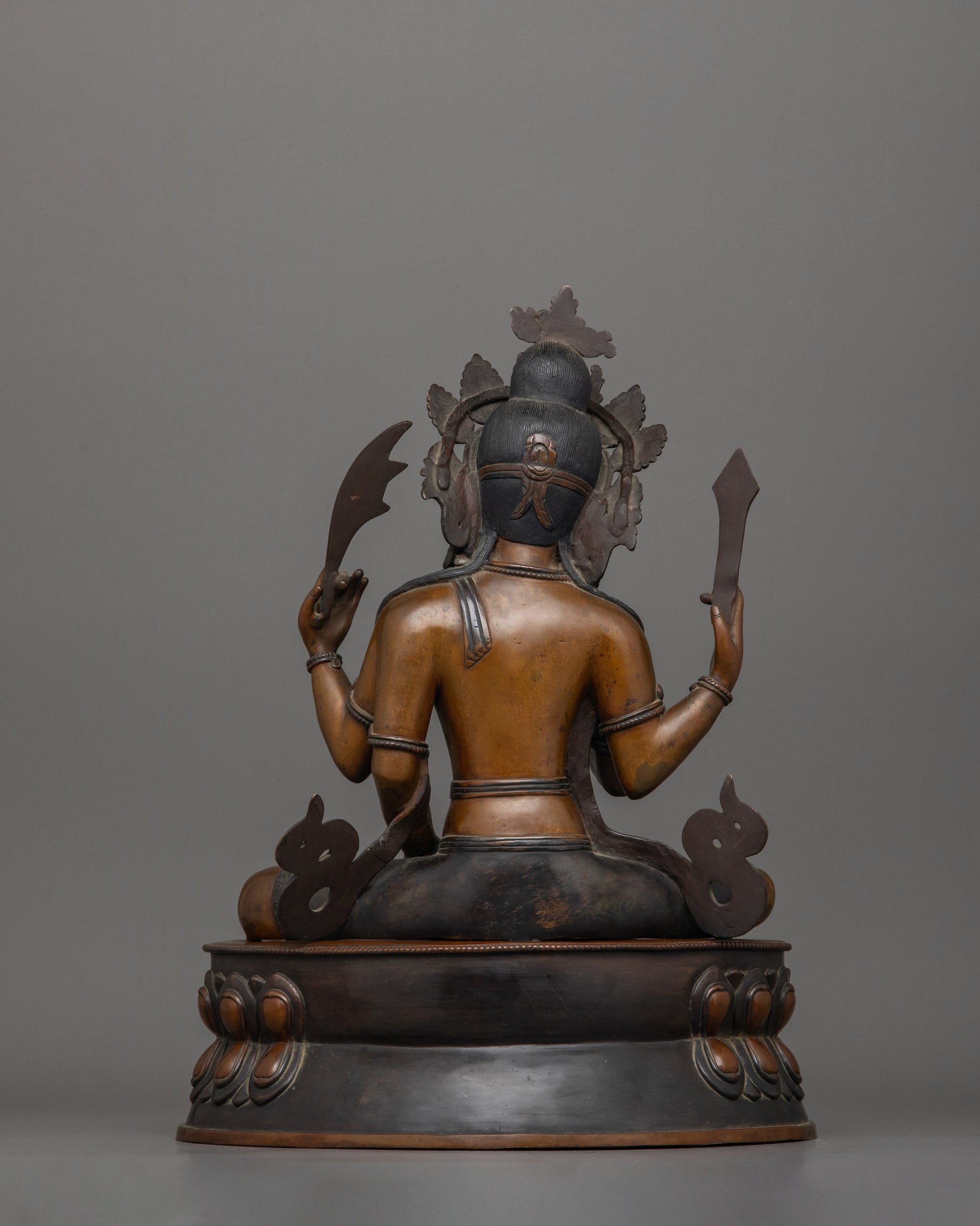 This Beautiful Bodhisattva Statue measures 13.6 inches (34.5 cm) in height and 10.2 inches (26 cm) at the base, weighing approximately 4.12 kg. This Statue is fully made by oxidized copper body. Crafted by expert Nepalese artisans, this sacred item embodies the rich traditions of Himalayan Buddhism, making it an important addition to altars, meditation areas, or sacred collections.