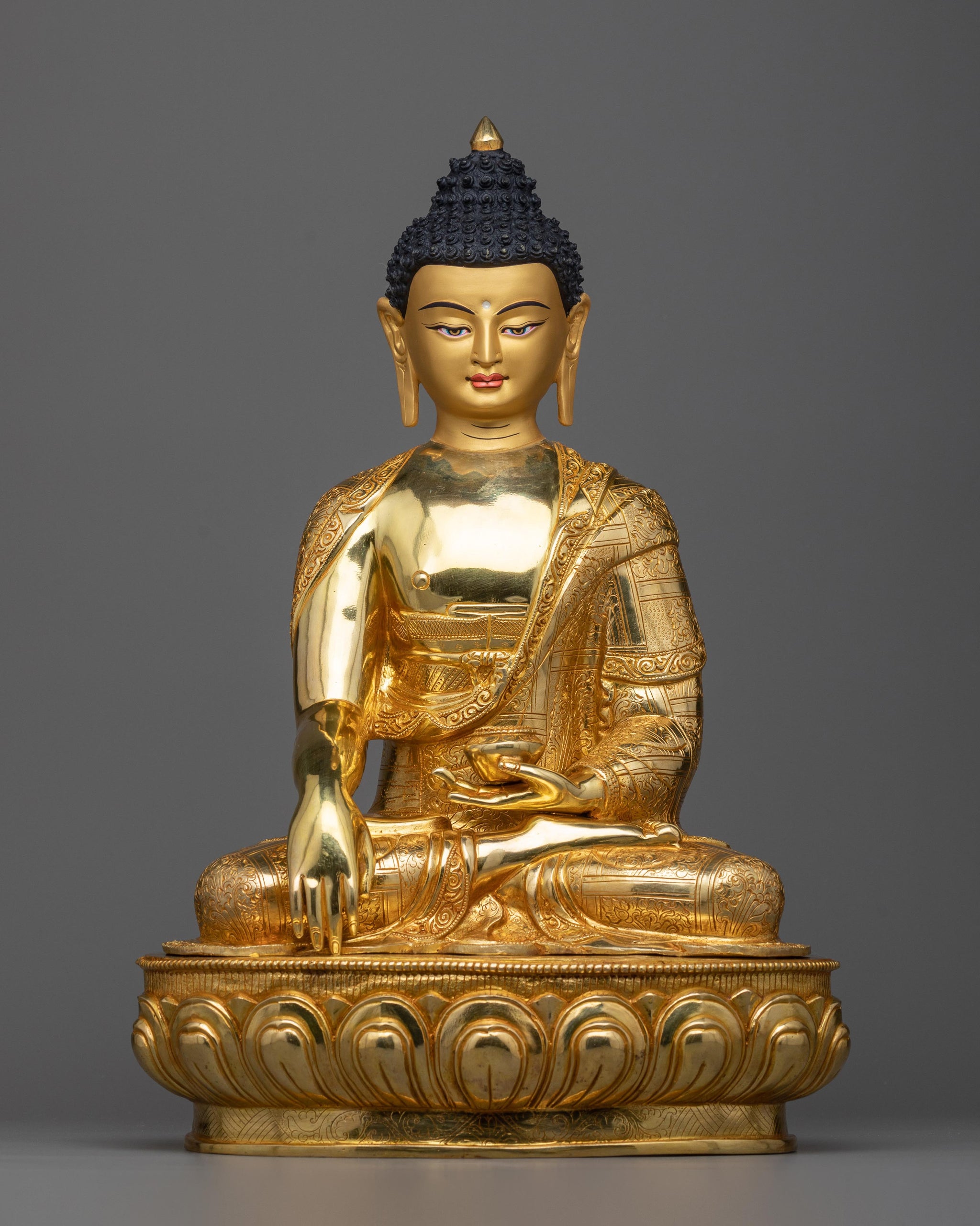 Our Beautiful Shakyamuni Buddha statue is a testament to the wisdom of the ages, with grace and workmanship unrivaled. This masterwork stands tall in Nepal's spiritual heartland, encapsulating the exact essence of tranquillity and deep thought. The sculpture, a symphony of 24k gold plating set against exquisite acrylic paints, exudes a bright tranquility. Its presence, made of pure copper, is a summons to introspection, to travel the path of Dharma, and to embrace the teachings that promise release.