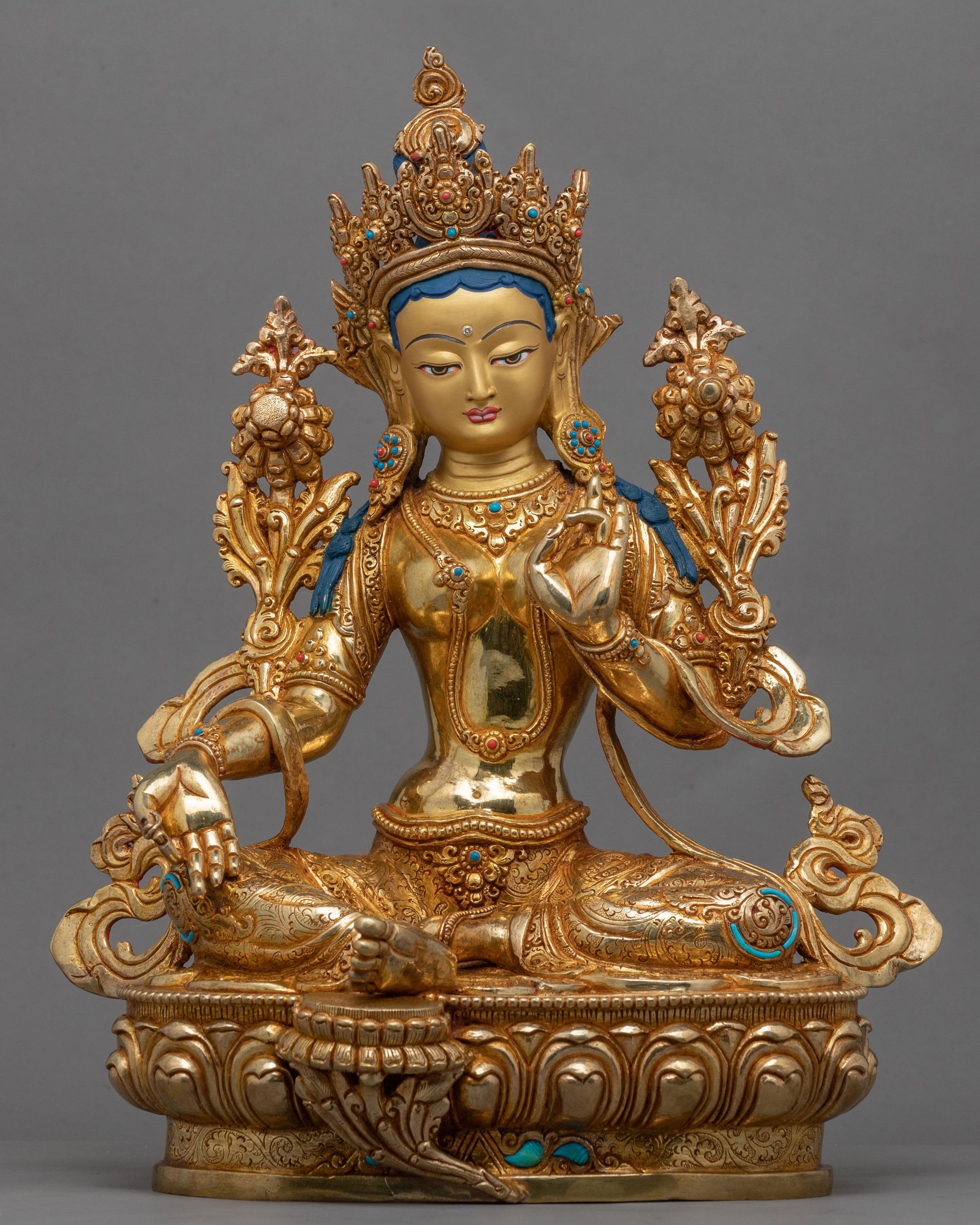 We sculpted the Gold Statue For Benefits Of Green Tara Mantra statue with a pure copper body gilded with genuine 24-karat gold and meticulously hand-painted with acrylic colors to showcase the attributes of the deity. We have used materials of the highest quality to craft the statue. We assure you that this piece of art will last for many years. The hand carvings in the crown and robe are the main highlight of the figurine. The figurine weighs about 4.71 kg. It took us months and months of hard work and dedication to complete the statue.