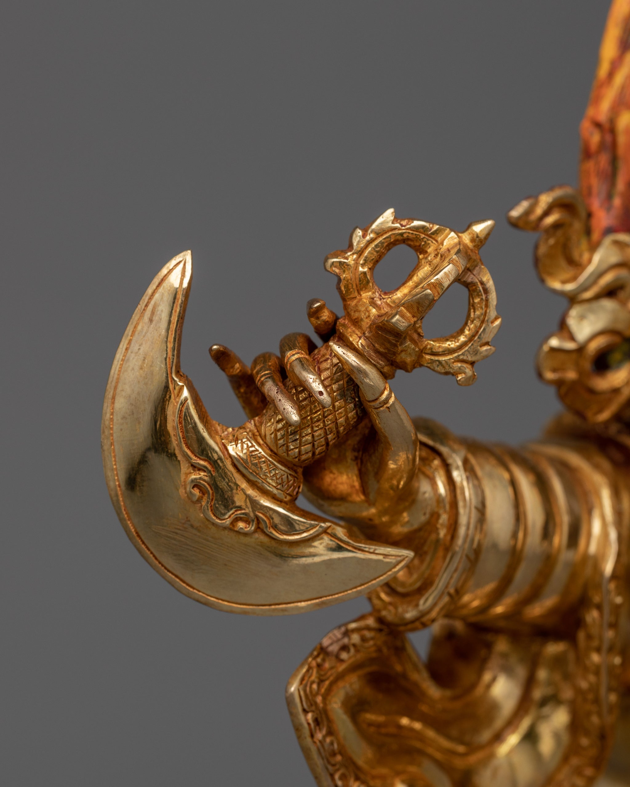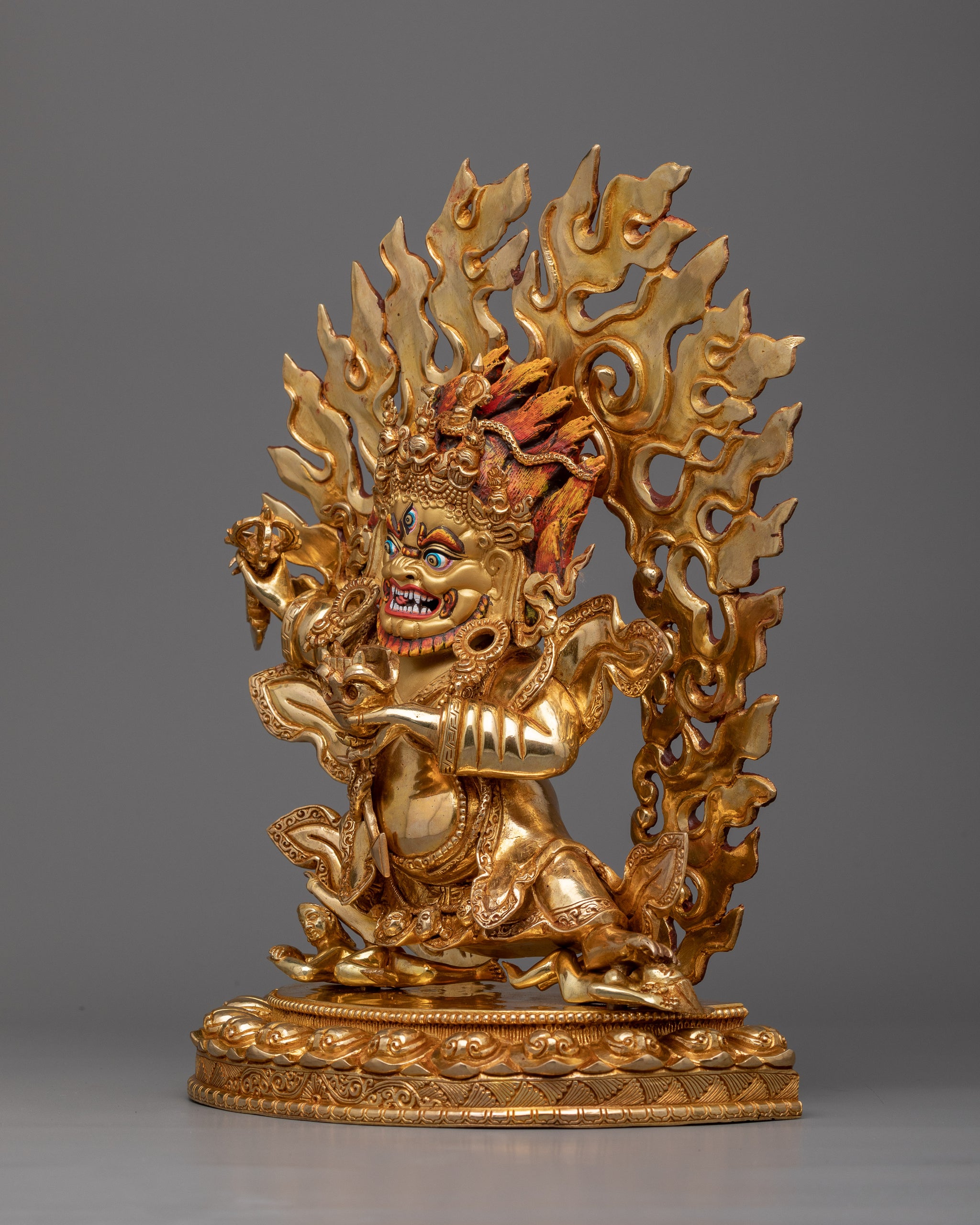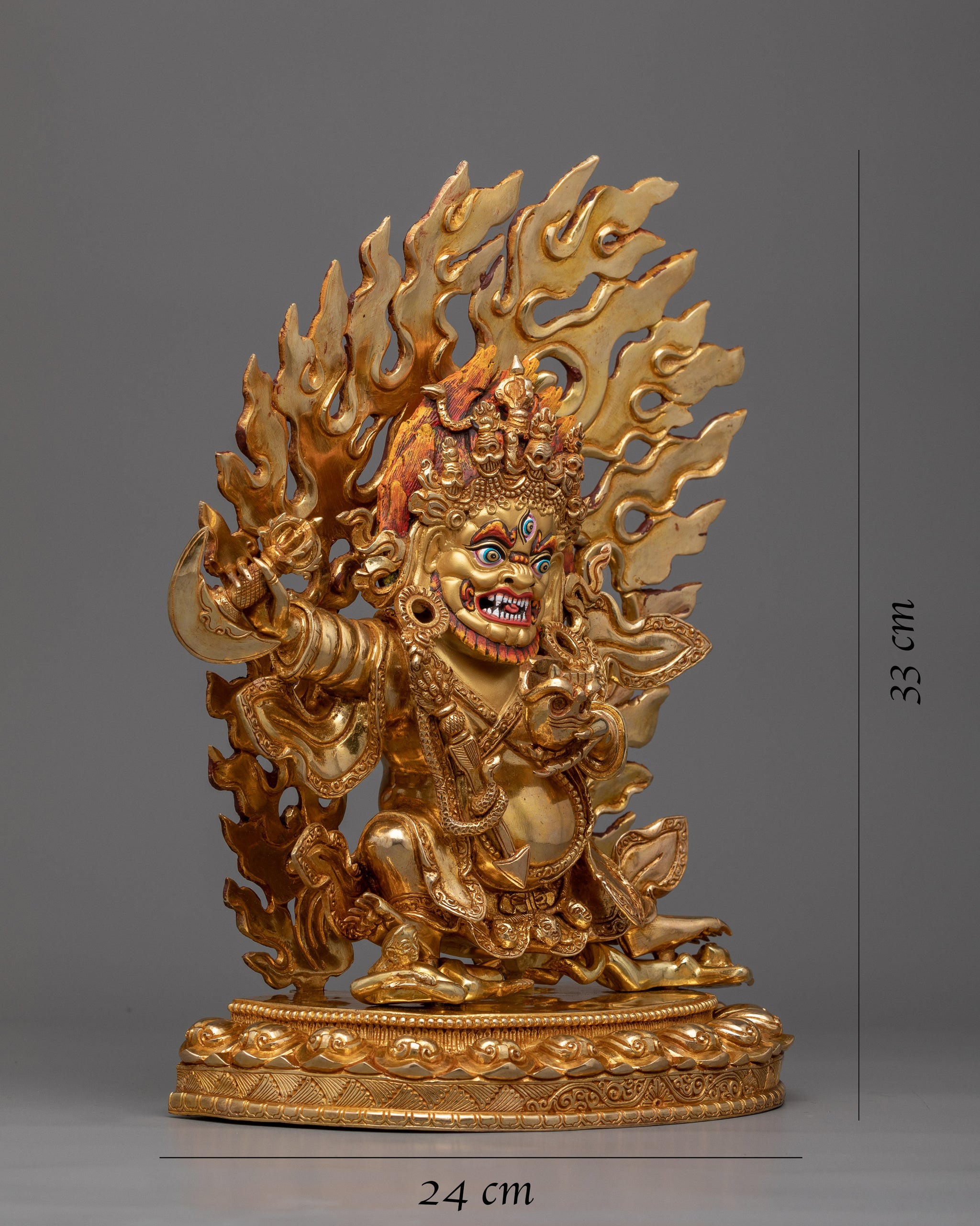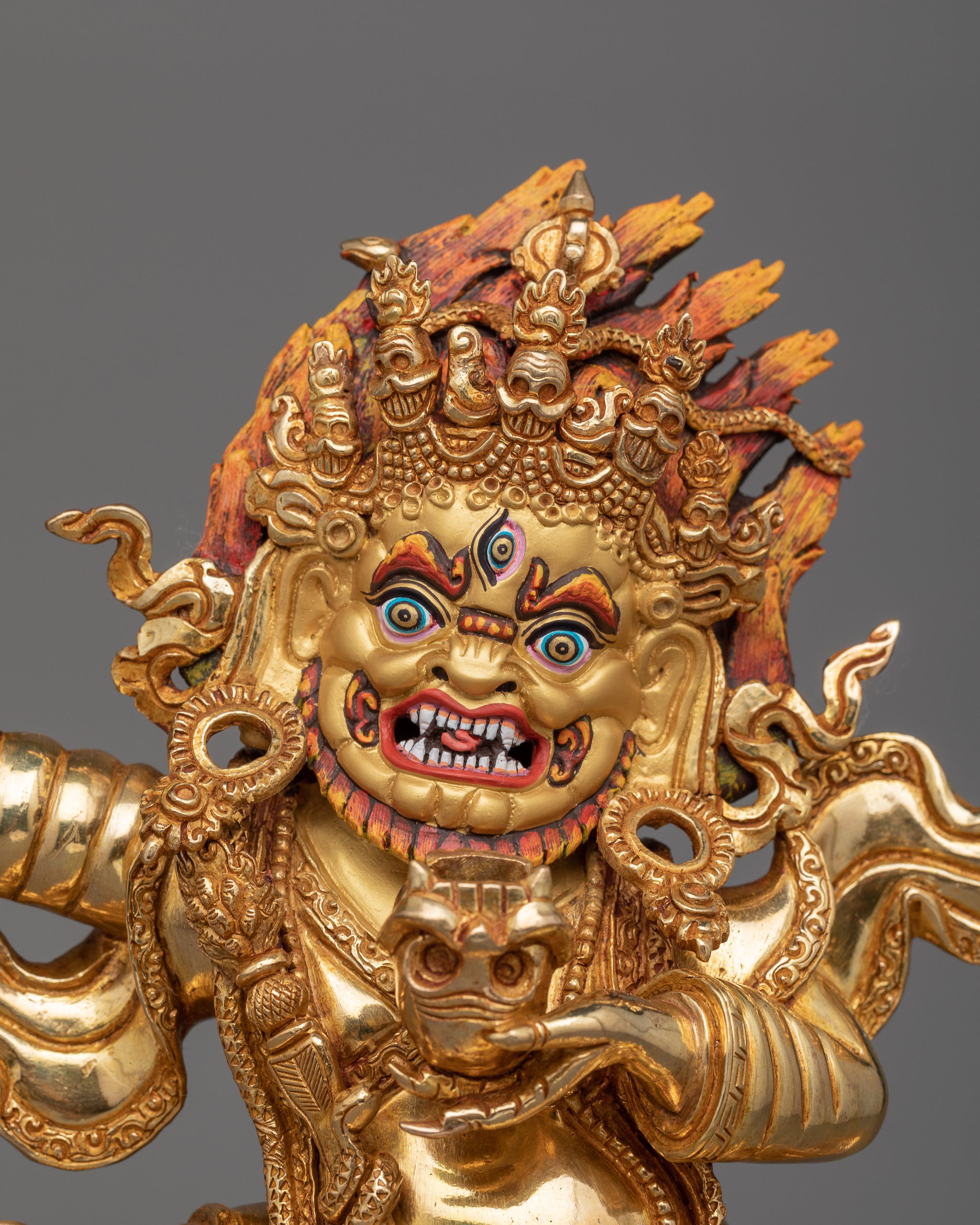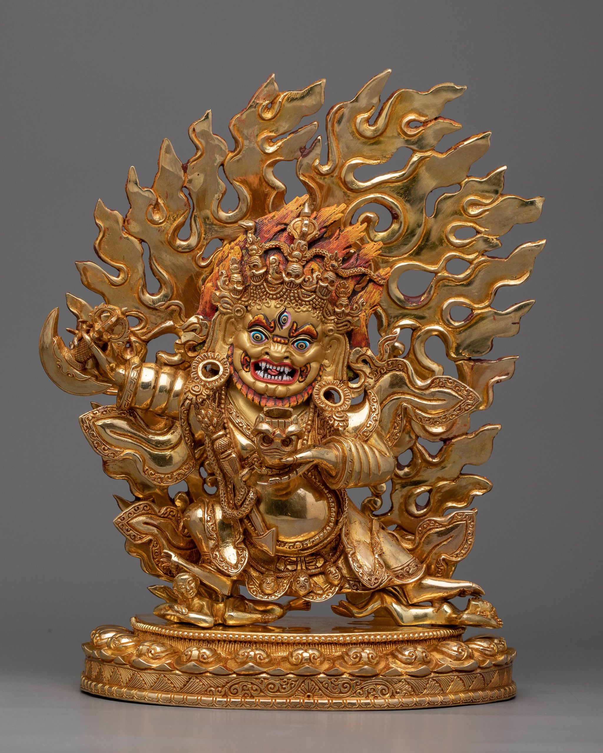 Every detail of this statue reflects the skill and spiritual commitment of our Nepalese craftspeople. The copper body, gilded in 24k gold and detailed with 24k gold and acrylic paints, demonstrates the artistic skill that goes into creating these spiritual marvels. This Mahakala Bernagchen depiction reflects the power of protection against negativity and difficulties, assisting you on your road to enlightenment.