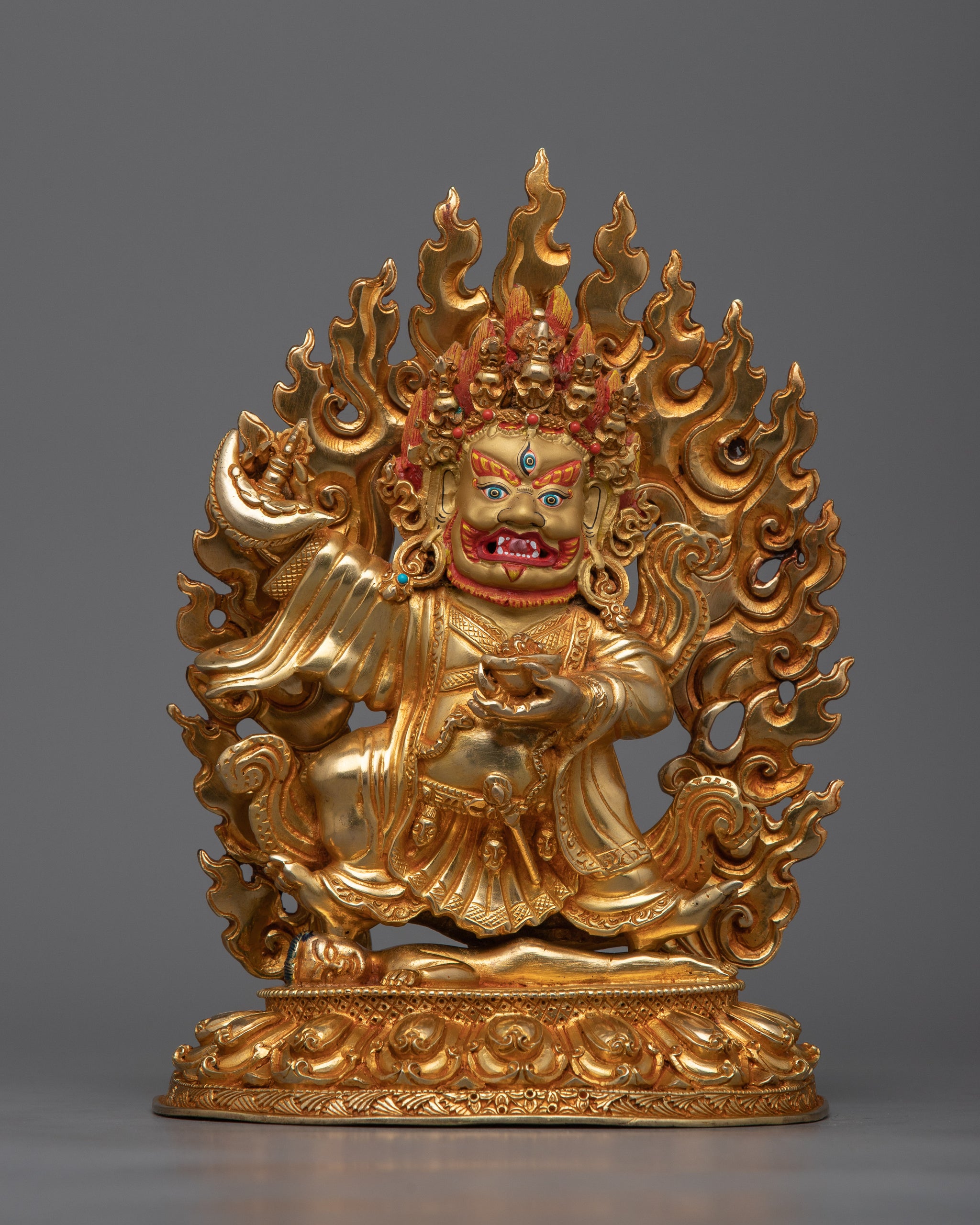 This sculpture is made of high-quality copper, assuring its longevity and resonance with traditional Tibetan creativity. The statue, adorned with 24K gold plating, radiates a spiritual radiance that emphasizes Bernagchen's heavenly essence. The gold finish not only adds to the visual attractiveness but also represents the spiritual power and majesty of this protector deity.