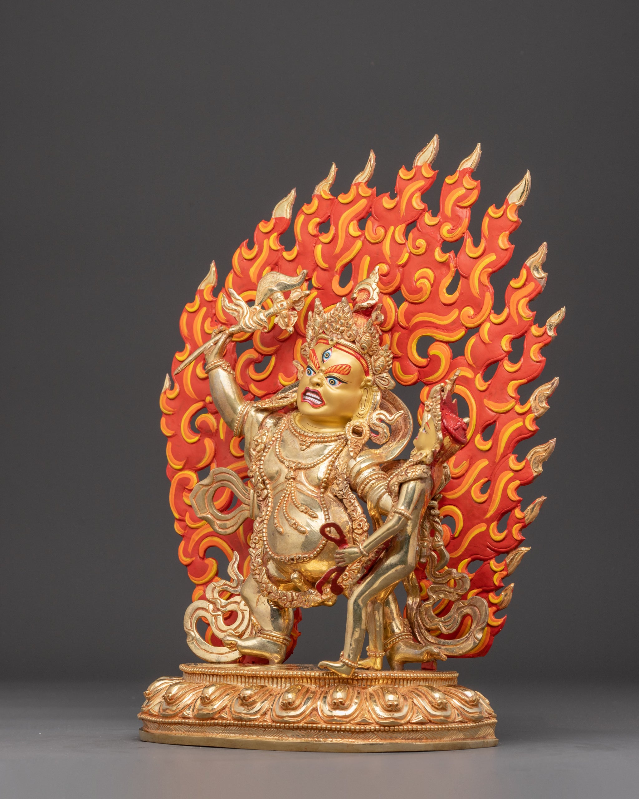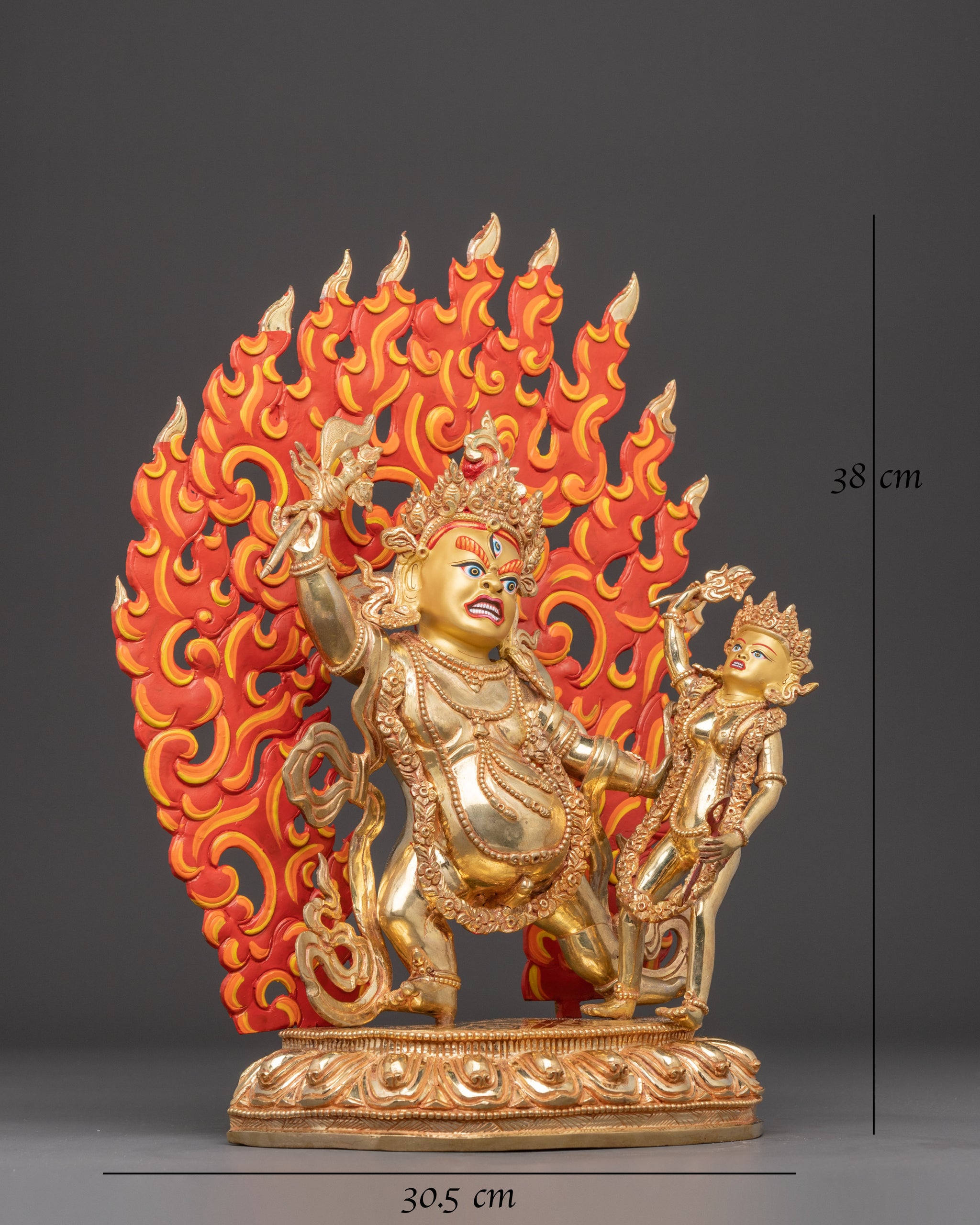 Bhairava, the fierce manifestation of divine energy, is depicted with three eyes, symbolizing his omniscient vision of past, present, and future. His right hand holds an axe, representing the destruction of ignorance and evil forces. With his left hand, he embraces Shakti, his divine consort, signifying the union of wisdom and compassion, or the balance of masculine and feminine energies. Both stand upon a lotus base, representing spiritual purity and enlightenment. A halo surrounds their heads, denoting divine power and radiance, while their crowns signify supreme authority and transcendence.