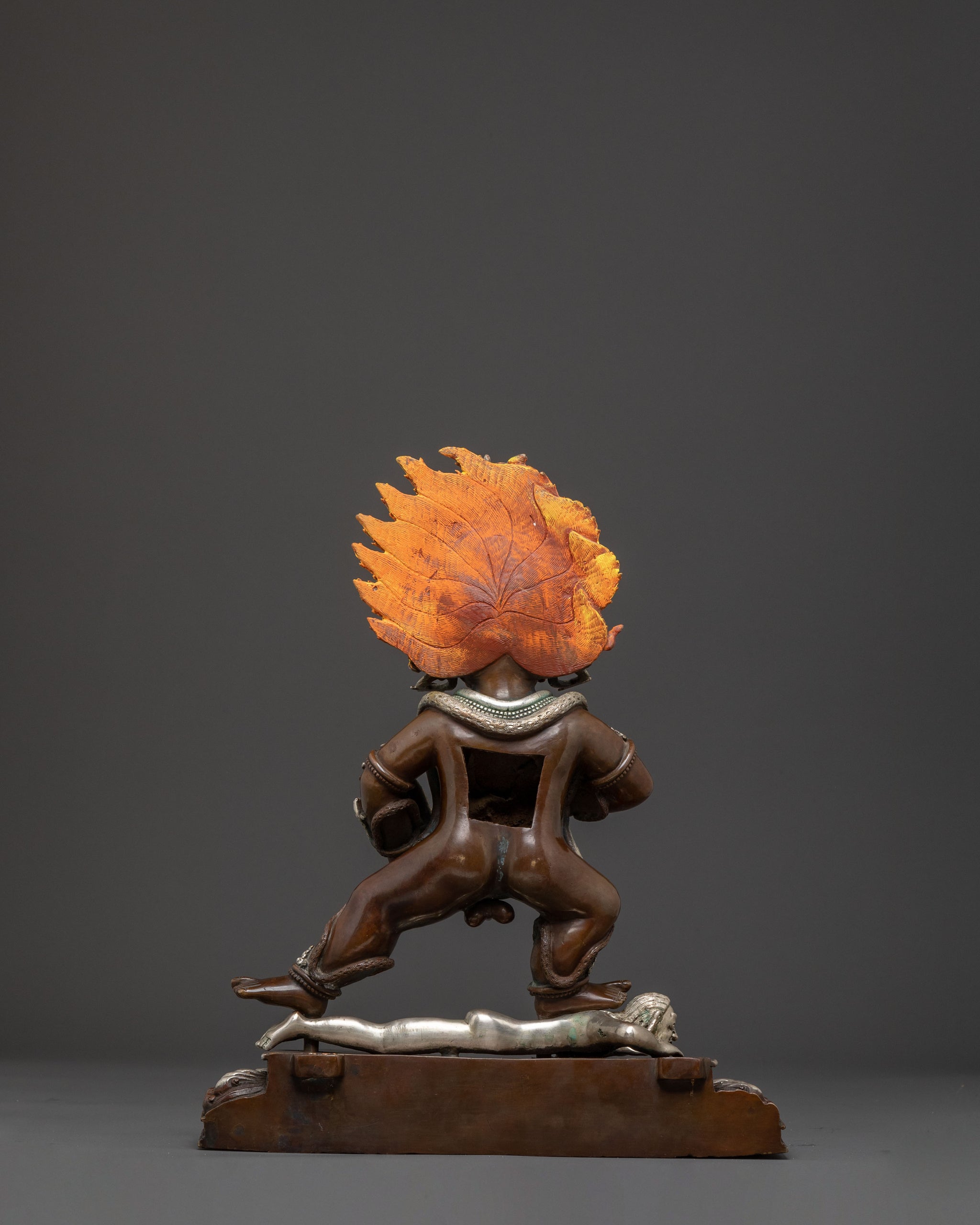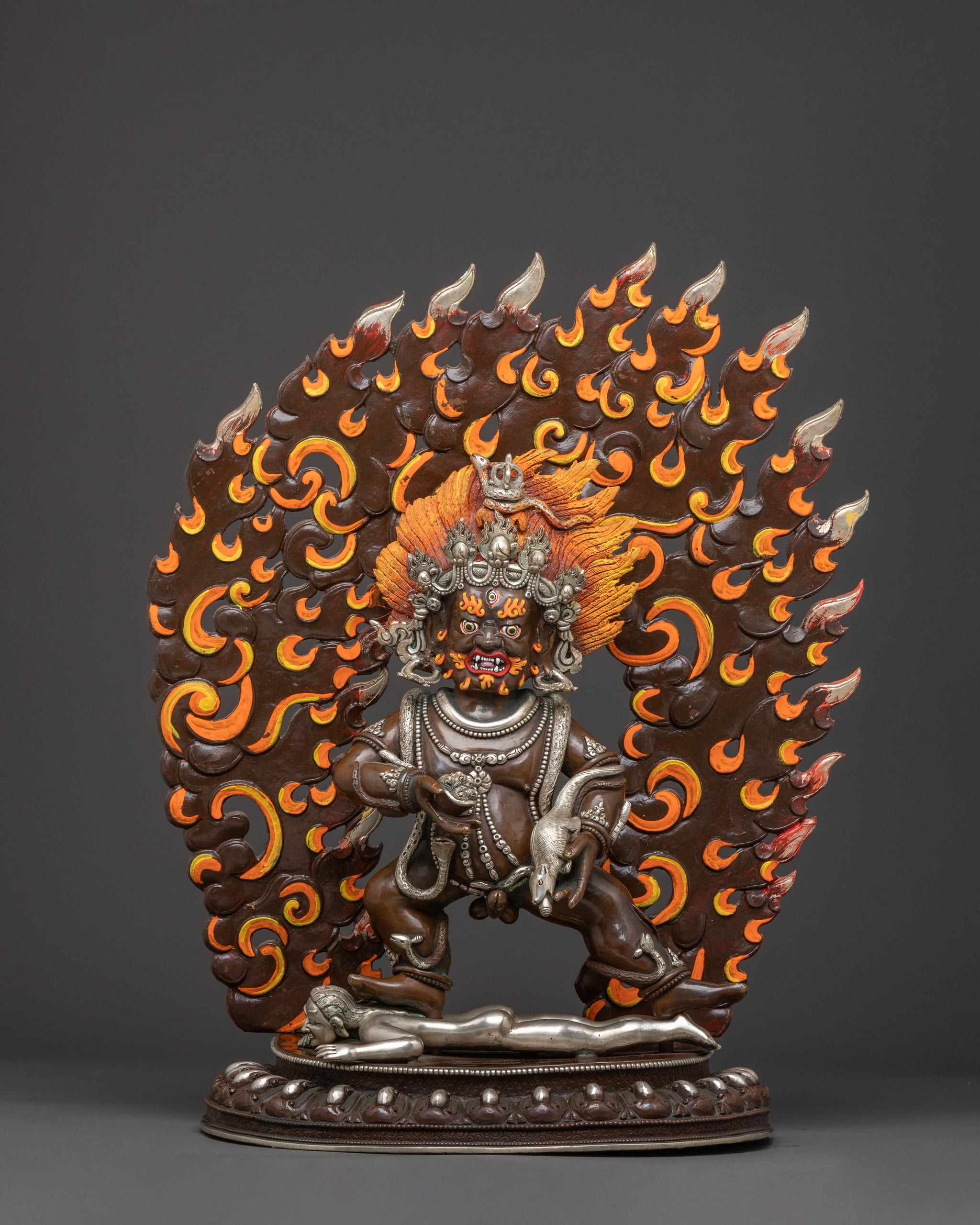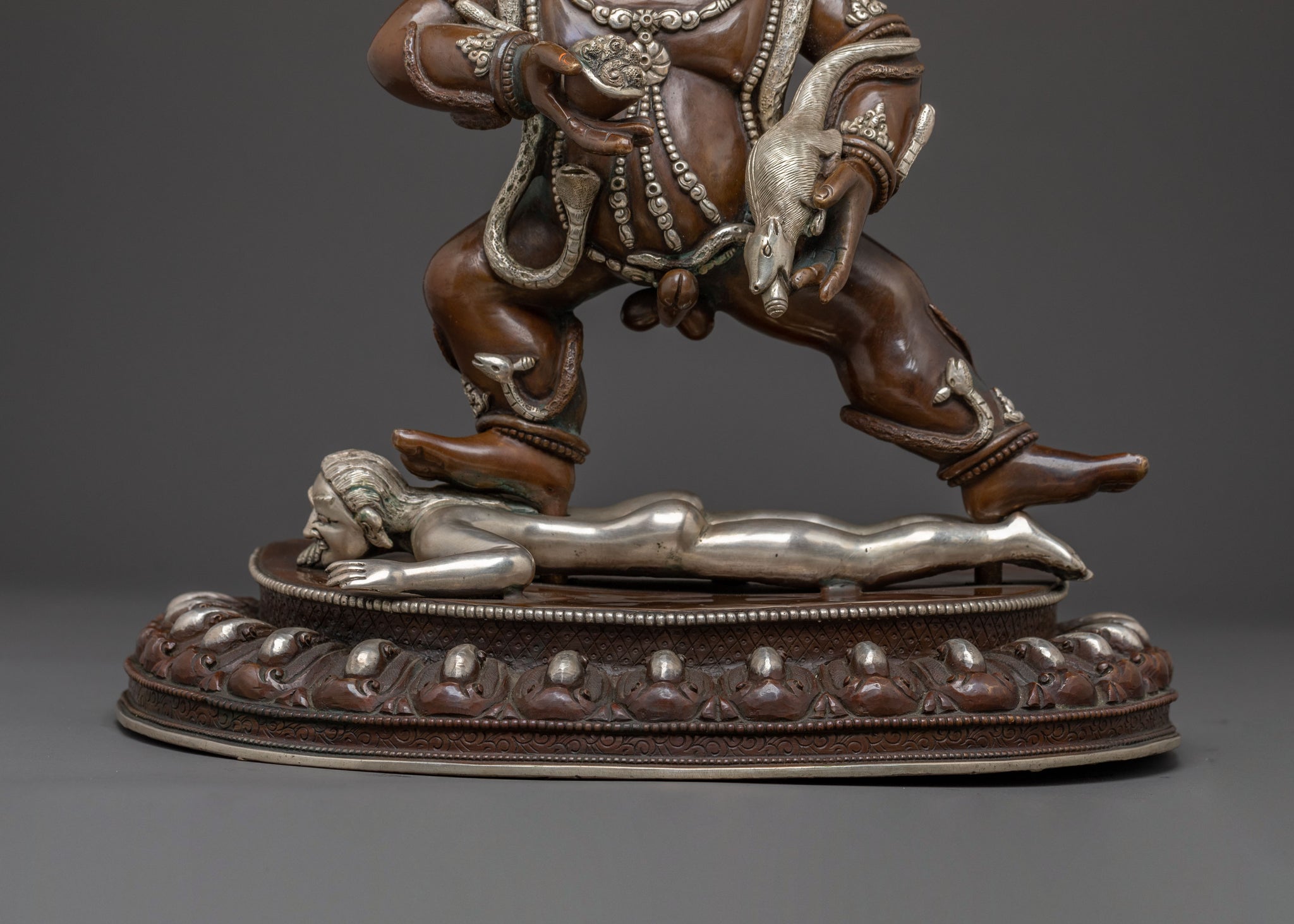 This Black Dzambhala handcrafted statue stands at 20.08 inches (51cm) in height with a base measuring 16.14 inches (41cm) and weighs 8.85 kg. Crafted from an oxidised copper body and enhanced with silver electroplating and acrylic paintings, this piece reflects refined Himalayan metal artistry. Handcrafted in Nepal by skilled artisans, it is well-suited for personal altars, shrines, meditation spaces, or spiritual décor collections.
