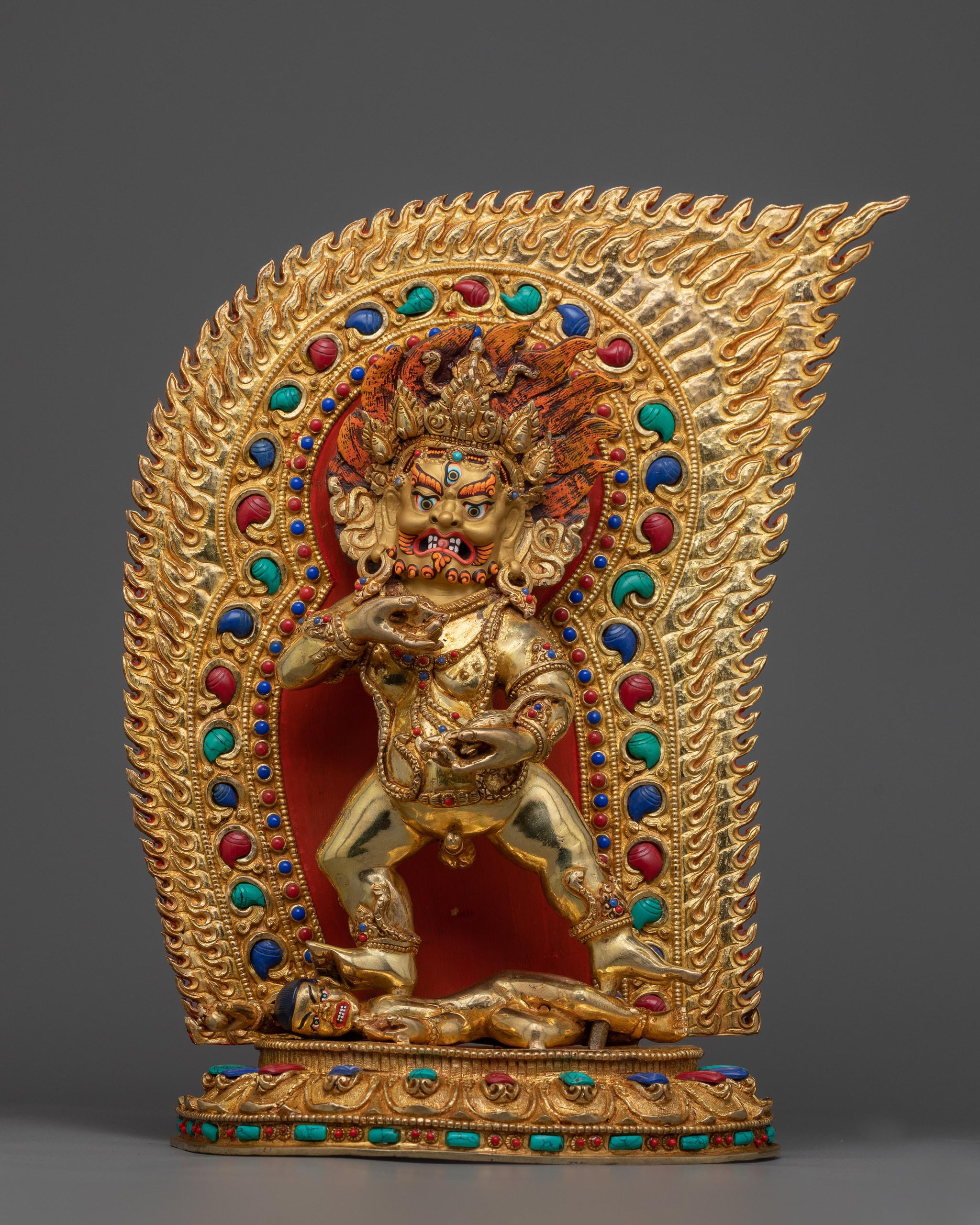 Every detail of this magnificent statue demonstrates superb craftsmanship. Its strong copper body serves as a canvas for the brilliance of 24K gold gilding and acrylic paintings that grace its exterior. But what actually distinguishes this piece are the painstaking hand-carved gemstones that adorn its design, adding depth and character to an already magnificent piece.
