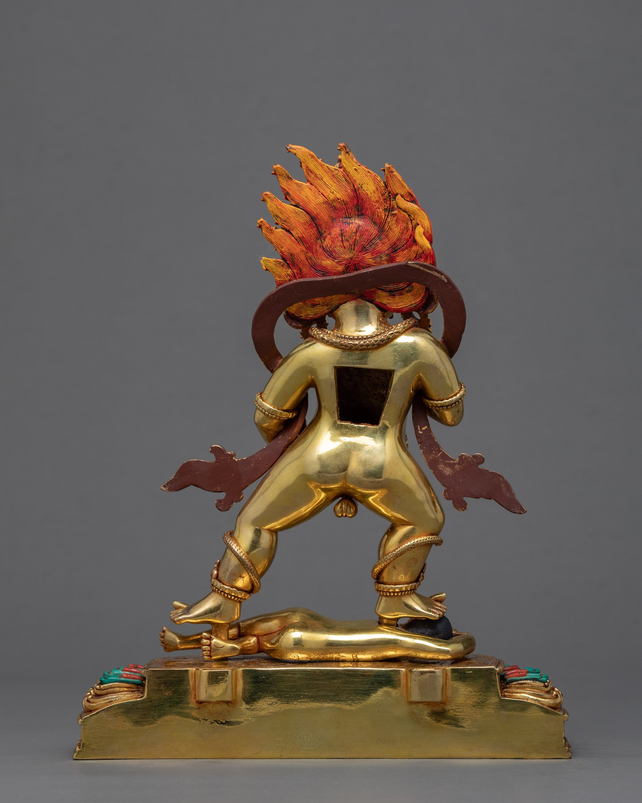 We have sculpted this Black Dzambhala sculpture, one of the five wealth deities in a traditional Himalayan Art. He is depicted standing on atop a sun disc lotus seat with a wrathful expression. Deity is encircled by the fire flame that is engulfing his presence. Artist of Kathmandu valley has originally hand carved this statue in a copper body and gilded it with genuine gold. The design of lotus seat, magnificent crown and the jewels are exquisitely embellished with precious gemstone and painted with acrylic paintings.