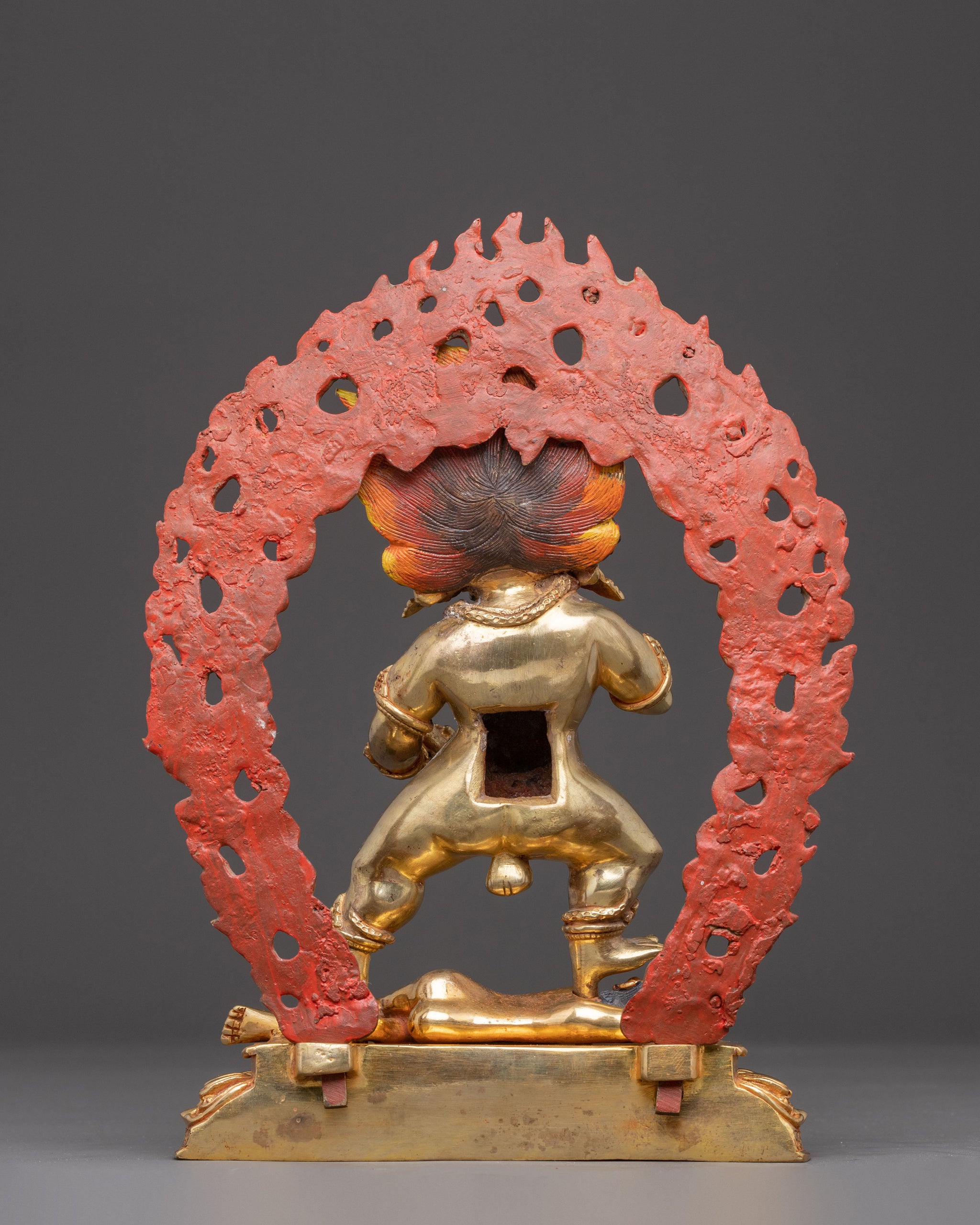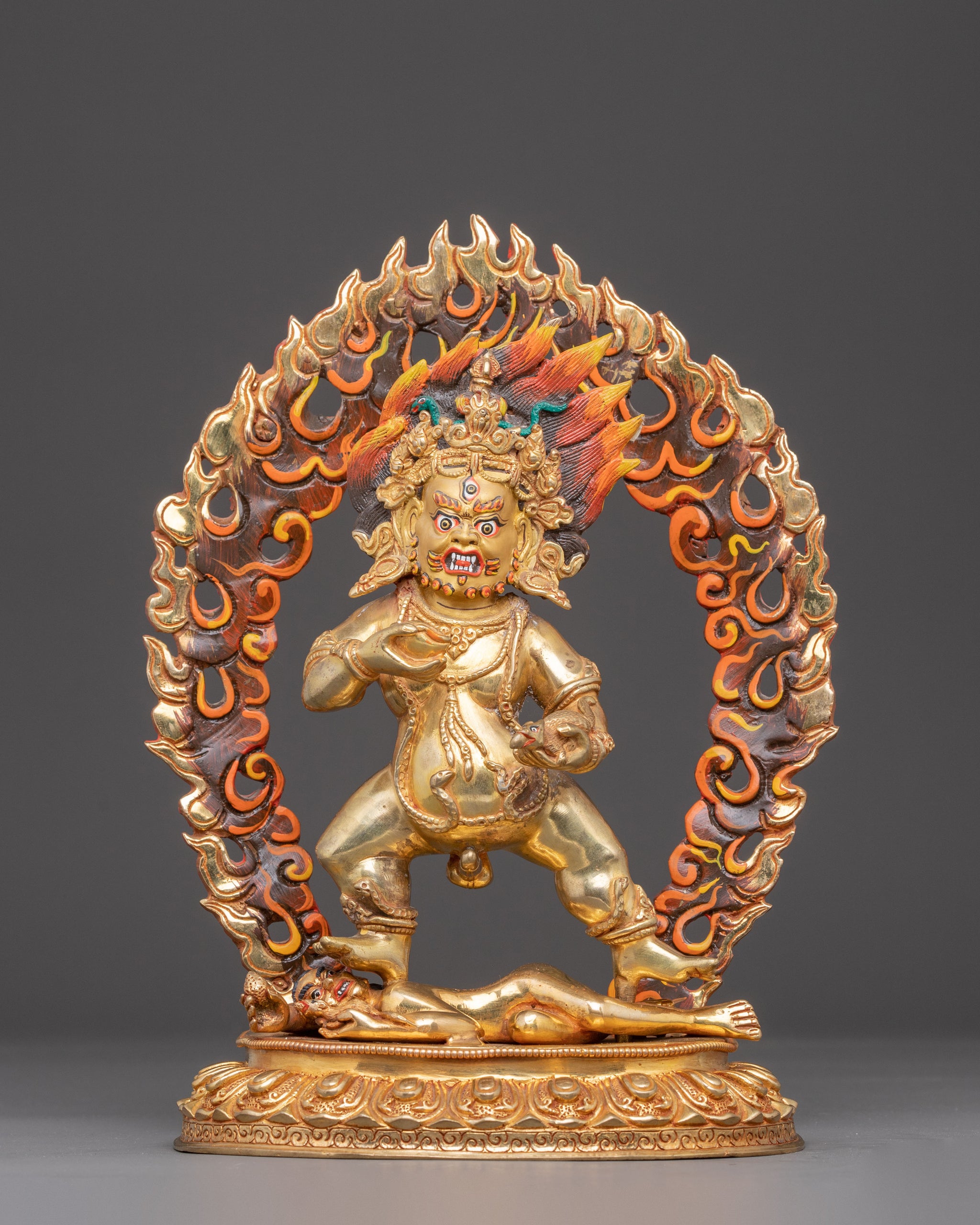 Black Dzambhala is depicted sitting on a lotus base, holding a mongoose in his left arm, which spits jewels, representing the endless flow of riches. His right hand holds a citron fruit, symbolizing fulfillment and spiritual prosperity. His wrathful expression reflects his power to overcome obstacles and protect practitioners from poverty. This statue serves as a strong reminder of the blessings of wealth and spiritual protection, making it a prized possession for those seeking abundance and guidance on their journey.