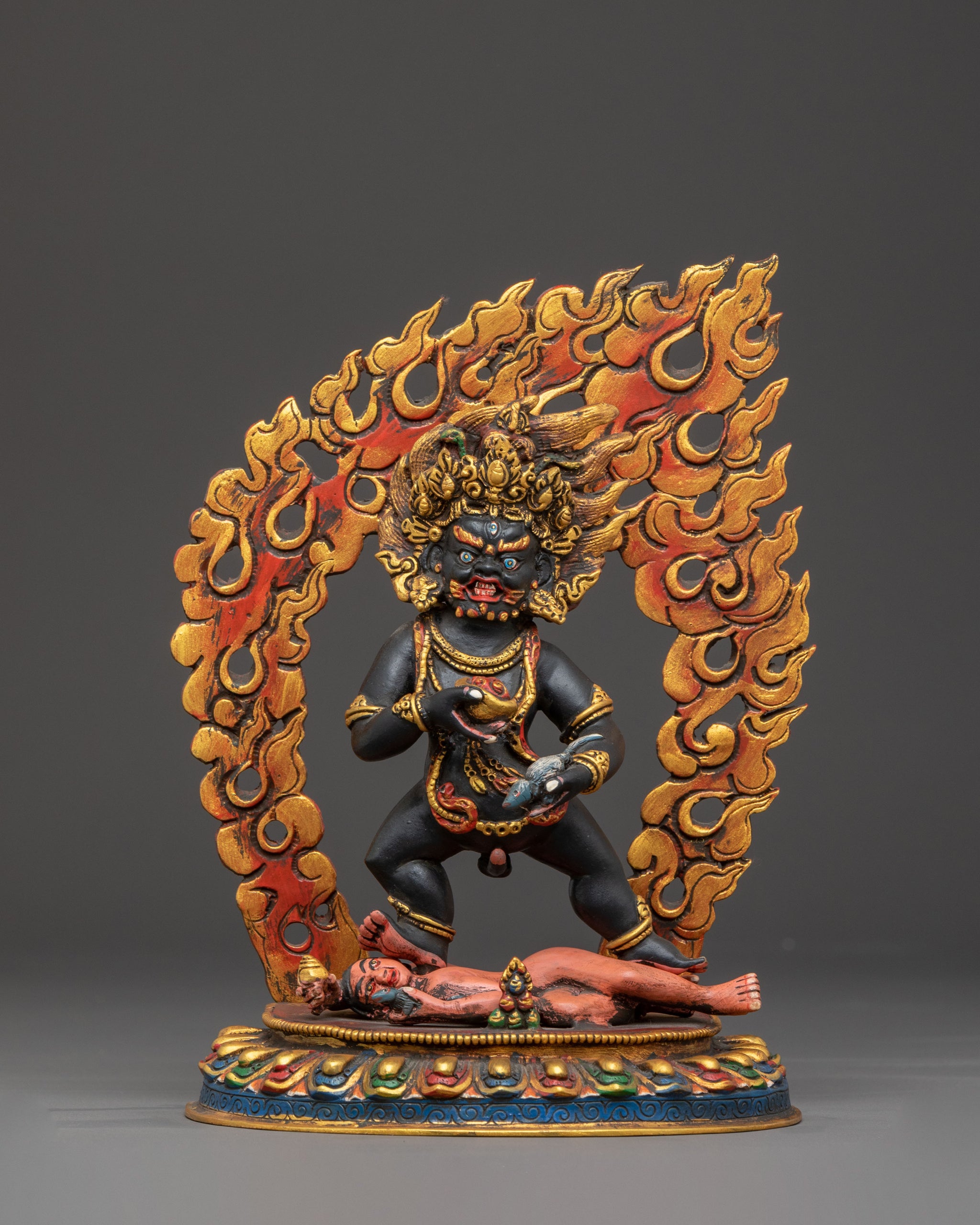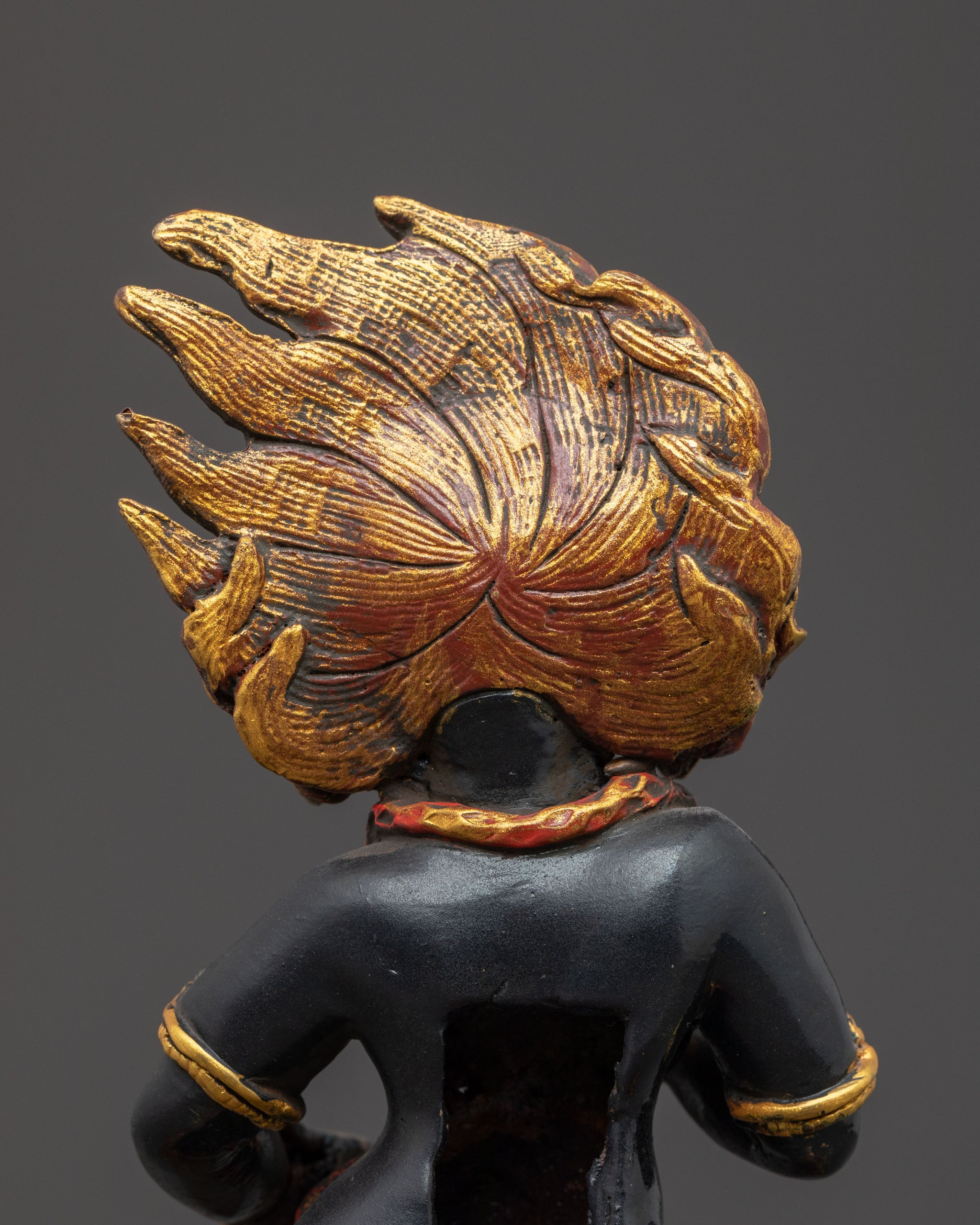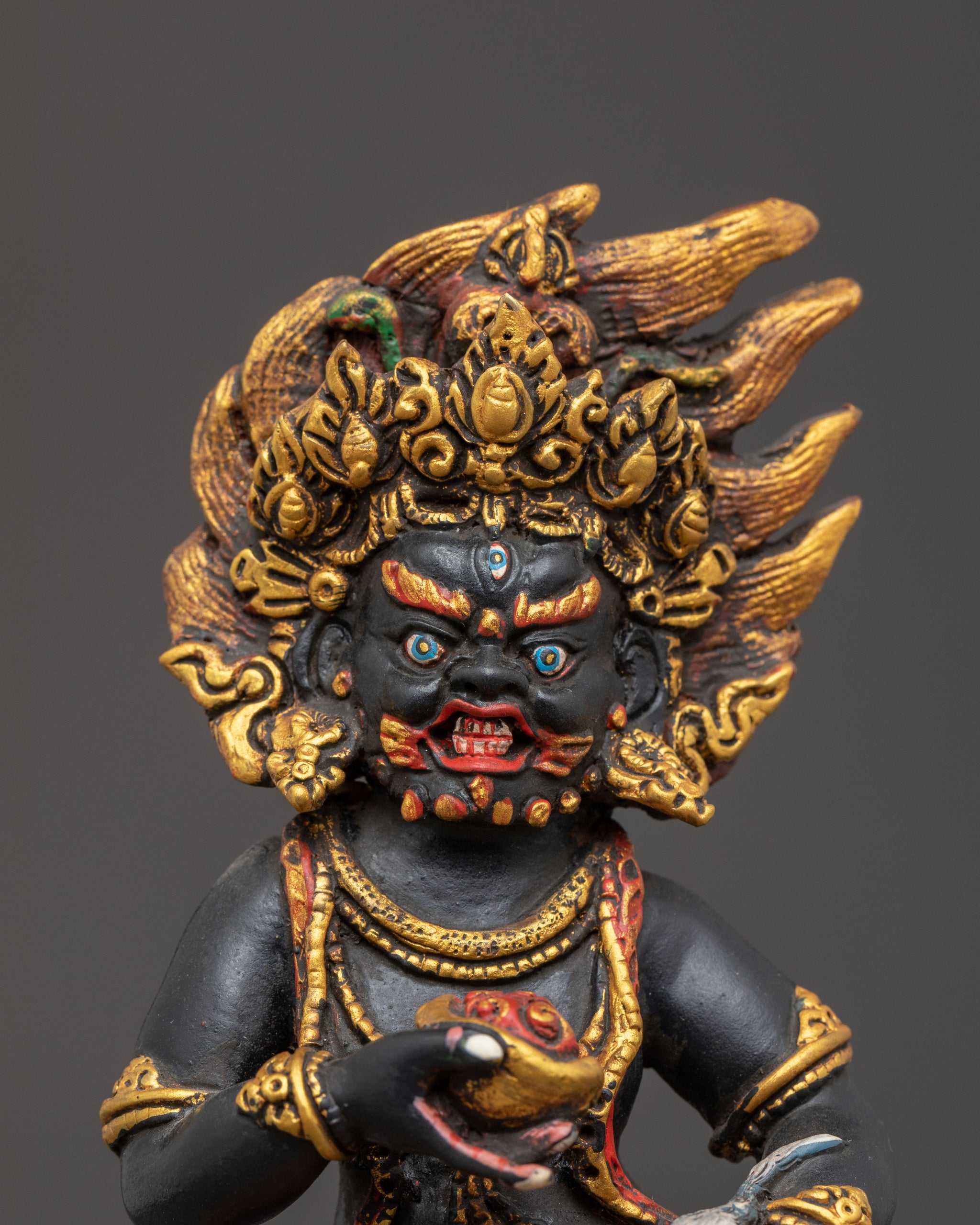 This striking Black Dzambhala Tibetan statue, handcrafted from copper, stands 23 cm (9”) tall on a 16.5 cm (6.5”) base and weighs 1.53 kg. Hand-finished with vibrant acrylic paintings, it embodies benevolent prosperity and radiates a powerful, protective presence. Meticulously crafted by Nepali artisans, every detail—from the elaborate crown to the dynamic seated pose—reflects authentic Himalayan craftsmanship, making it a profound addition to any sacred space or meditation area.