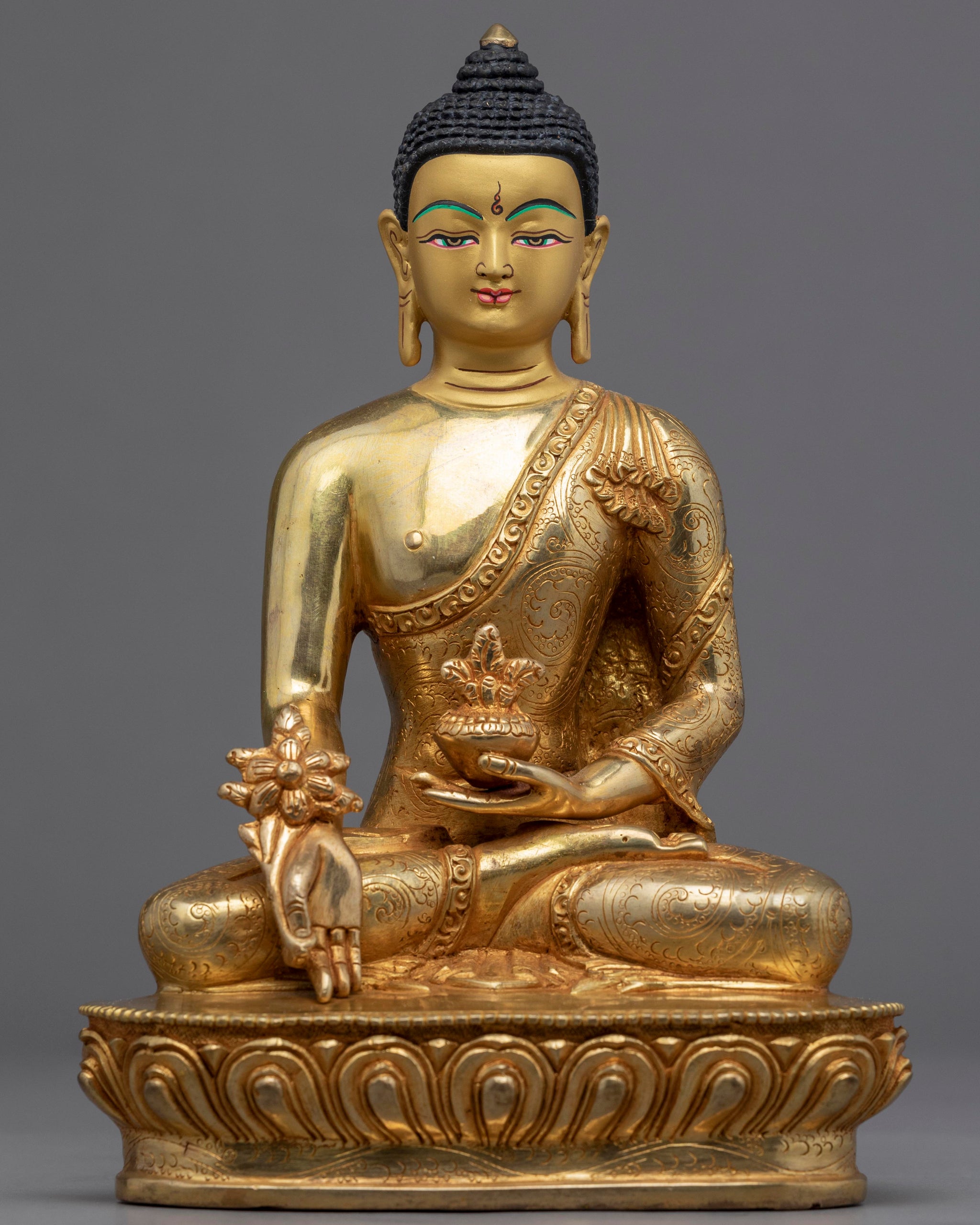 The Lapis Lazuli is often termed as Blue Medicine Buddha. Utilizing the skillset passed down for centuries, we have exclusively sculpted Blue Medicine Buddha Statue. The body of the medicine buddha is molded using copper, which is later gilded using genuine 24K gold. This gives the statue a lustrous shine. In the state, the deity is seated peacefully upon a moon disc lotus in a meditative posture as he holds an alms bowl containing the nectar of immortality with his left hand and a myrobalan plant with the other hand. This figurine will be a perfect gift from Nepal to a devotee like you that will aid you in your practices and regular activities such as meditation and yoga.