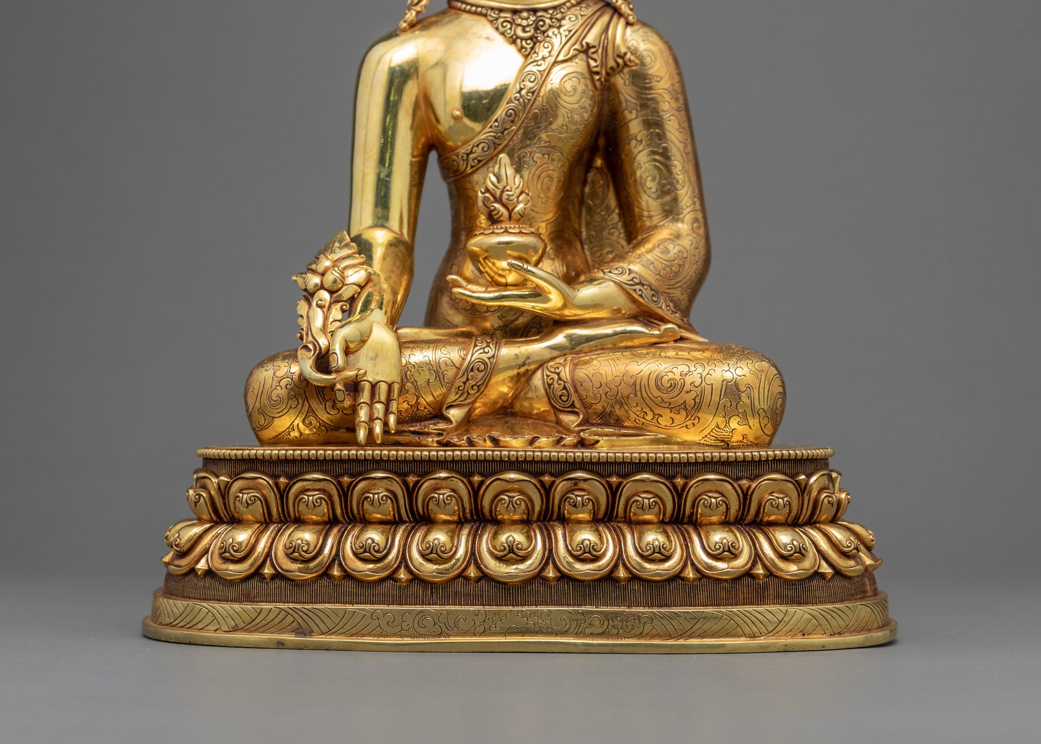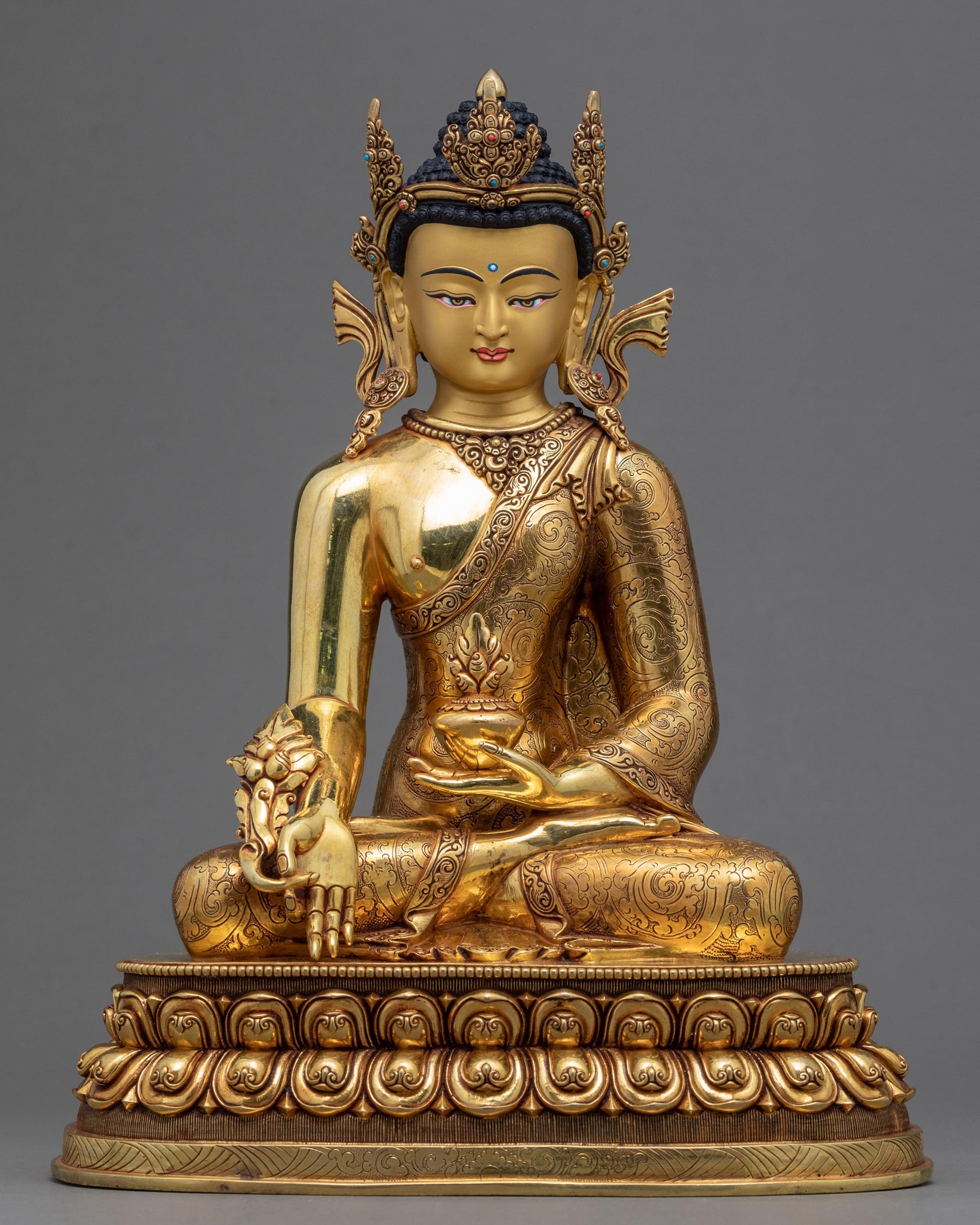 The art of Blue Medicine Buddha statue is traditionally hand-carved in a copper body and gilded with genuine 24k gold. Usually, the Buddhist deities are depicted sitting on a moon disc lotus seat for meditation purposes. Likewise, this sculpture will be immensely helpful and valuable for yoga activities or indoor meditation practice for a meditation practitioner like you. The materials used in this Himalayan art are exquisitely adorable and of high quality. Gold is used for gilding and plating the entire statue, while precious embellishments and jewels adorn the face, robe, crown and lotus seat.