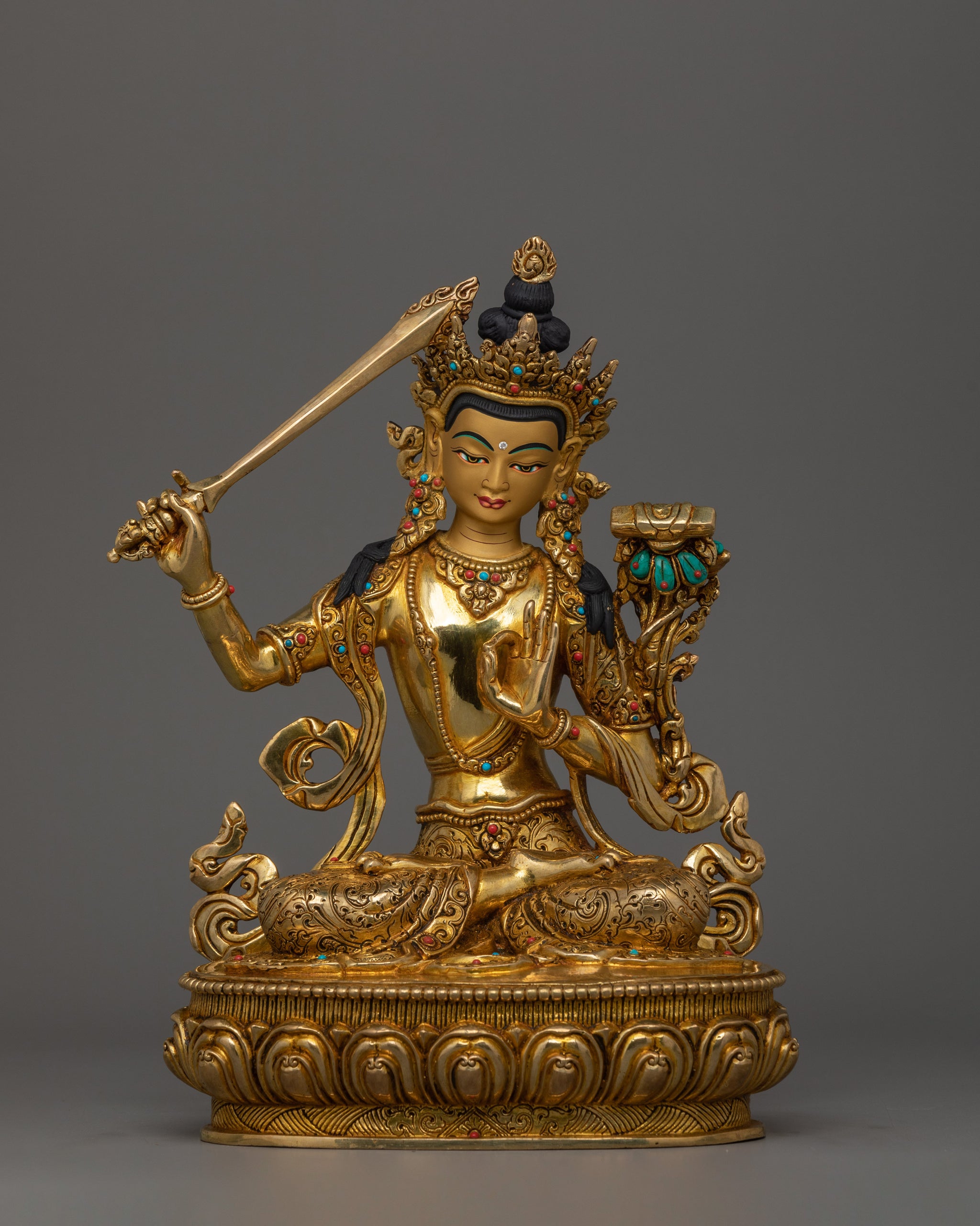 The Bodhisattva Deity of Wisdom Manjushri statue stands at 10.6”/27 cm in height with a 7.7”/19.5 cm base and weighs 3.24 kg. This statue represents Manjushri, the Bodhisattva of Wisdom, who embodies insight, knowledge, and the ability to cut through ignorance. The figure is made of copper, covered with a triple layer of 24K gold gilding, and carved with deeply engraved carvings that produce a magnificent 3D-like effect. This sculpture handcrafted by expert Nepalese artisans, elegantly symbolizes Himalayan Buddhism's sacred traditions, making it an appropriate addition to altars, meditation places, or sacred collections.