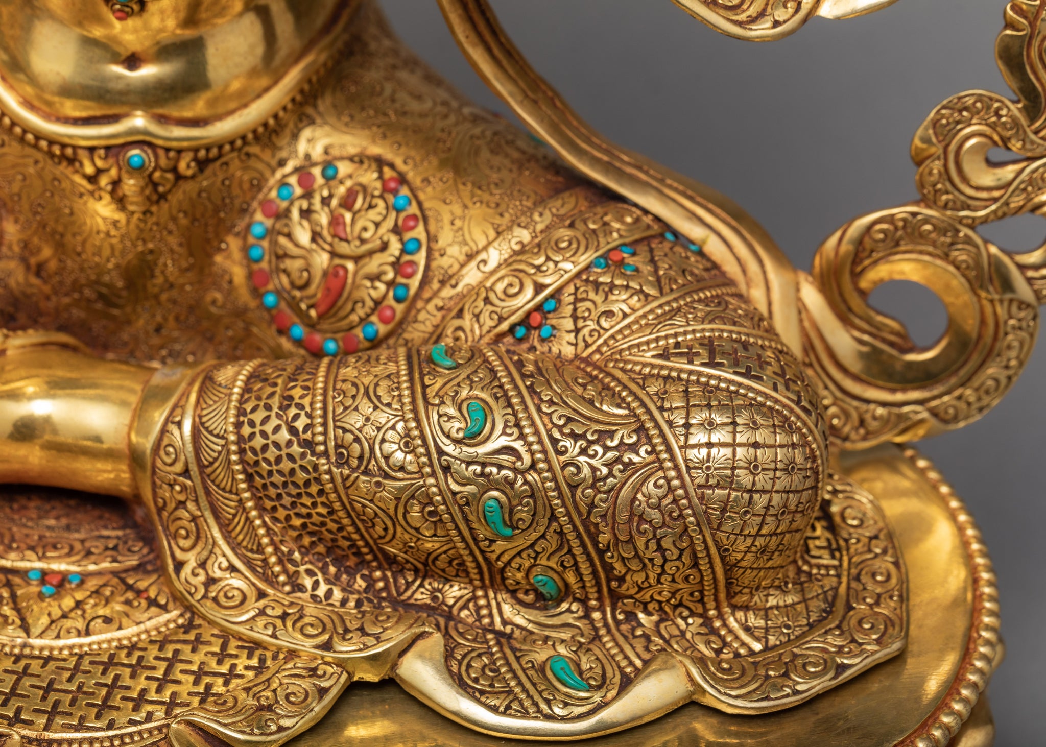 This Green Tara Statue comprises copper, embedded precious corals, and turquoise and gilded with gold. It is one of the principal deities who deals with us confused and distracted beings, bringing us back to the original state. Following Tara's thangka practice, we develop strong feelings of joy, happiness, and closeness. Especially in the form of the Green Tara, Sengdeng Nagchi Drölma, she liberates sentient beings from the eight great fears.