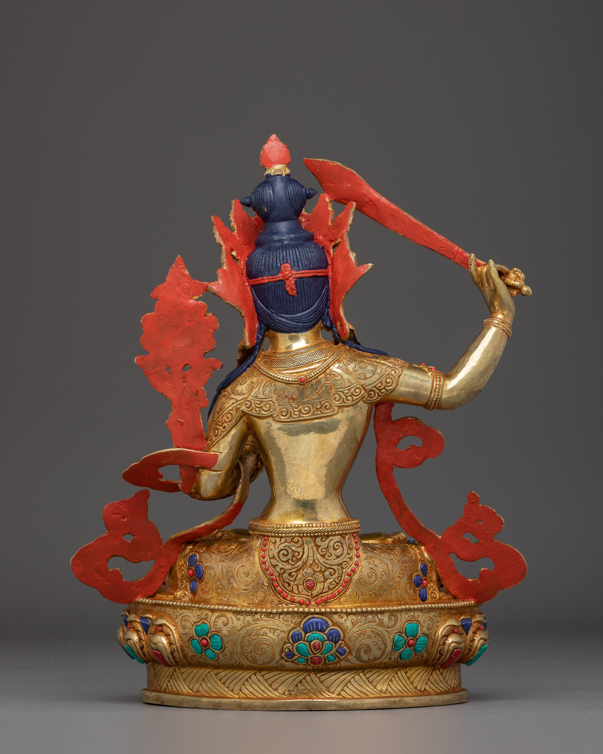 Manjushri is depicted seated in the lotus posture (padmasana), embodying serene wisdom. In his right hand, he holds a flaming sword symbolizing the cutting of ignorance, while his left hand performs the vitarka mudra, holding a lotus flower that supports the Prajñāpāramitā Sutra on top. A swirling scarf gracefully adorns him, enhancing the statue’s elegant and contemplative presence.
