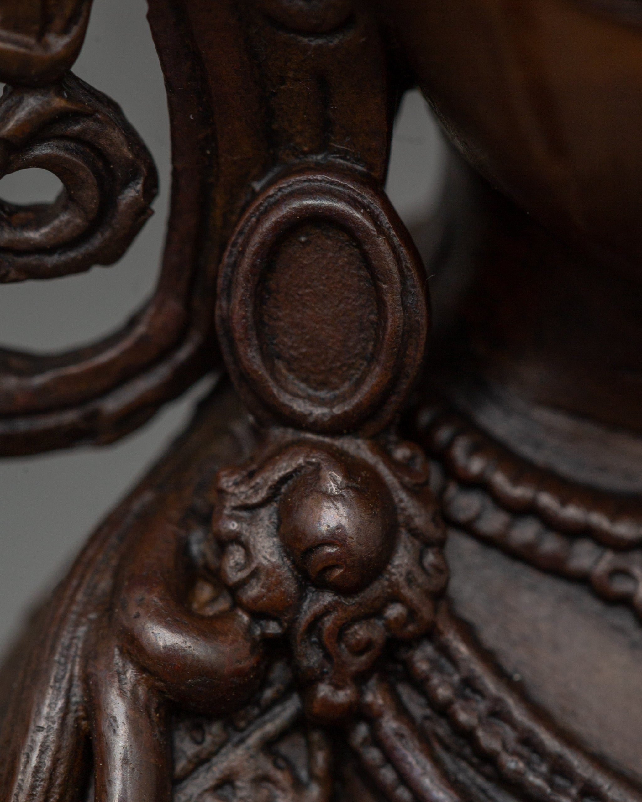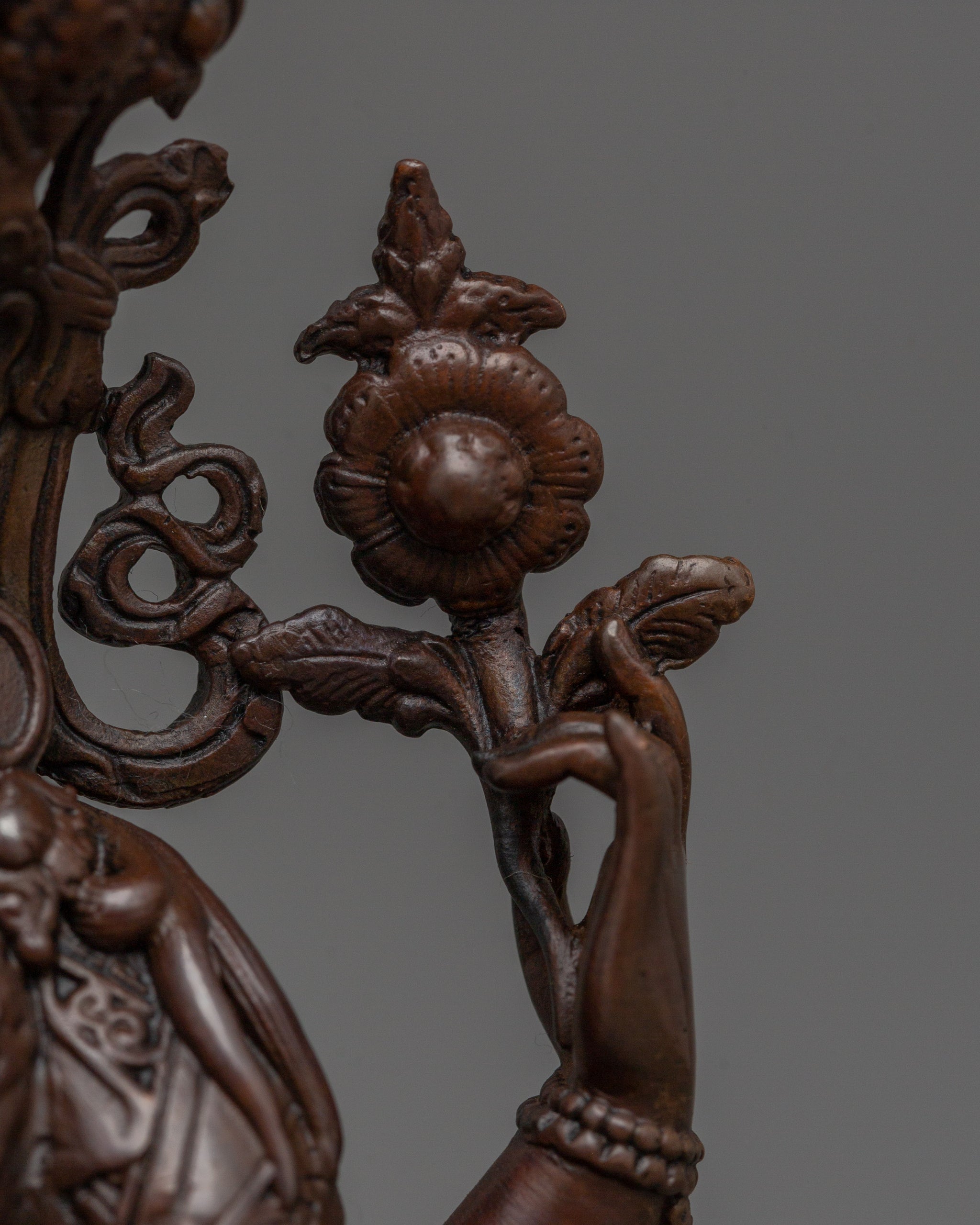 Vajrayogini is stunning. The details are amazing. It's easy to make out her facial expressions, skulls, feet, and the ring of fire around her. You can tell she's handmade. There is a consecration hole in her back.
