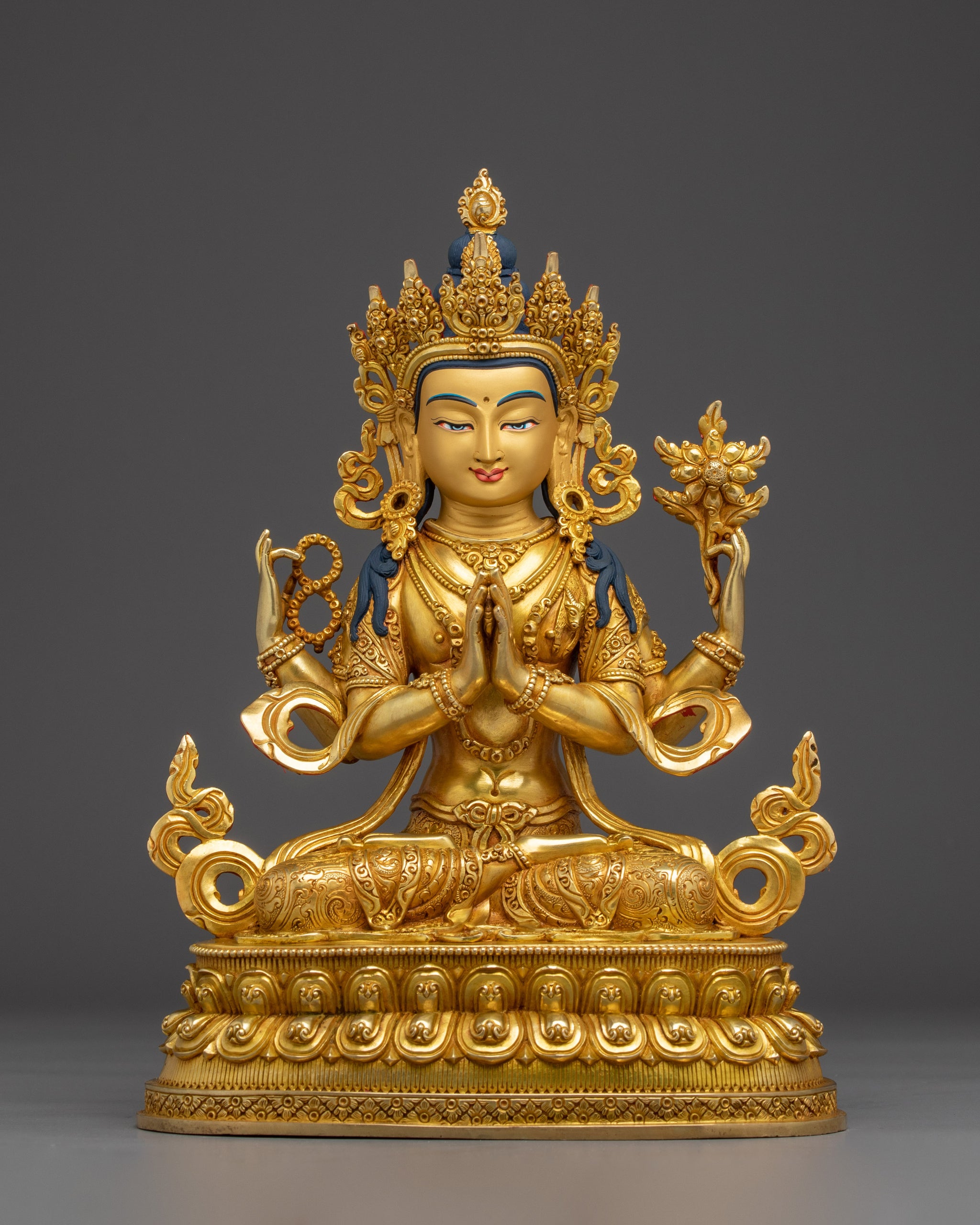The Bodhisattva of Compassion, Chenrezig Figurine, stands at 13.4” (34 cm) in height, with a base width of 9.8” (25 cm), and weighs 3.97 kg. It is made of copper, covered with a triple layer of 24K gold gilding, and carved with deeply engraved carvings that produce a magnificent 3D-like effect. The surface is enhanced with gold and acrylic paintings, reflecting both sacred artistry and traditional craftsmanship. This piece offers a spiritually enriching presence for any altar or meaningful collection.