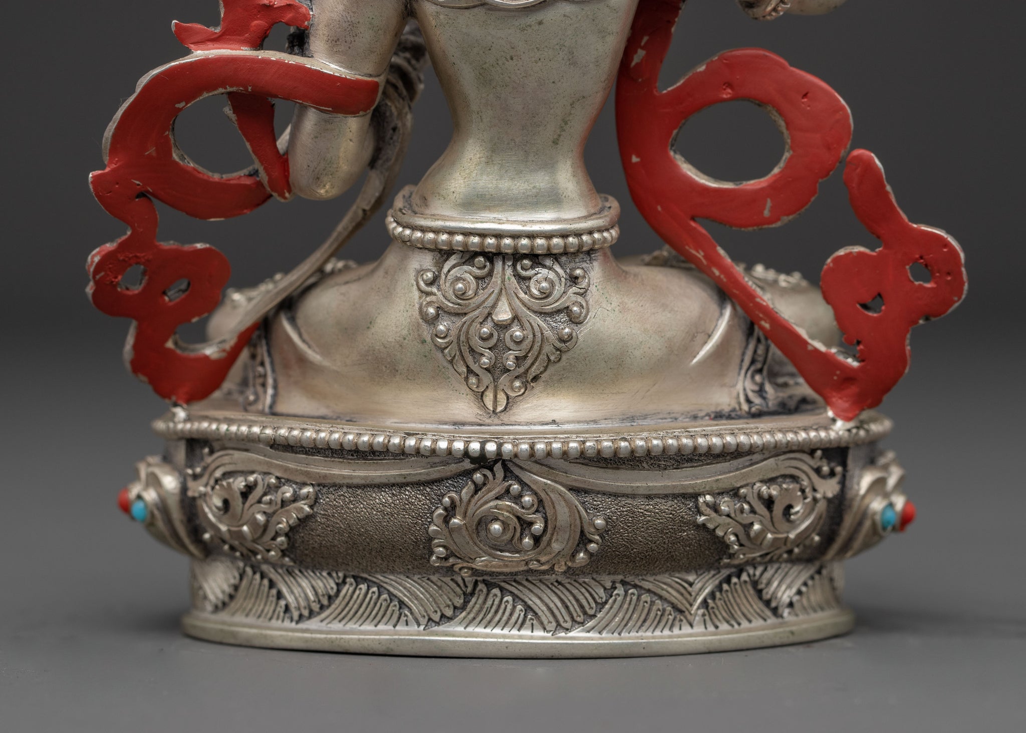 This Bodhisattva of Wisdom Manjushri Handmade Statue measures 5.7”/14.5cm in height and 4.7”/12cm at the base, weighing 0.55 kg. Crafted from a copper body with silver plating and enhanced with gold and acrylic paintings, this finely detailed statue is expertly made by skilled Nepali artisans. Its refined craftsmanship makes it ideal for altars, meditation spaces, or as a meaningful decor piece for those seeking wisdom and spiritual inspiration.
