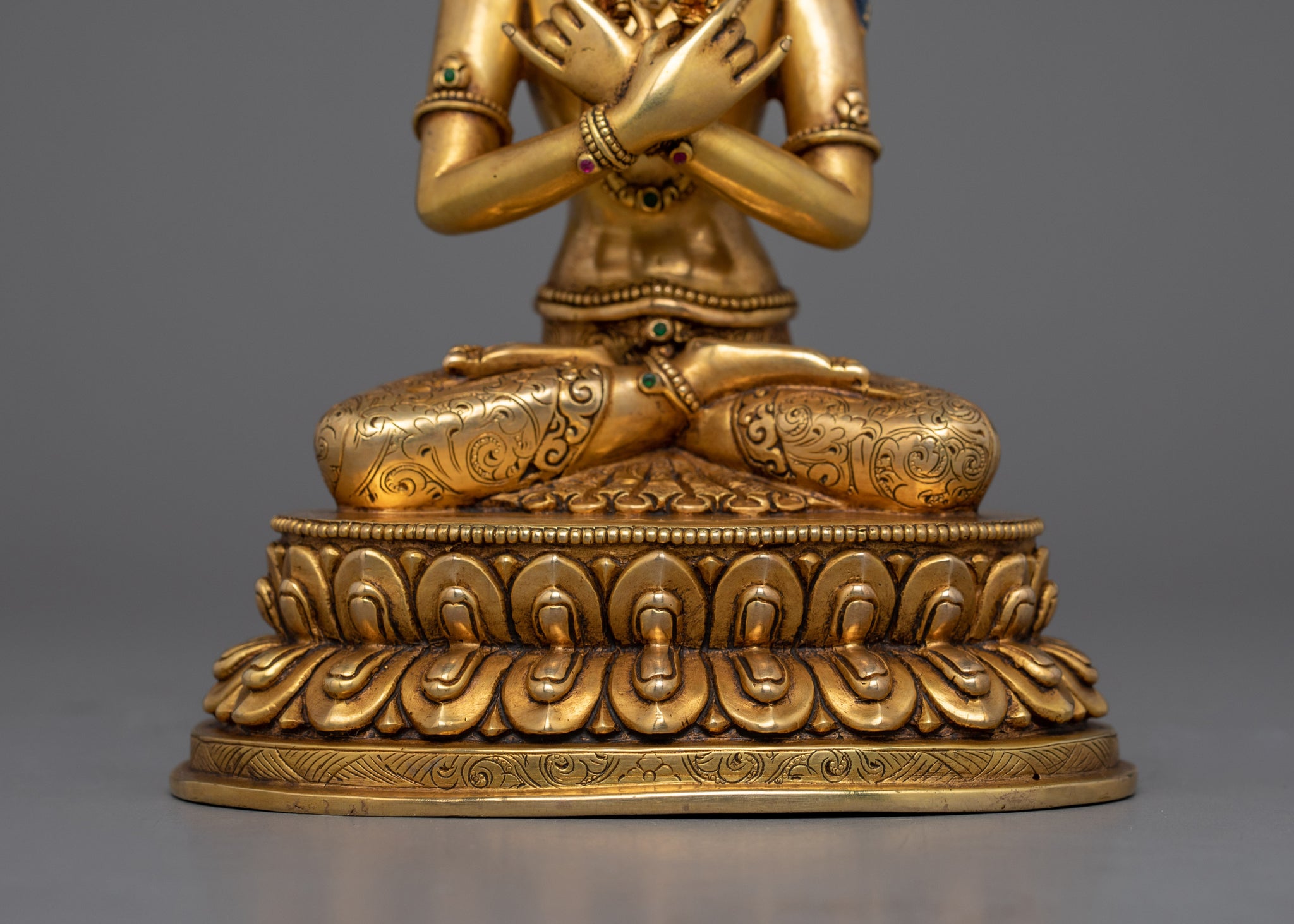 This Bodhisattva Vajradhara Statue is the Primordial Buddha, symbolizing ultimate wisdom and enlightenment. This statue is beautifully handcrafted by skilled Nepali artisans in Patan, Nepal. The statue is fully gilded in 24K gold, giving it a bright look. The crown shows the hard work and skill of the Nepali artists. This statue is 7.9 inches (20 cm) tall with a base of 5.1 inches (13 cm). Crafted by expert Nepalese artisans, this sacred item embodies the rich traditions of Himalayan Buddhism, making it an important addition to altars, meditation areas, or sacred collections.
