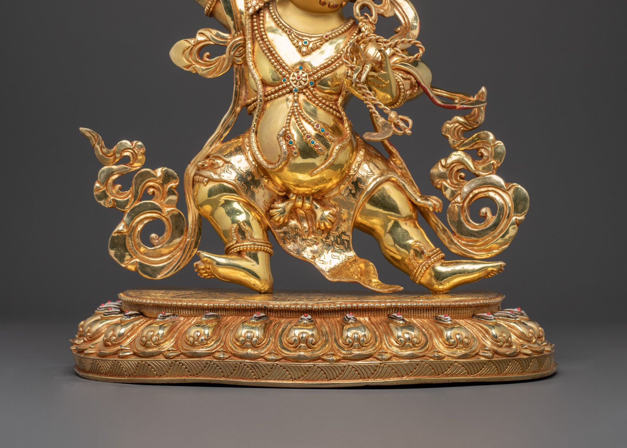 From the ancient lineage of artisans, the bodhisattva Vajrapani's sacred golden statue emerges, a powerful embodiment of enlightened energy and protective dynamism. Standing at an impressive 47.5 cm (18.7 inches), this masterwork captures Vajrapani's fierce yet compassionate presence, ready to dispel obstacles. Covered with a triple layer of 24K gold gilding, its radiant surface illuminates every intricate detail. The statue is carved with deeply engraved carvings that produce a magnificent 3D-like effect, enhancing its dynamic presence. This sculpture radiates unwavering resolve and serves as a powerful symbol of spiritual courage, offering a profound focal point for any spiritual space.