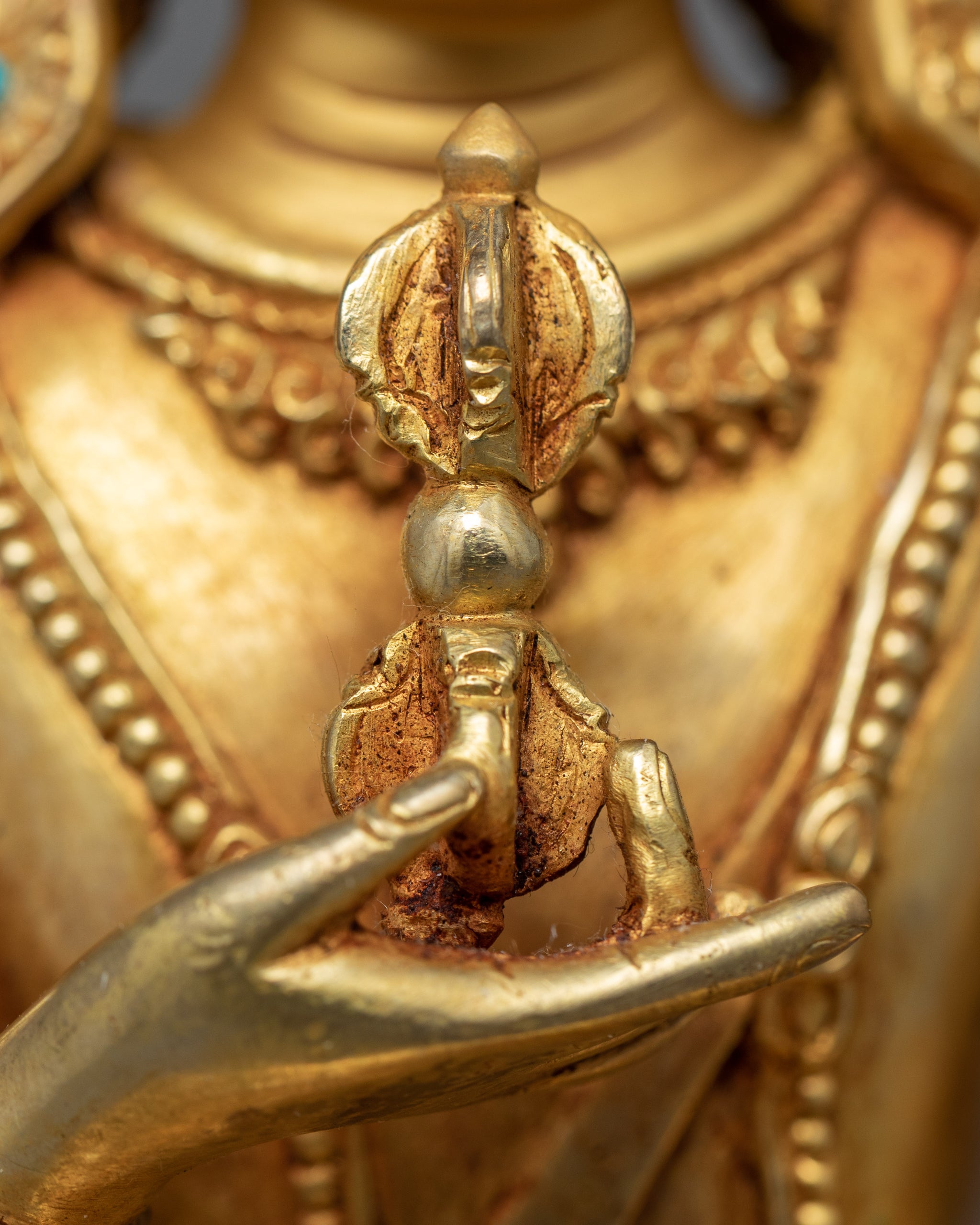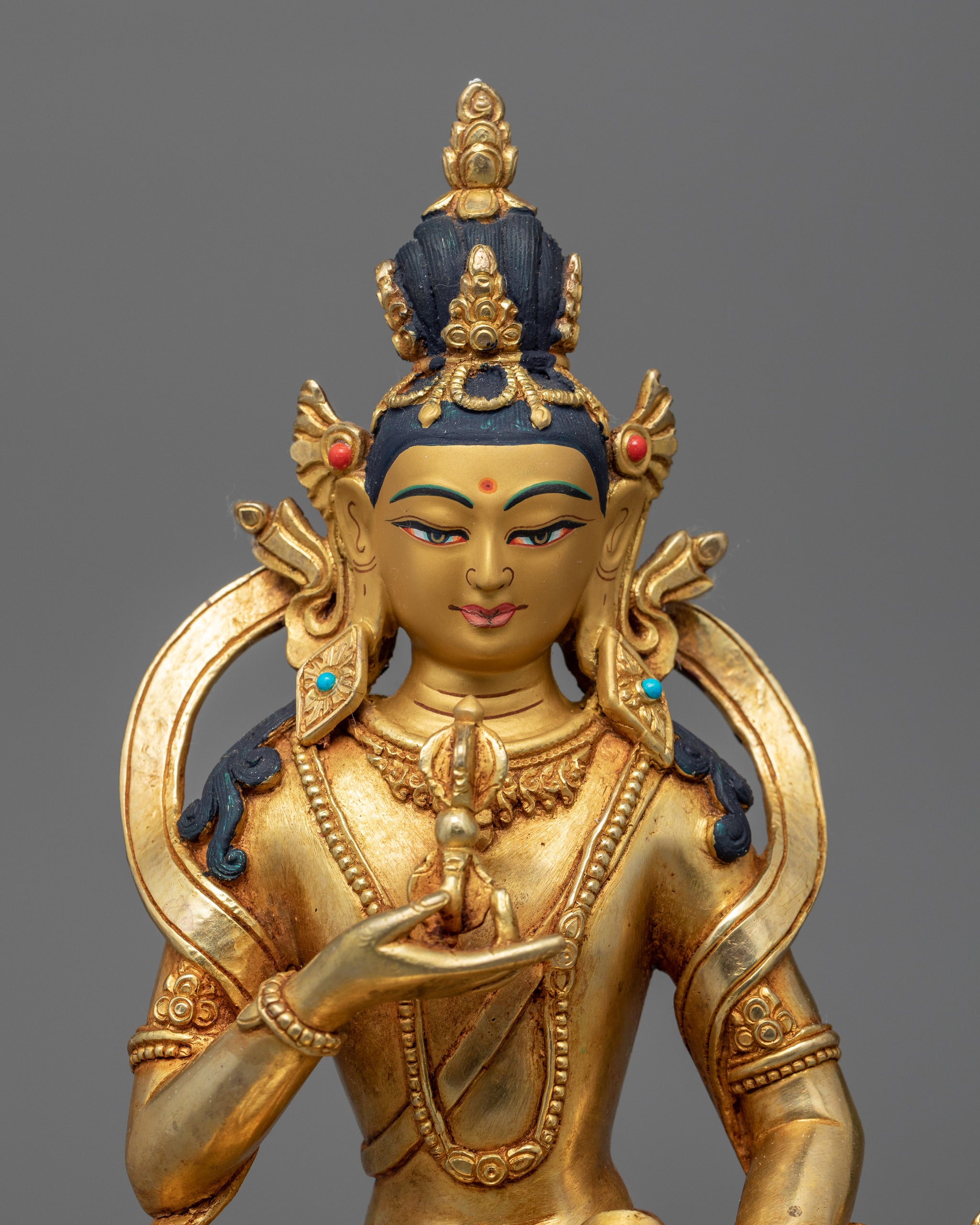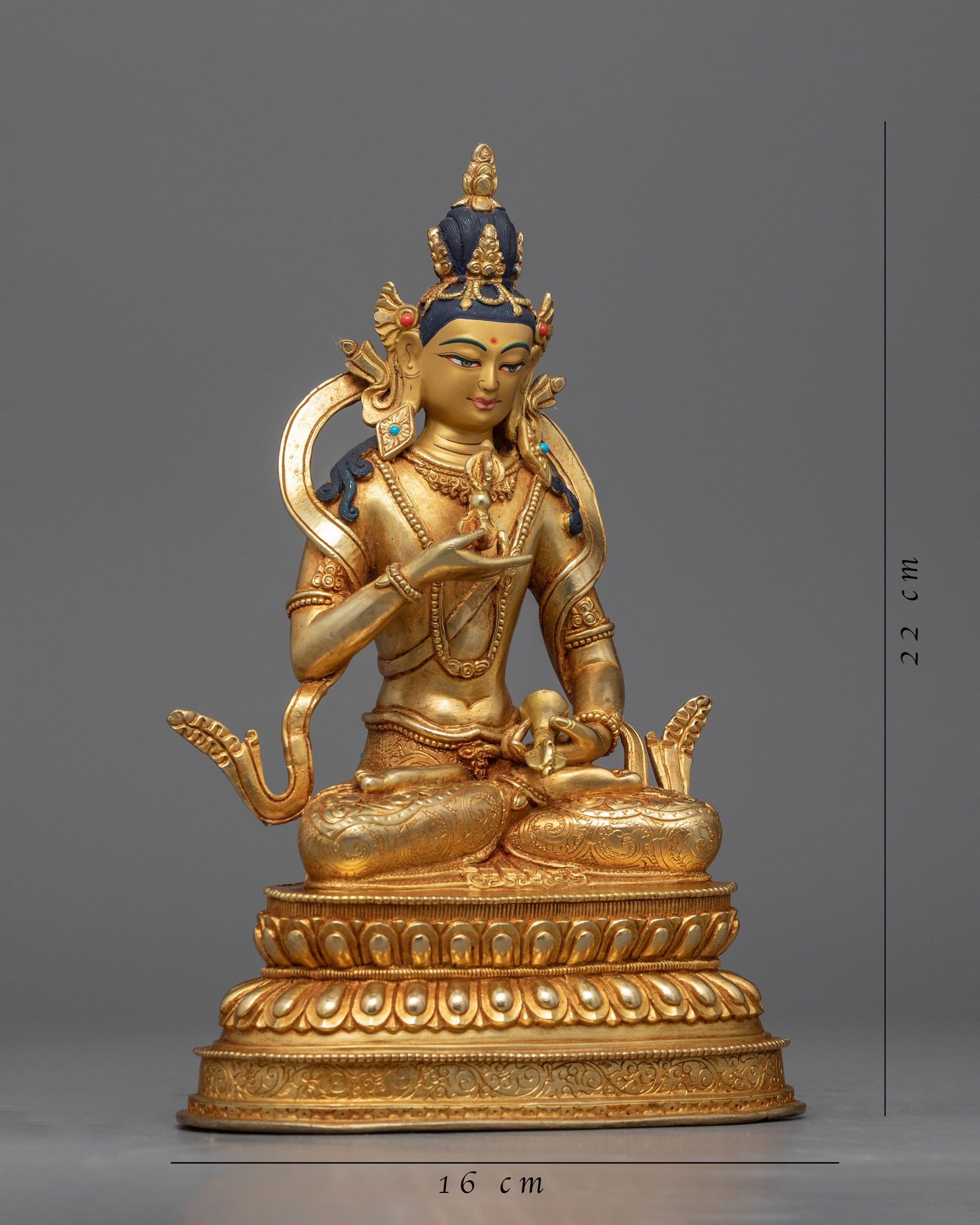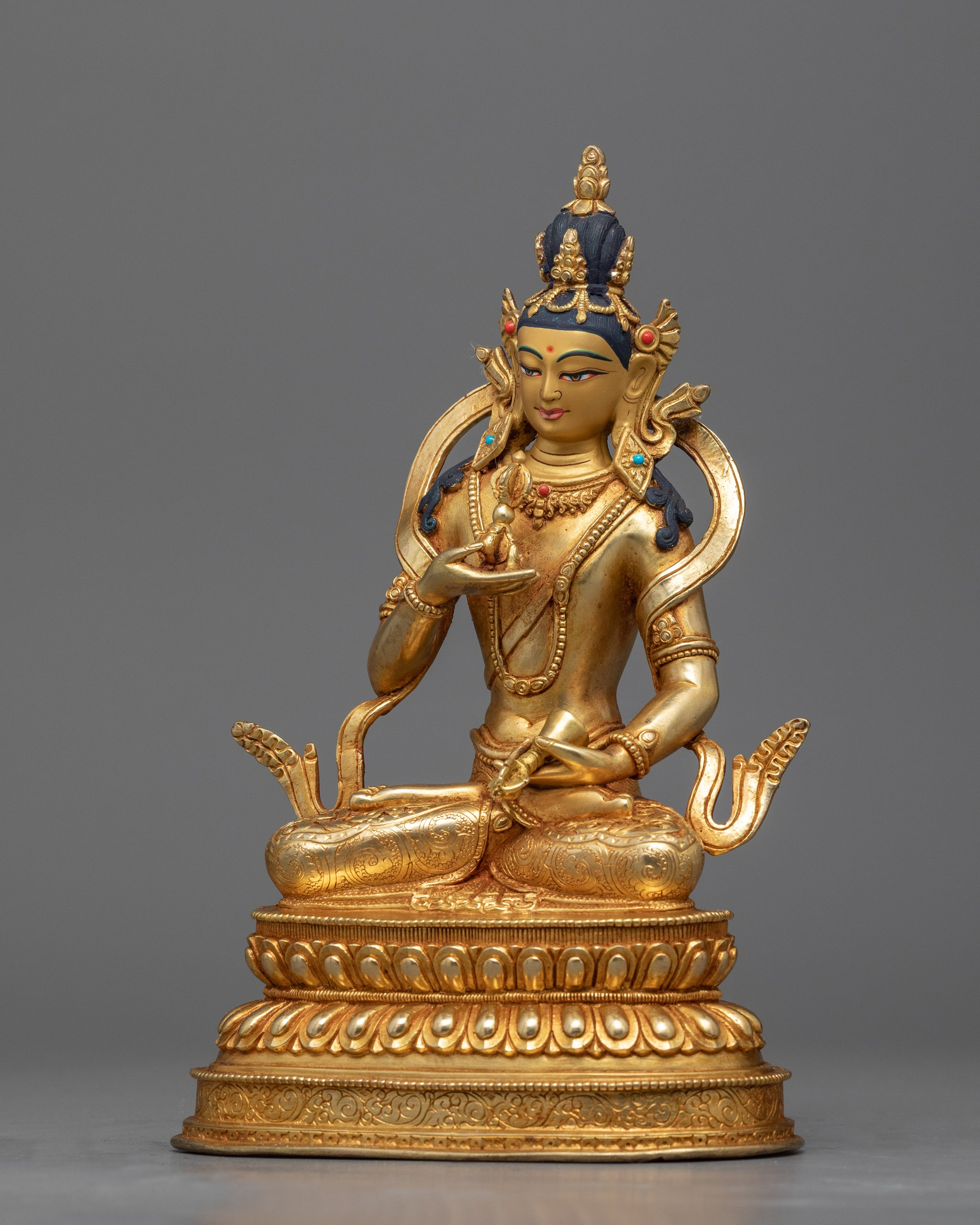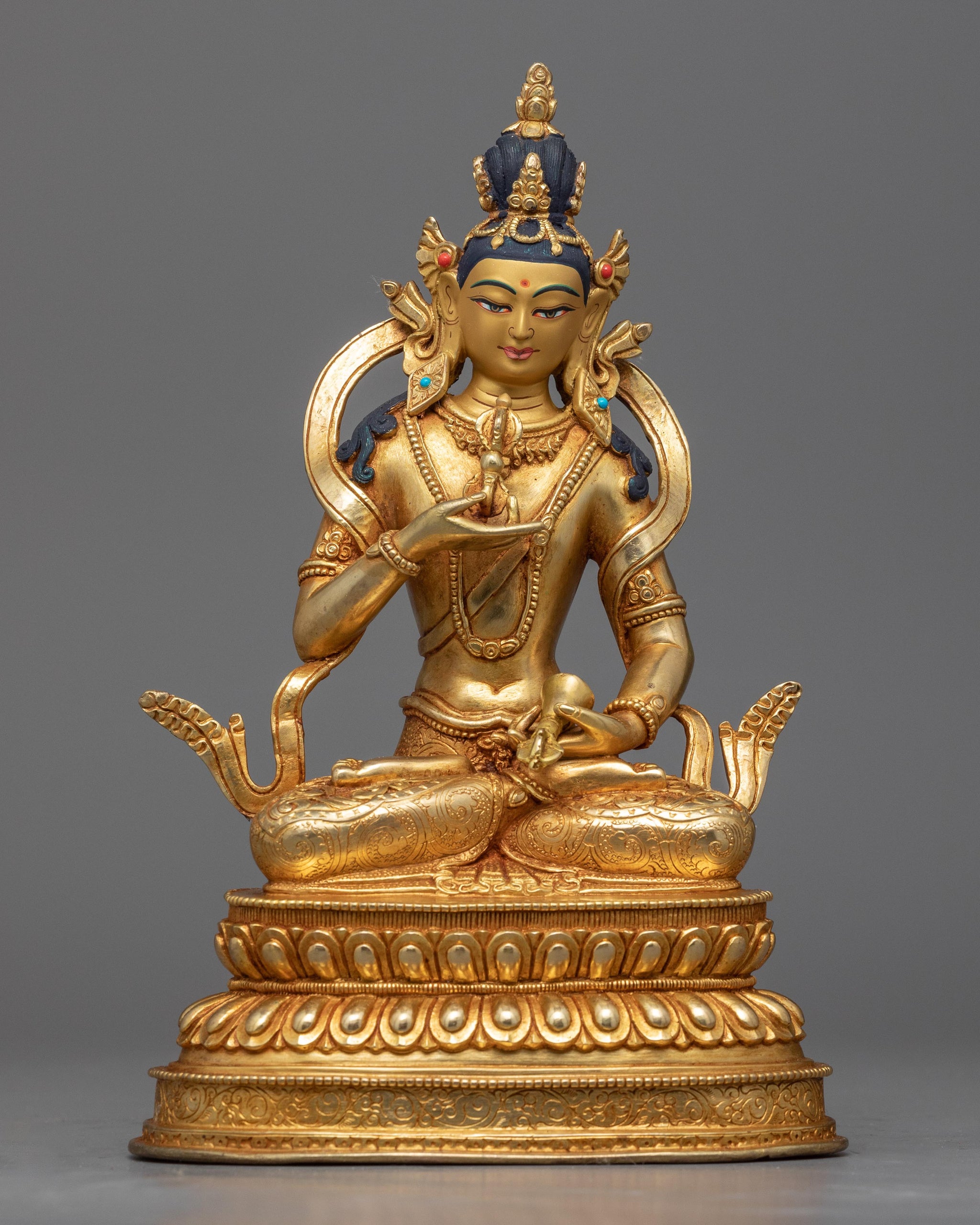 We are Kathmandu Valley artists who have been creating bodhisattva Vajrasattva sculpture that has been passed down from generation to generation, like this Bhaisajyaguru medicine buddha statue. The Bodhisattva can be seen in his customary placid and tranquil demeanor, seated on a moon disc lotus seat and in the lotus position. He holds a vajra, a ritual item that represents the impermanence and constancy of reality, in his right hand and a bell, which stands for emptiness and the sound of wisdom, in his left hand.