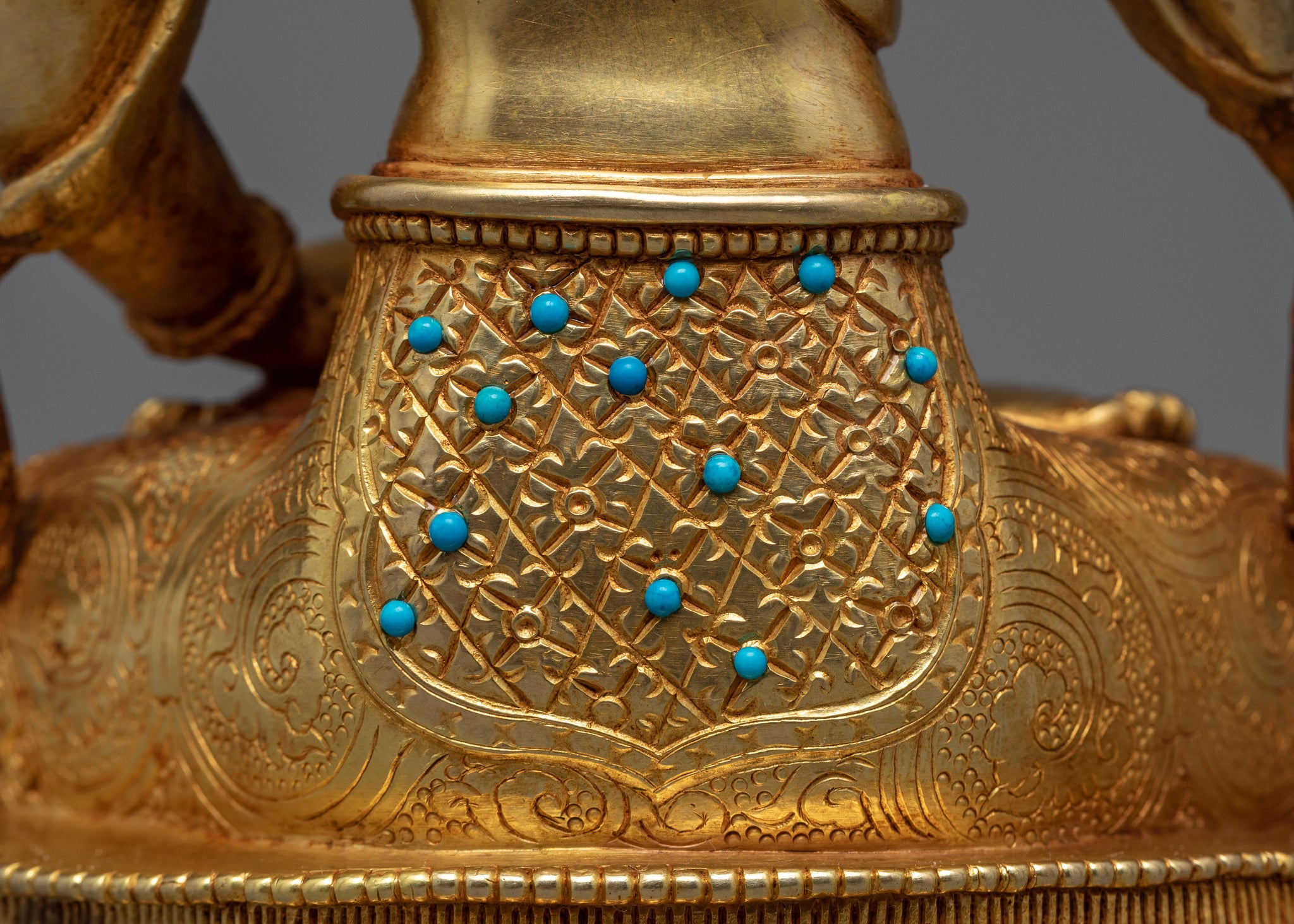 The statue is beautifully painted with acrylic colors, and the additional gemstones to the statue enhance its beauty. This statue's beautiful detailing and gold gilding on its copper body is sure to capture the eye and add a sense of peace and tranquility to any setting.