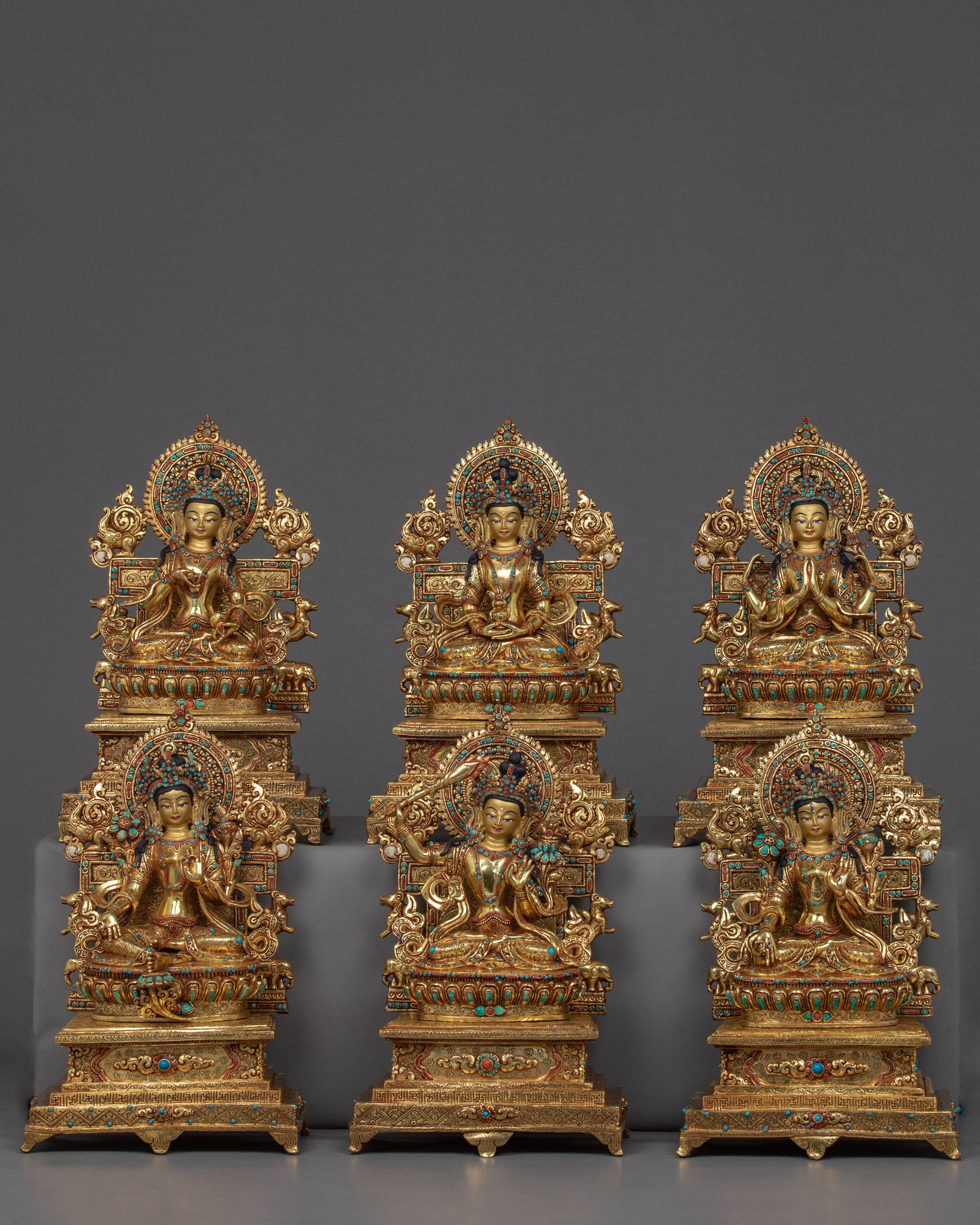 A perfect statues set of Bodhisattva was handcrafted by our master craftsmen with the finest of materials and months of hard work and dedication in our studio in Kathmandu, Nepal. The six statues of Bodhisattva were hand crafted with pure copper bodies and then gilded with 24k gold, each of the statues crafted with the same size and painted with acrylic paints with perfect detail to represent your meditation altar. Each statue represents one of the six Bodhisattva. Nepalese artisans ornamented and embellished deities' jewelry with precious and rare corals and stones. It took us months of hard work carving intricate design patterns that can be used for different Buddhist Rituals and meditational practices.