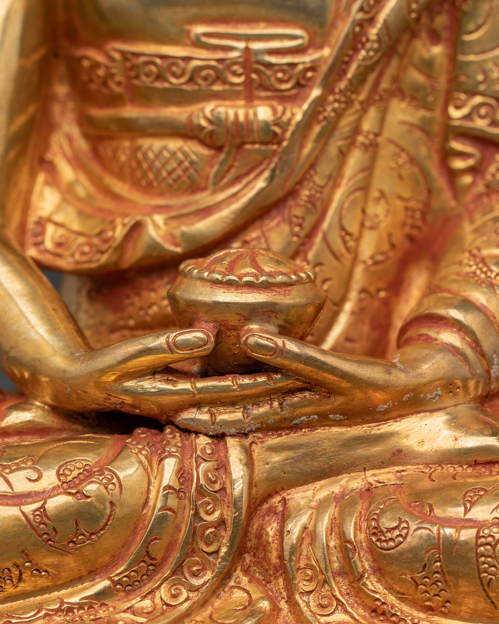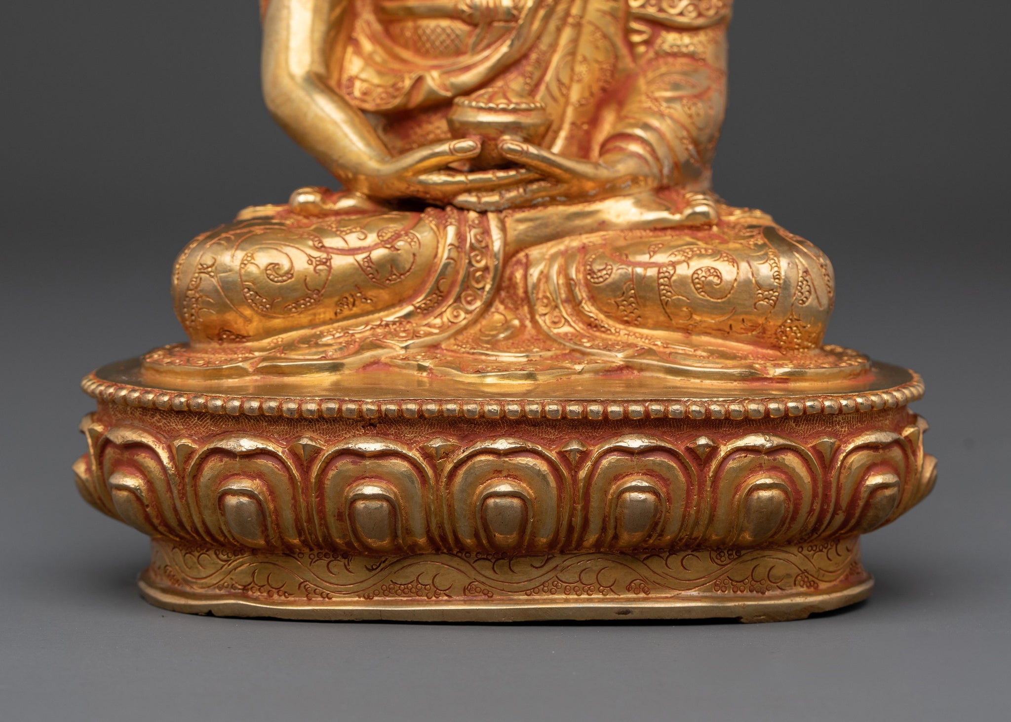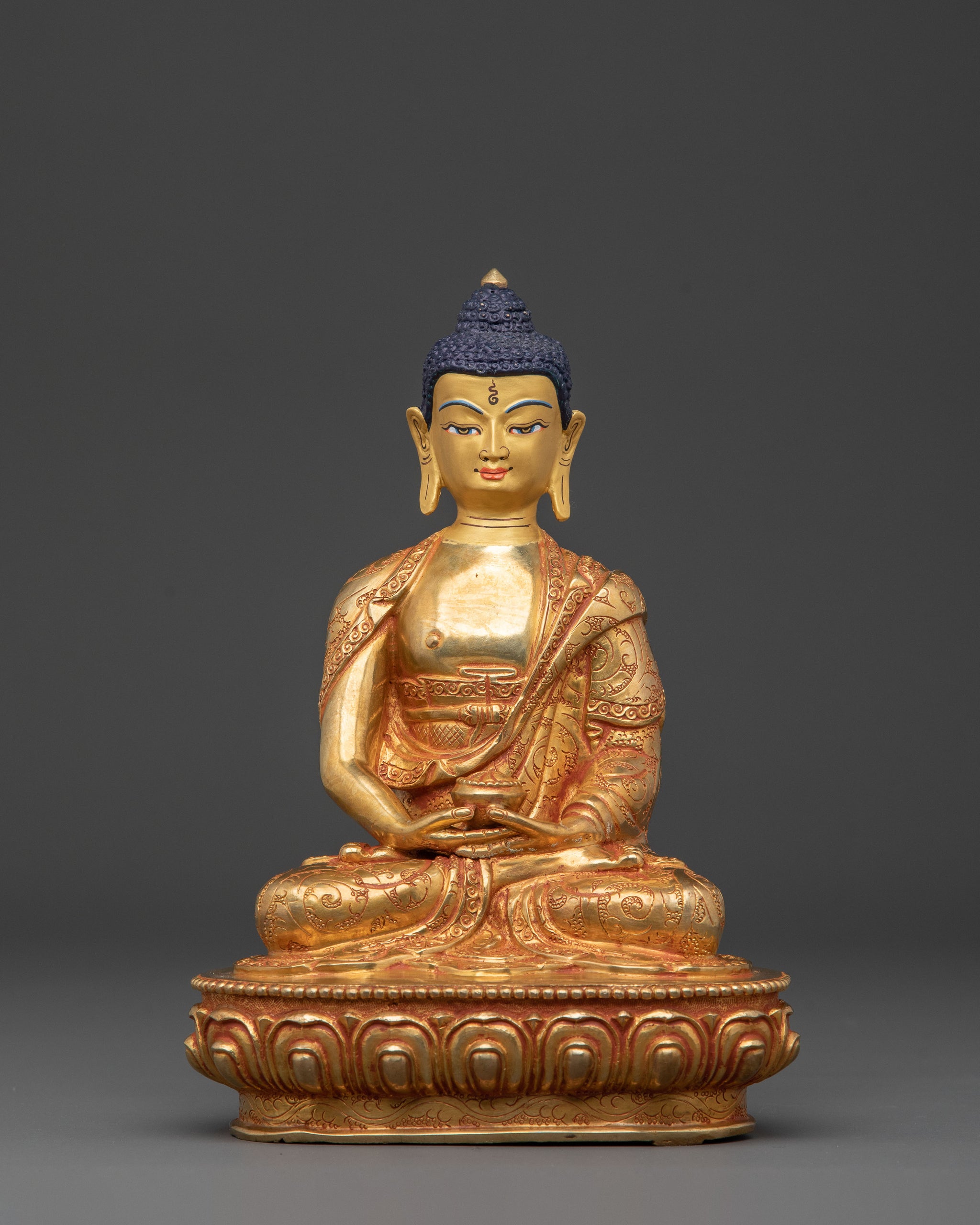 Amitabha Buddha statue emerges, radiating peaceful energy. This exquisite sculpture, standing at 8.5 inches tall, embodies the profound love and wisdom of Amitabha, inviting a gentle presence into your sacred space. Its copper form, carefully shaped by skilled artisans, promises lasting beauty and spiritual solace. Amitabha, depicted in Dhyana Mudra, represents meditative absorption and the attainment of enlightenment. This gesture of profound contemplation symbolises his boundless compassion and his vow to guide all beings to the Pure Land of Sukhavati. His presence serves as a gentle reminder of the path to inner peace and ultimate liberation.