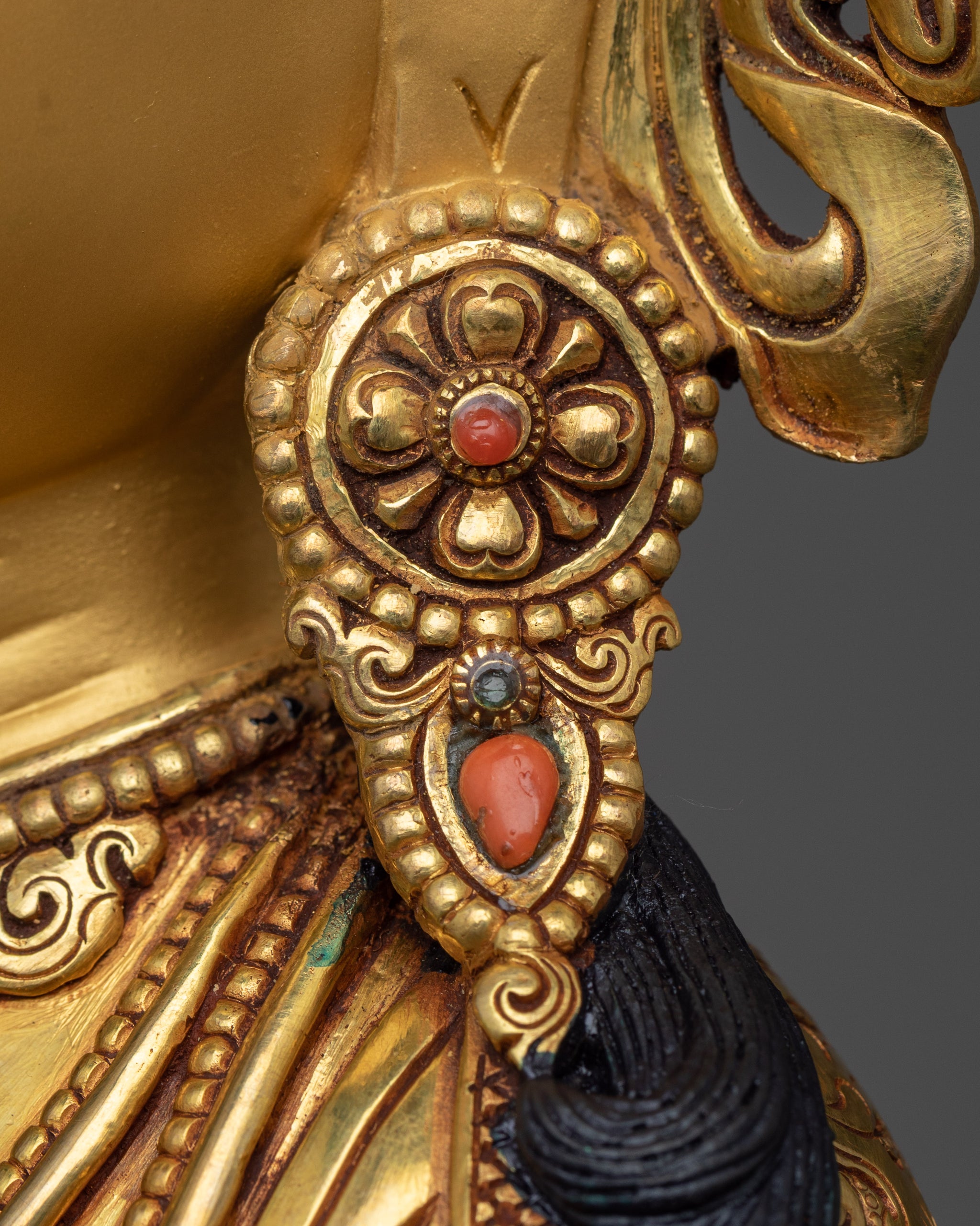 Our Buddha Amitayus Empowerment Statue, a heavenly masterpiece radiating unlimited life and unbounded enlightenment, will elevate your spiritual path. The statue is a beautiful representation of timeless elegance and spiritual riches, precisely made in triple layers of 24k gold and embellished with exquisite 24k gold and acrylic paints, bringing a touch of divine brilliance to its presence.