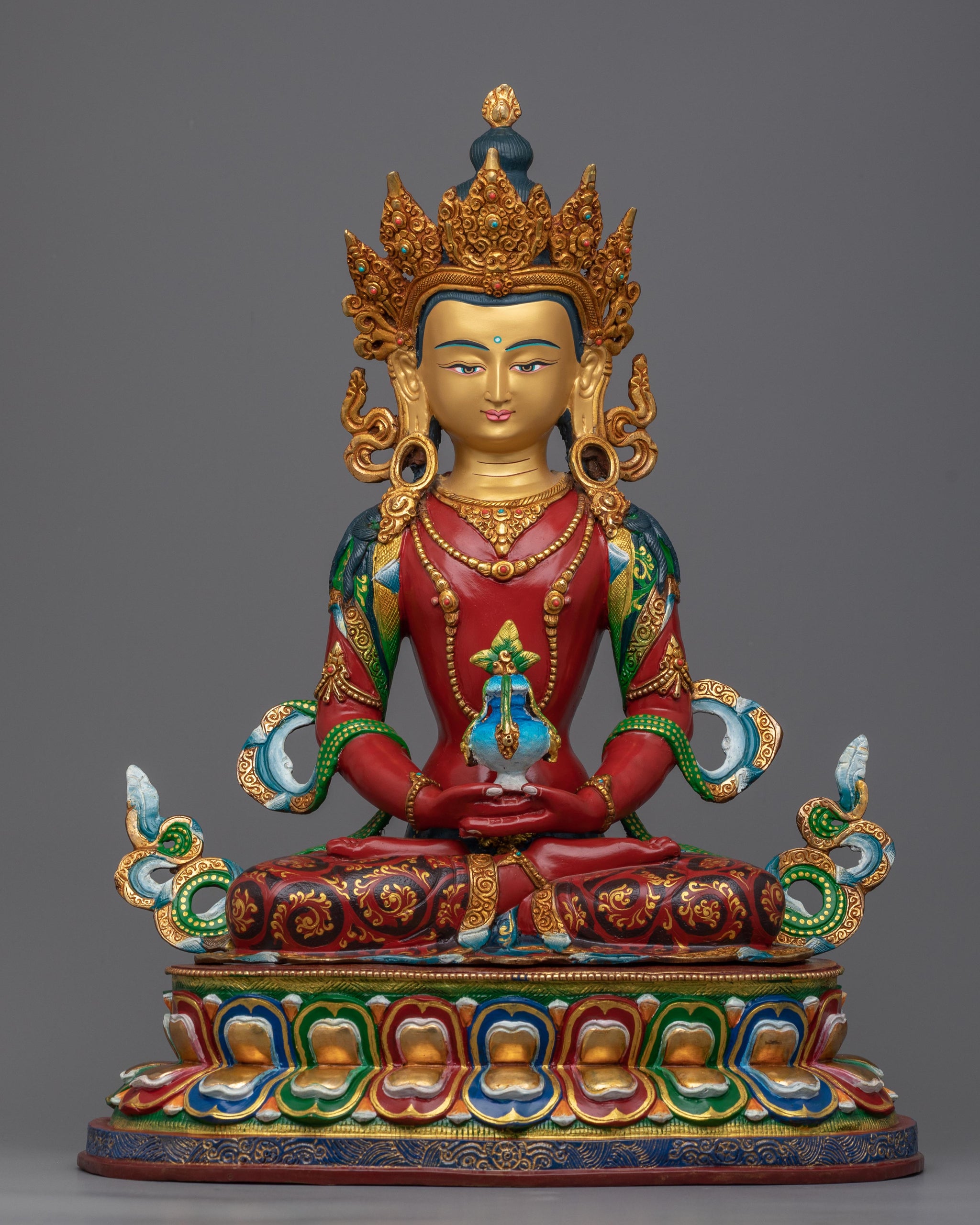 Our Buddha Amitayus statue is made of durable copper and delicately painted with Red Acrylic paints, which enhances the aesthetic appeal and embodies the purity of Buddha's teachings. The hand-carved images on the robes and accessories tell stories of knowledge and enlightenment. The calm facial features are highlighted with acrylic paints, and a liberal coating of gold powder provides a beautiful air.