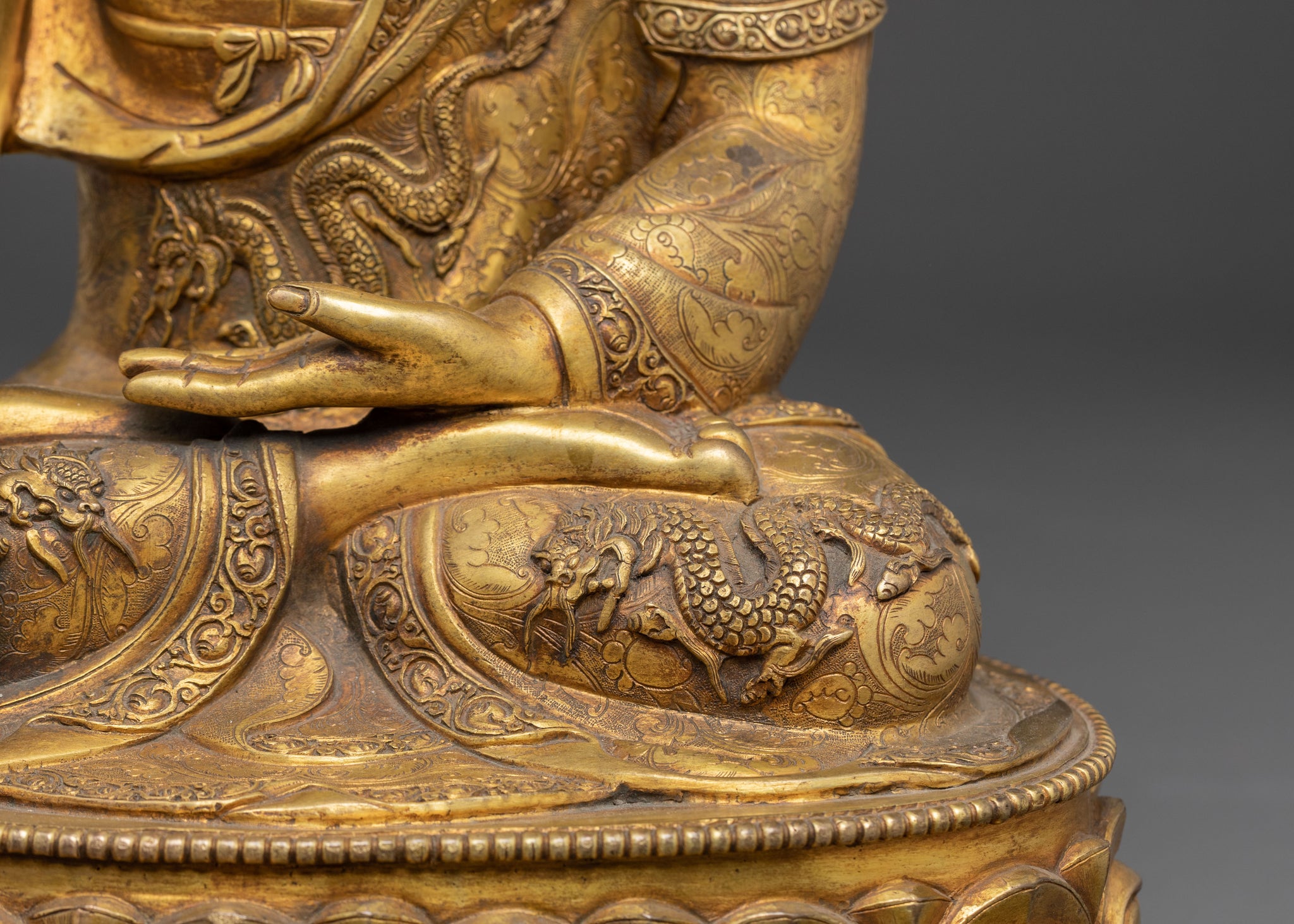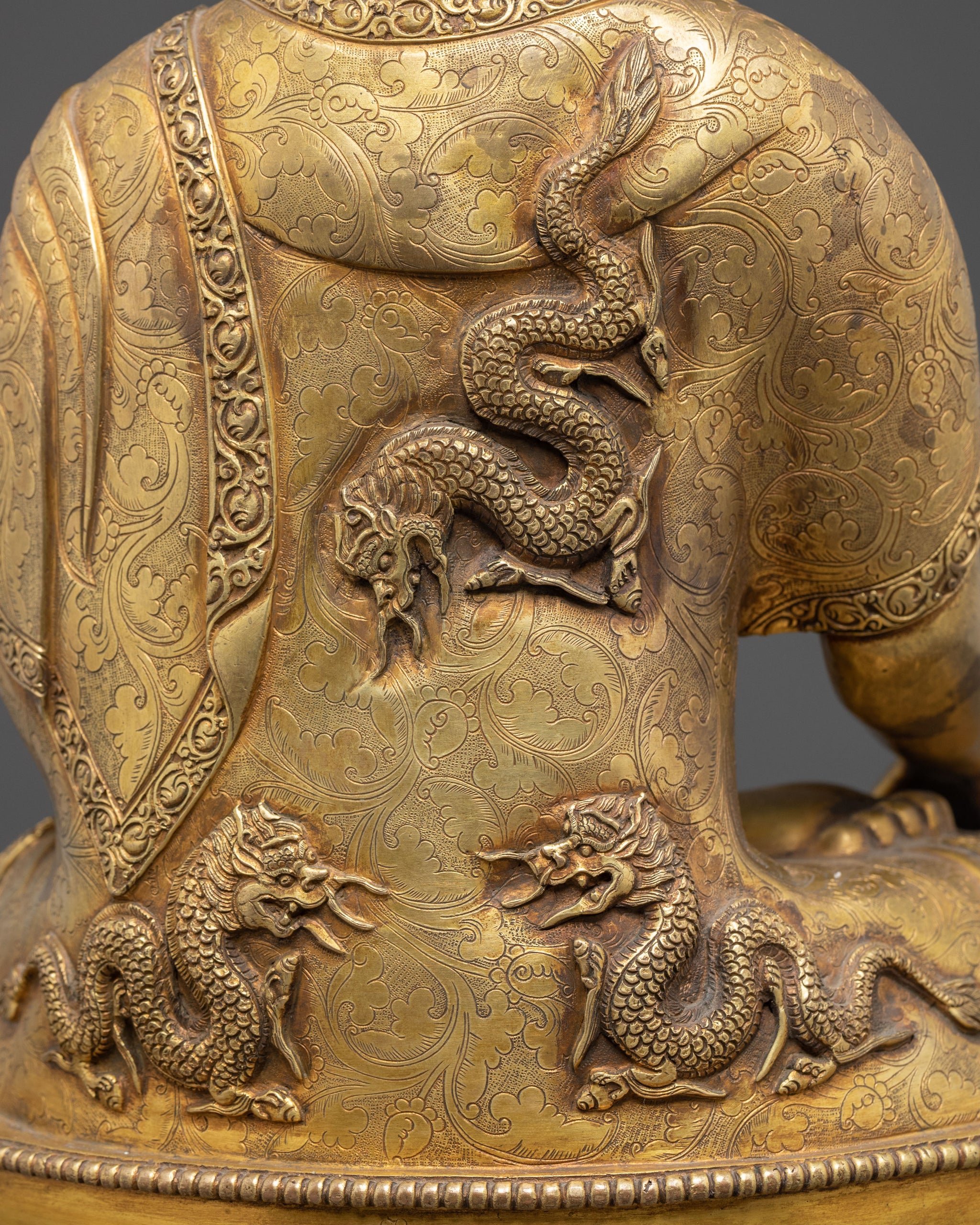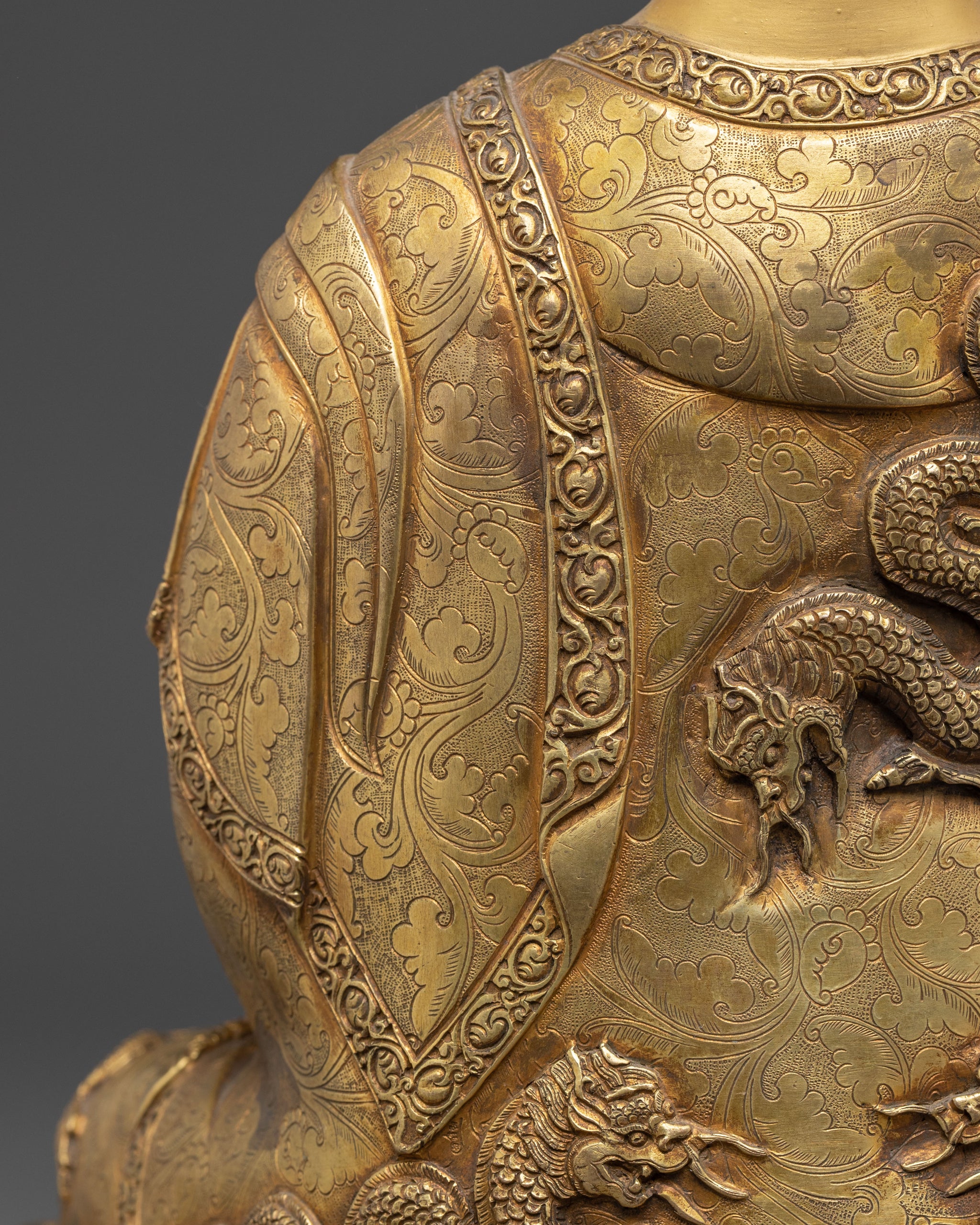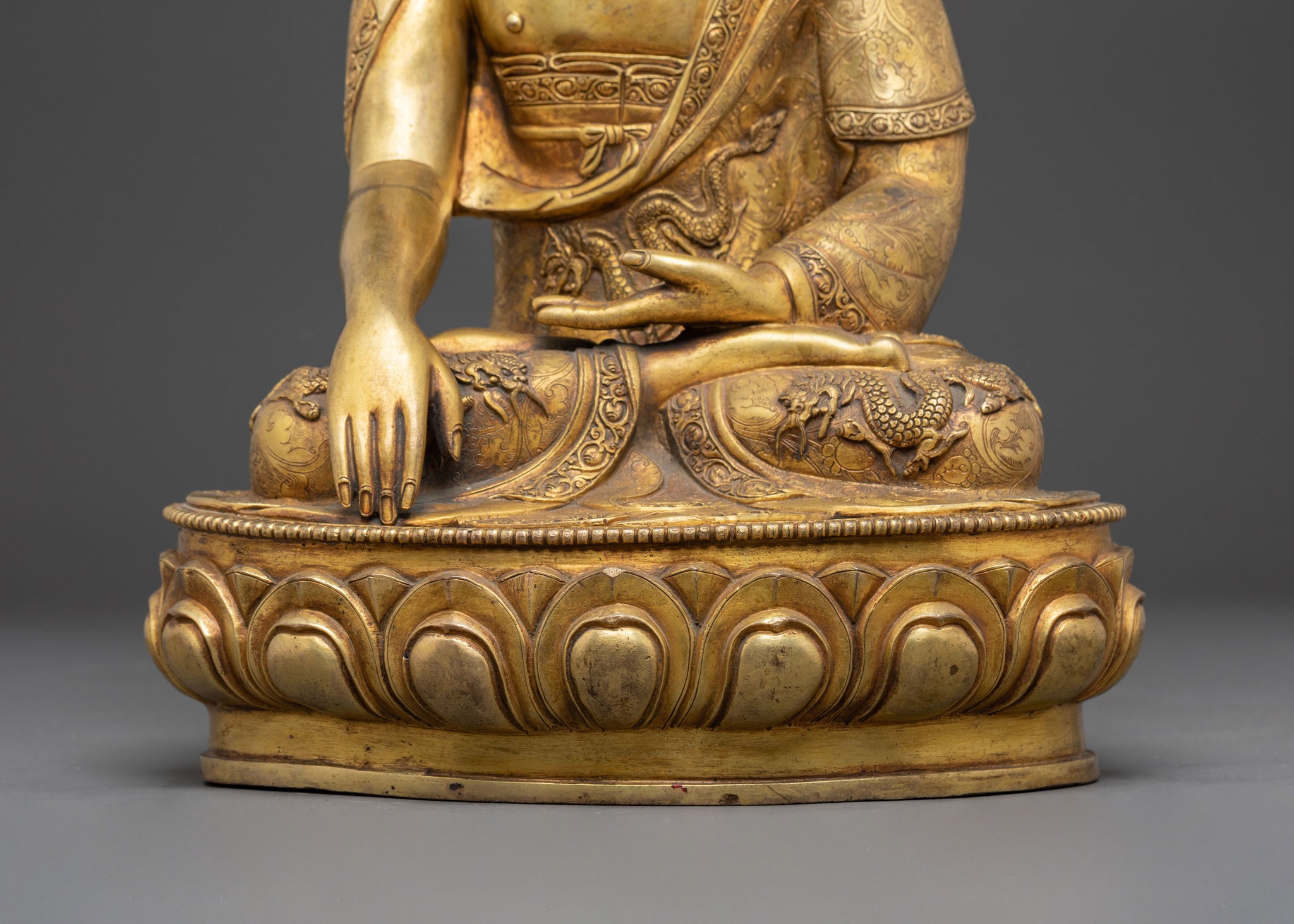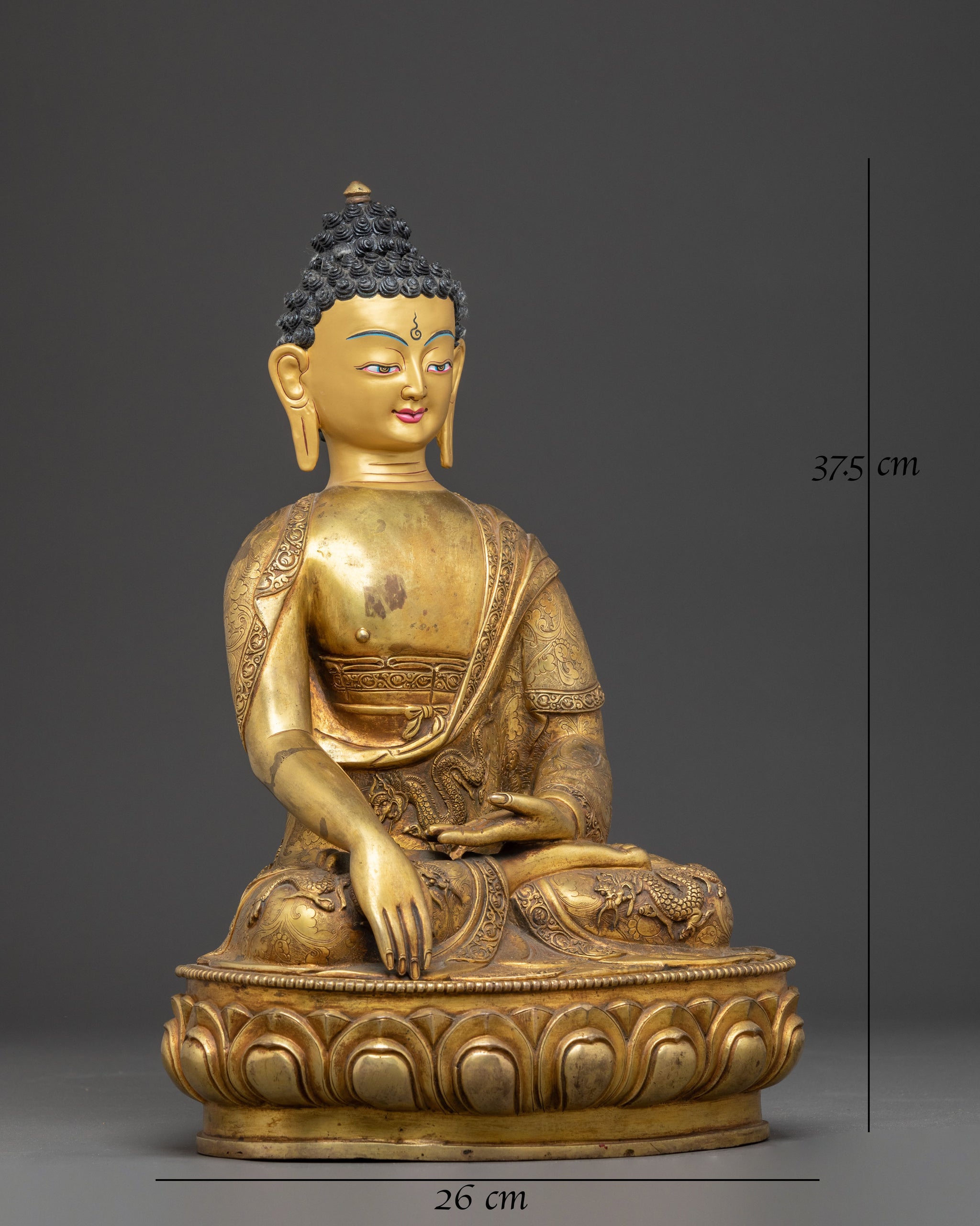 This Peaceful Enlightened Buddha Gautama Golden Copper Statue stands at 14.8”/37.5cm in height and 10.2”/26cm at the base, weighing 5.79 kg. Expertly handcrafted from copper, covered with a triple layer of 24K gold gilding, and carved with deeply engraved carvings that produce a magnificent 3D-like effect. This sculpture, handcrafted by expert Nepalese artisans, elegantly symbolizes Himalayan Buddhism's sacred traditions, making it an appropriate addition to altars, meditation places, or sacred collections.