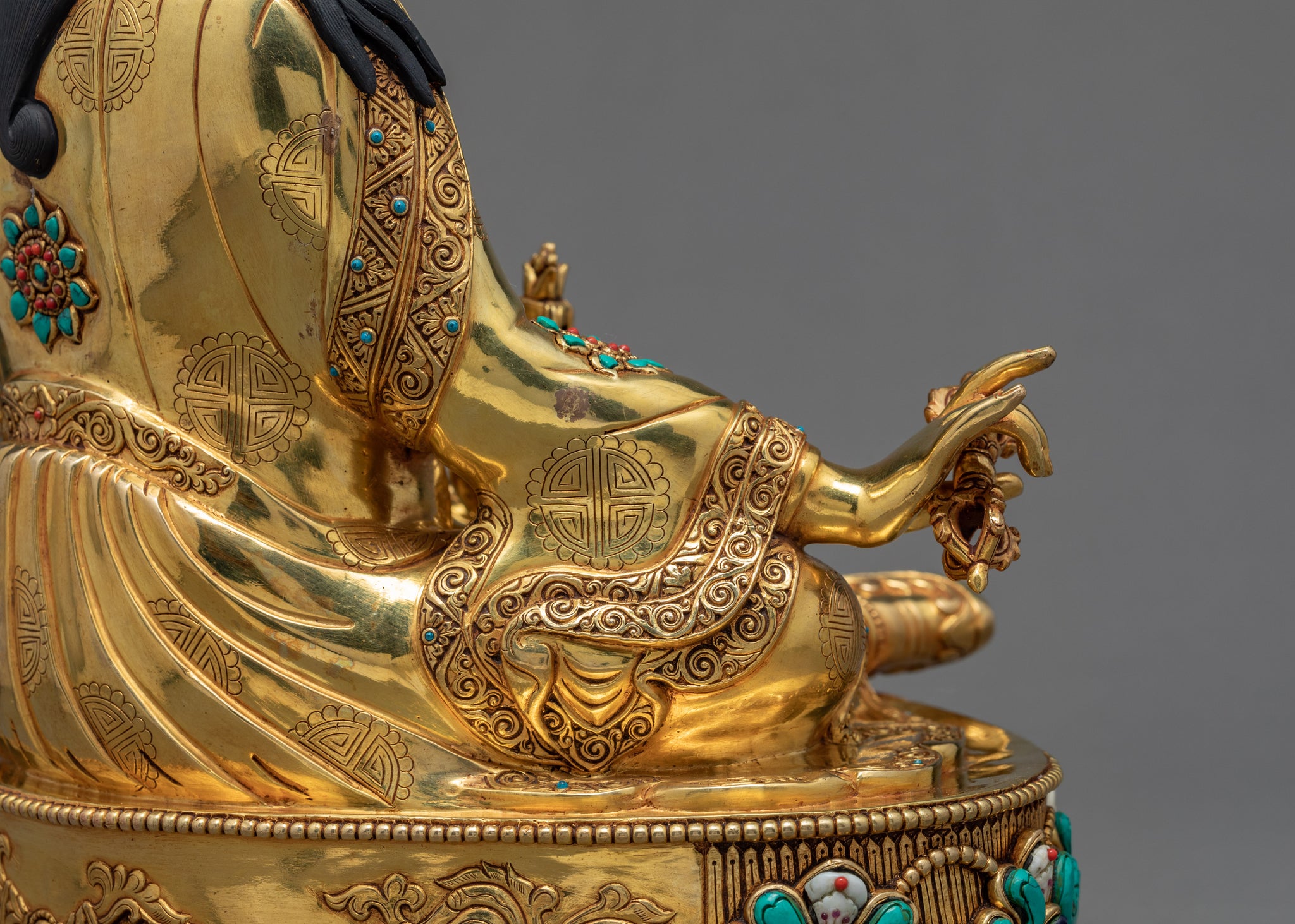 In this Buddhist statue, Guru Rinpoche is shown wonderfully. This Buddha Sculpture is made in copper and gilded in 24K gold by a Nepali artist in Kathmandu. He has a vajra specter in his right hand and a skullcup with a jar of immortality in his left. The Khatvang trident, his celestial spouse of ecstasy and emptiness, is held in the curve of his left hand.