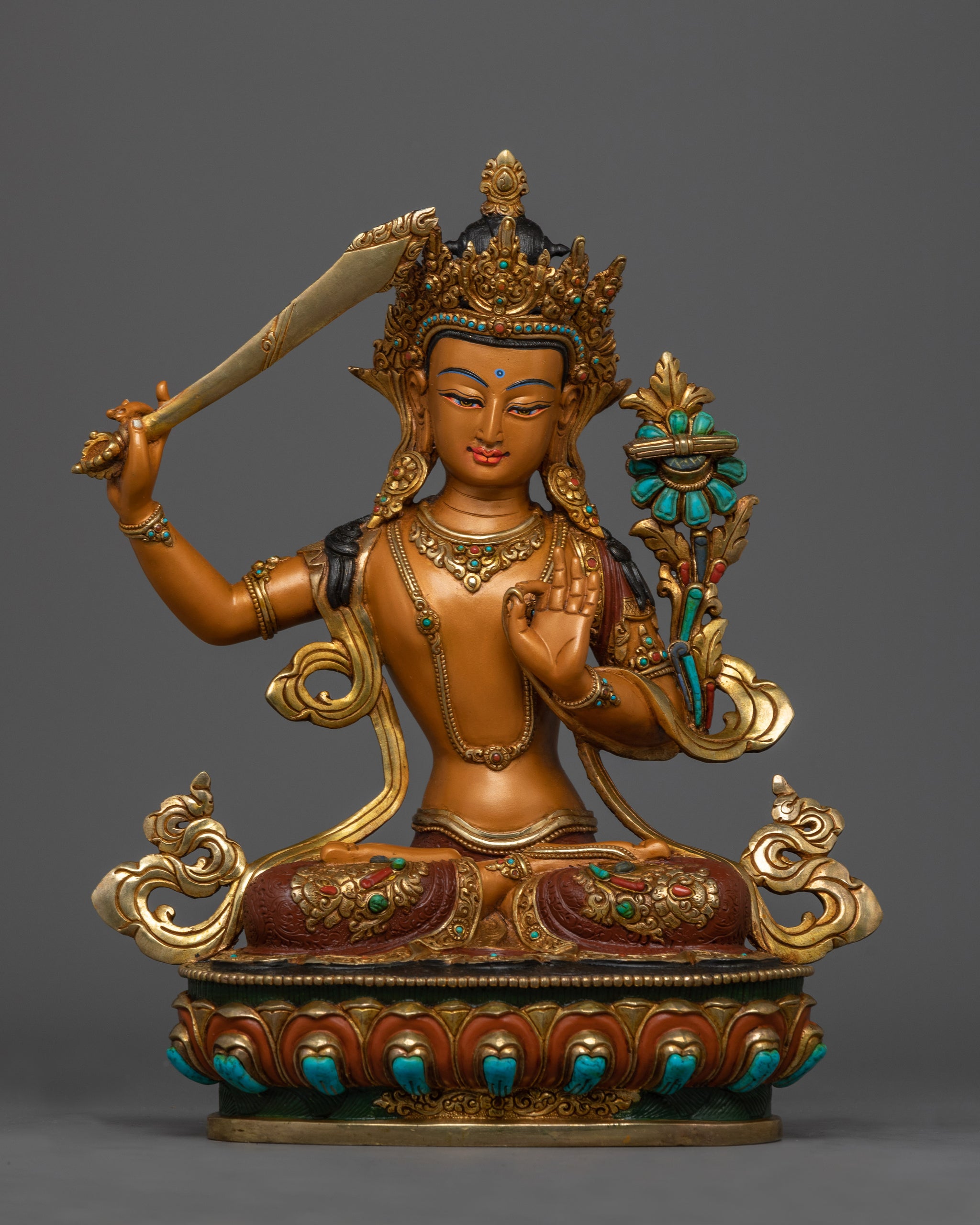 Hand-Carved Buddha Manjushri Statue | 13.4" Tibetan Wisdom Deity Sculpture