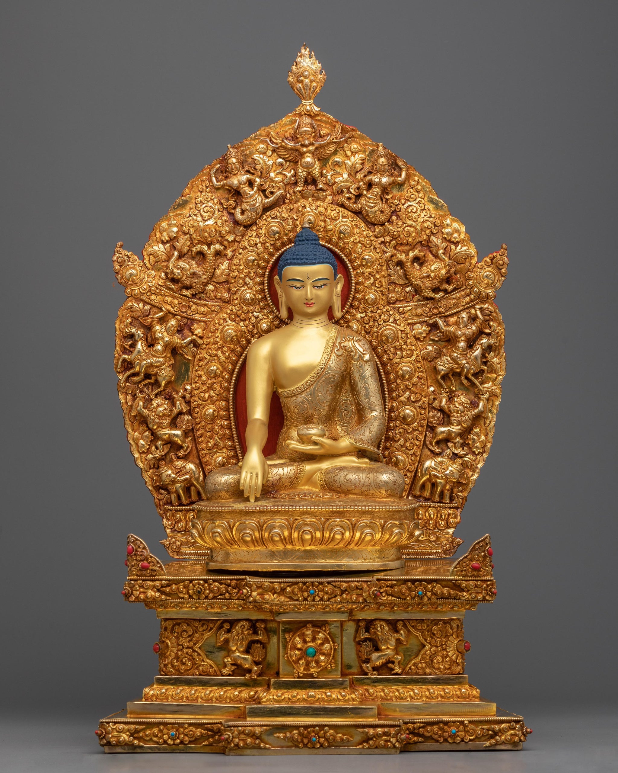 With our majestic Buddha Shakyamuni statue, you can experience the essence of enlightenment. This 24K gold-gilded statue is an astounding 18.8 inches tall and is a sign of serenity, knowledge, and compassion. Each detail, from the Buddha's tranquil look to the complex designs on his robes, is handcrafted by our skilled Nepalese artisans and resonates with Buddhist teachings.