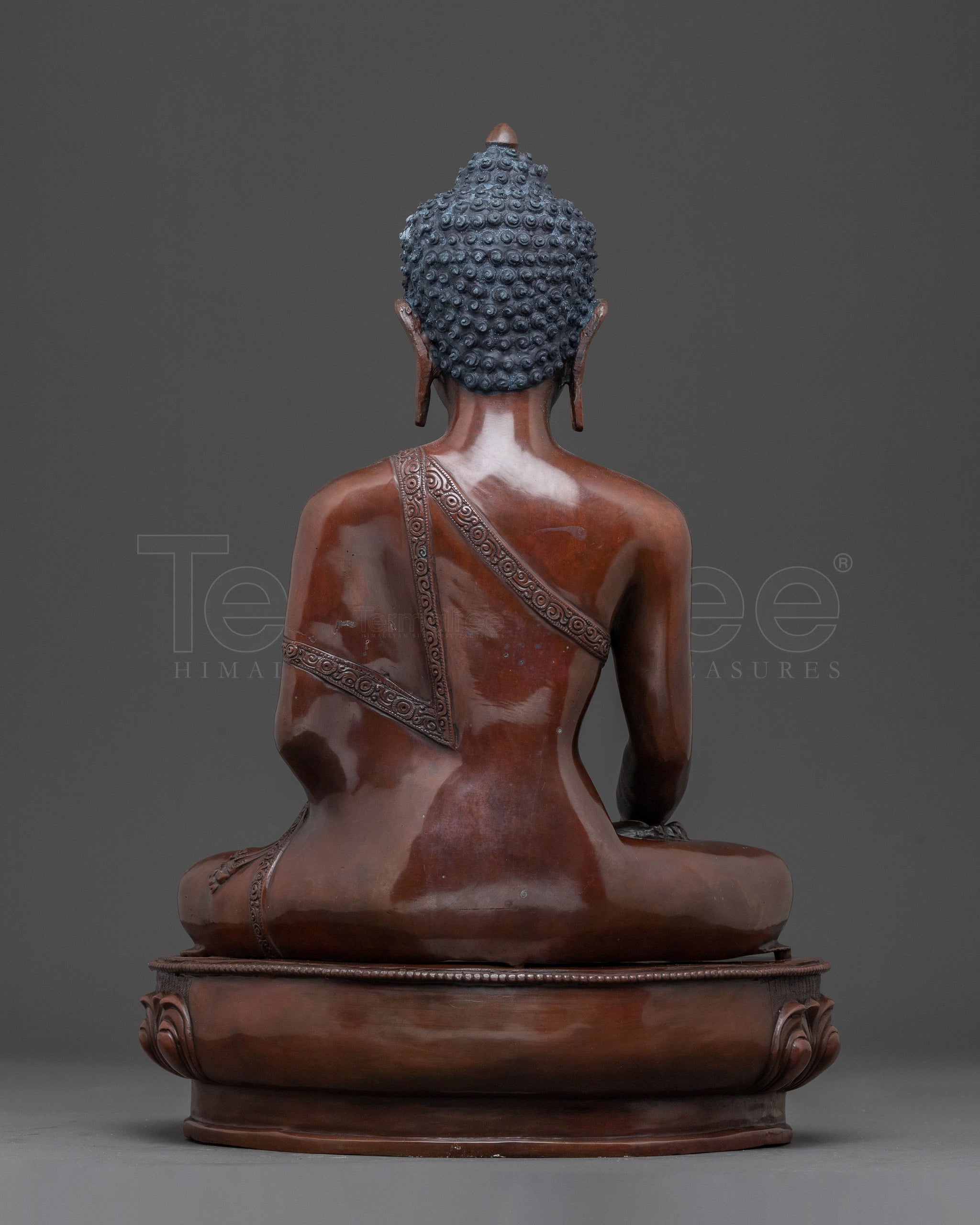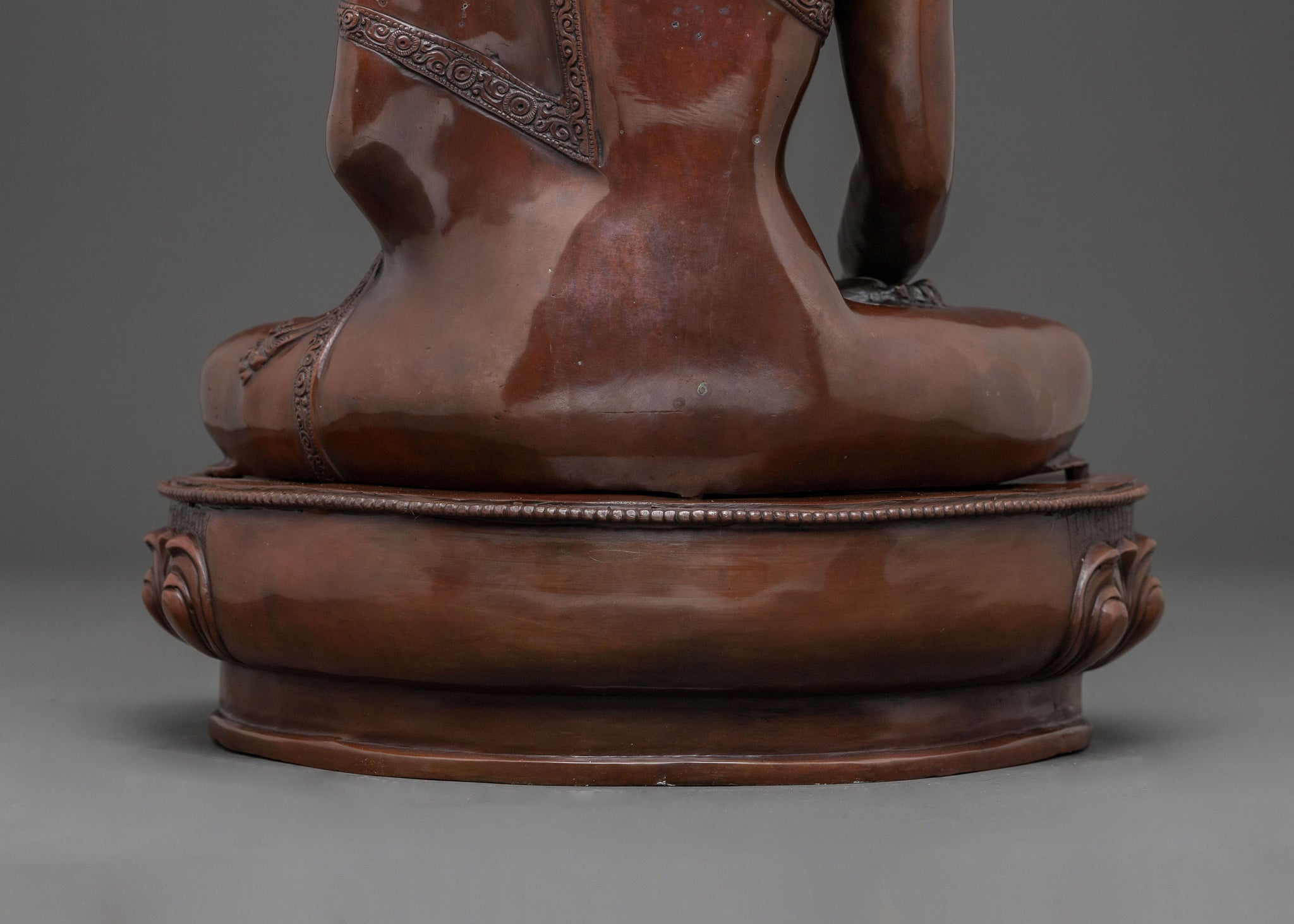 The Shakyamuni Buddha Altar Statue stands at 15.7”/40cm in height and 11.0”/28cm at the base, weighing 5.72 kg. Expertly handcrafted from oxidized copper, it features a rich, antique finish that enhances the serene presence of the Enlightened One. The deep brown tones and intricate detailing reflect traditional Himalayan craftsmanship. This piece is ideal for those seeking a classic, grounding presence in their meditation space, altar, or spiritual setting.