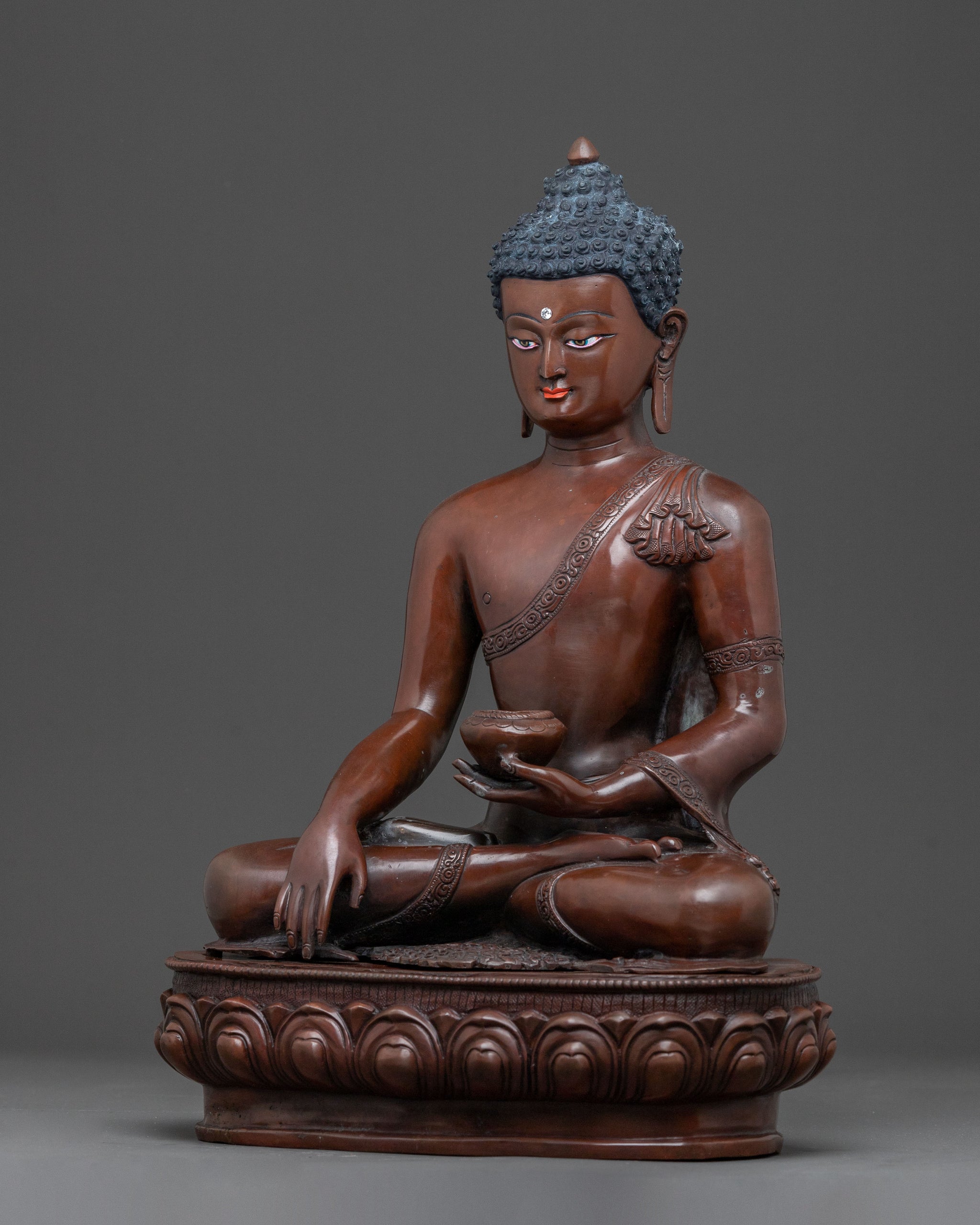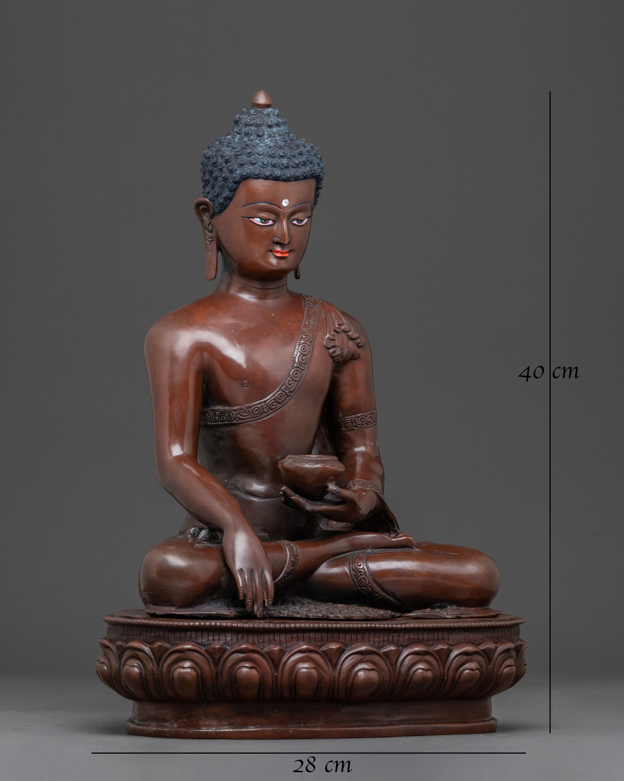 This statue captures Shakyamuni Buddha seated in padmasana atop a lotus base, embodying dhyana mudra with his right hand resting in his lap and left hand holding an alms bowl, symbolizing renunciation and inner peace. The ushnisha crown and elongated earlobes reflect his enlightened status and royal background. Draped in a monastic robe, he sits on a double lotus base, signifying purity and transcendence. Ideal for meditation spaces, altars, or spiritual collections, this piece invites calm, mindfulness, and a deeper connection to the path of awakening.