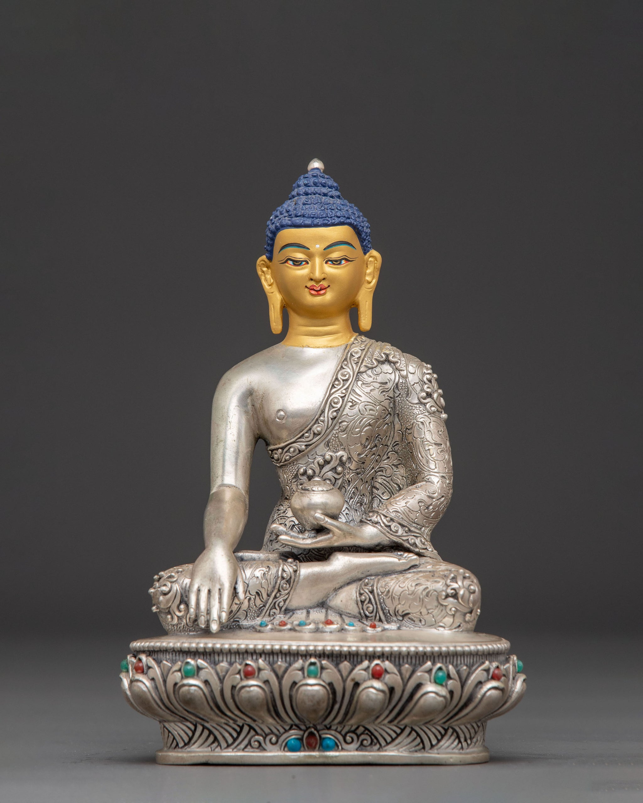 The Buddha Shakyamuni sits gracefully in the padmasana (lotus posture), his right hand raised in the bhūmisparśa mudrā, calling the earth to witness his awakening. His left hand cradles a delicate alms bowl, symbolizing renunciation and inner peace. Topped with a uṣṇīṣa, the crown signifies his boundless wisdom. The base takes the form of a blooming lotus, representing purity and spiritual awakening—perfect for enhancing your sacred space with timeless elegance and profound meaning.