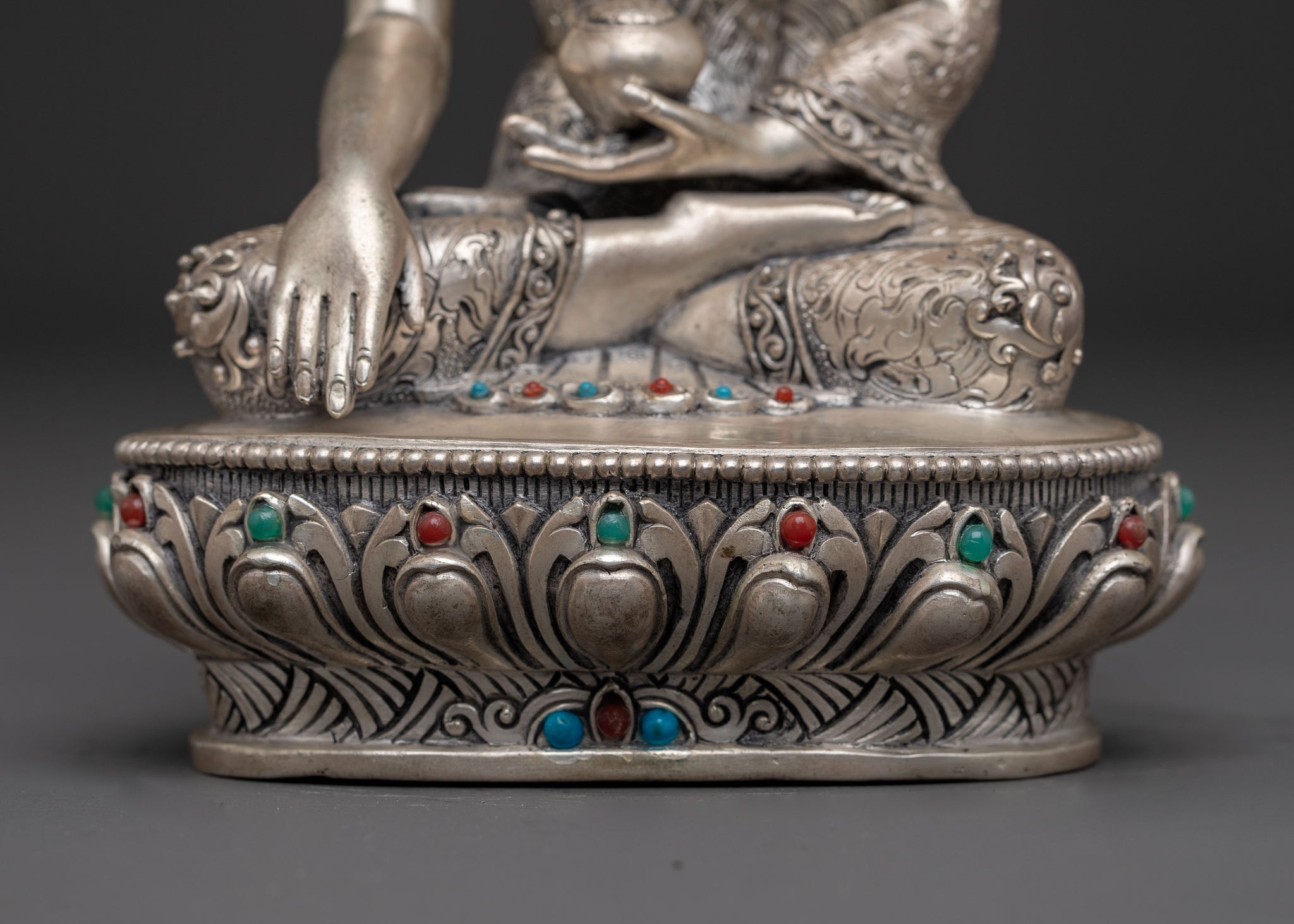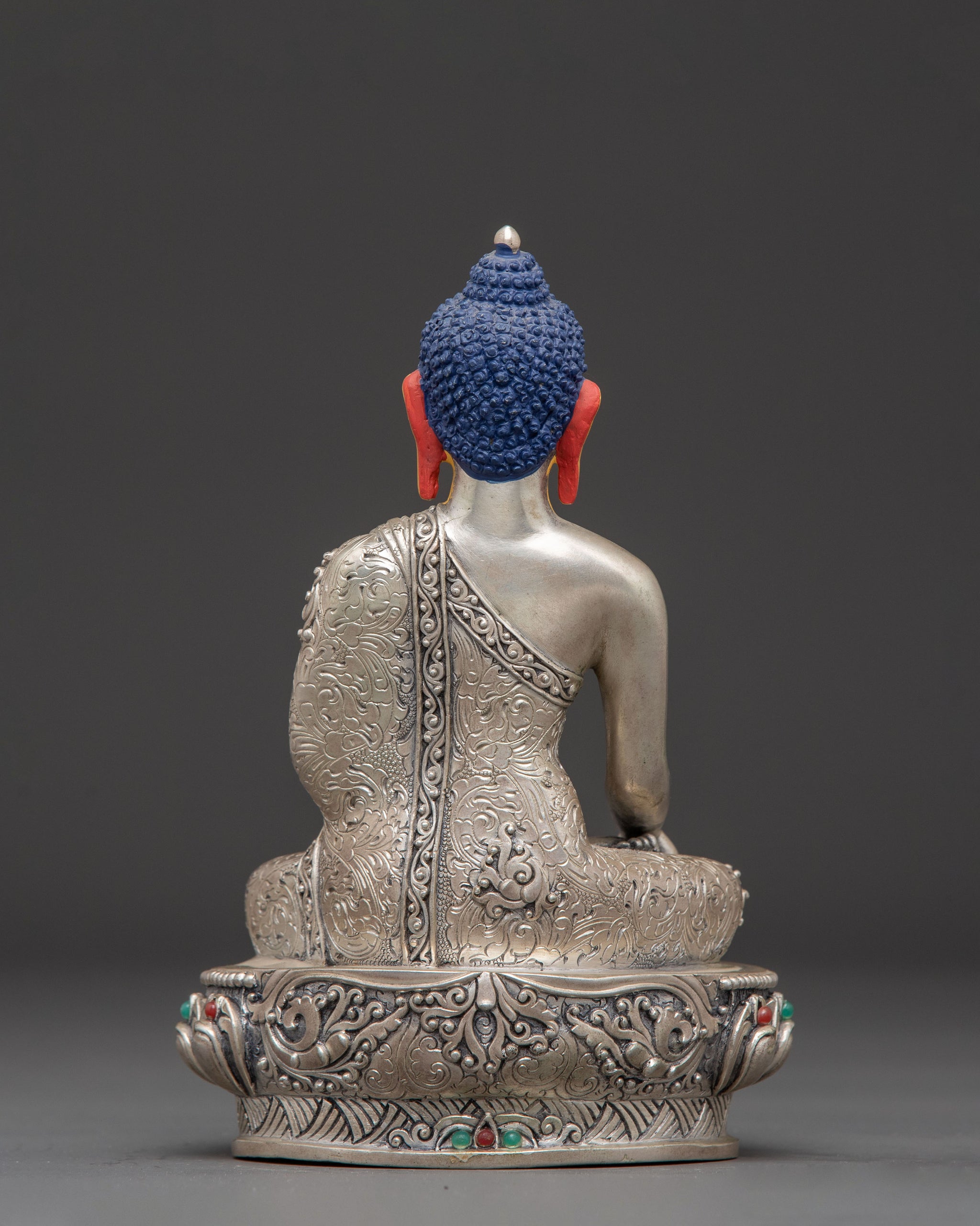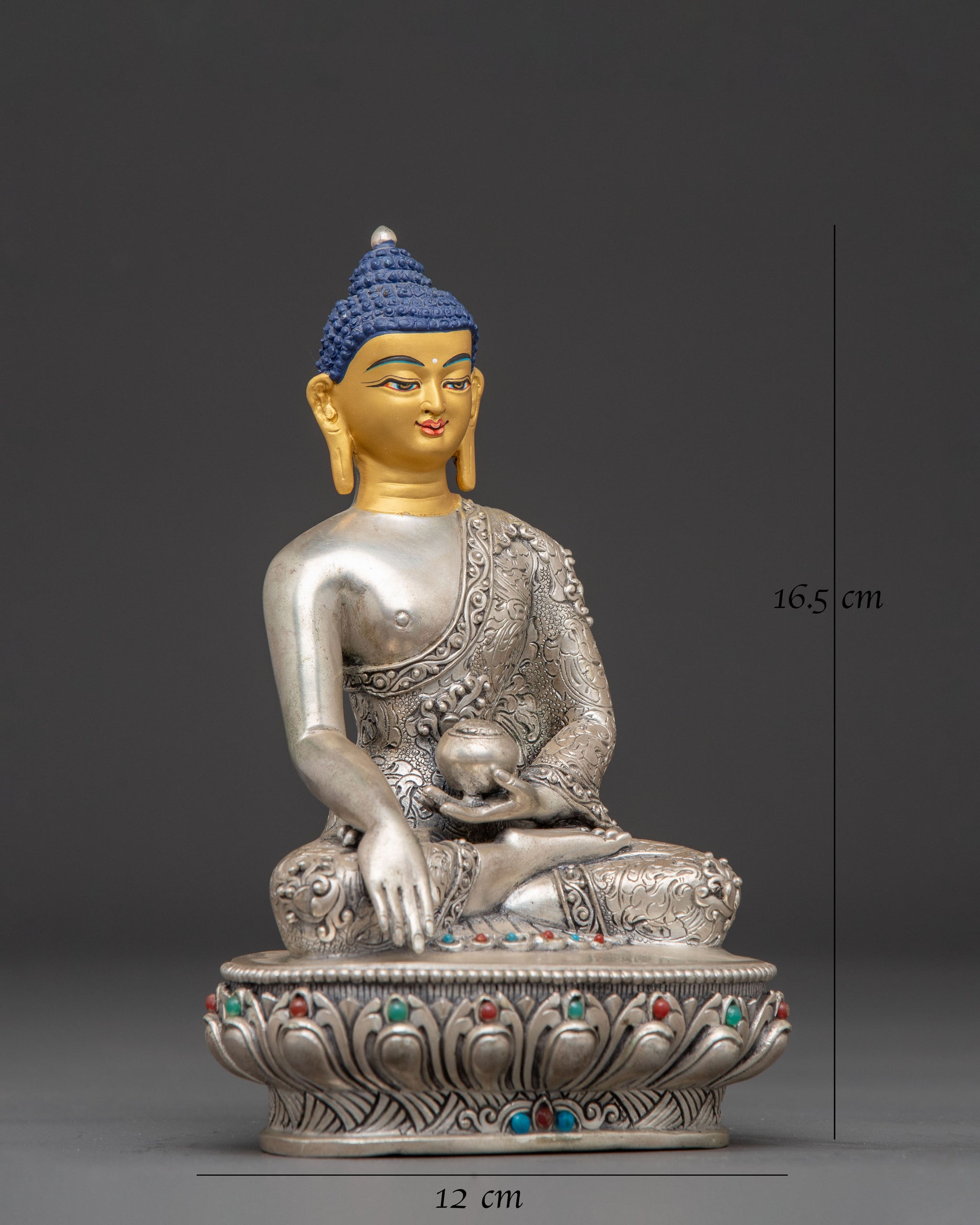 This Peaceful Buddha Shakyamuni Himalayan Statue measures 6.5 inches (16.5 cm) in height and 4.7 inches (12 cm) across the base, weighing 0.63 kilograms. Made from a copper body, it features silver plating and acrylic paintings that enhance its serene presence. Expertly crafted by skilled artisans in Nepal, this statue reflects traditional craftsmanship and makes a refined addition to compact altars, meditation spaces, or personal spiritual collections.