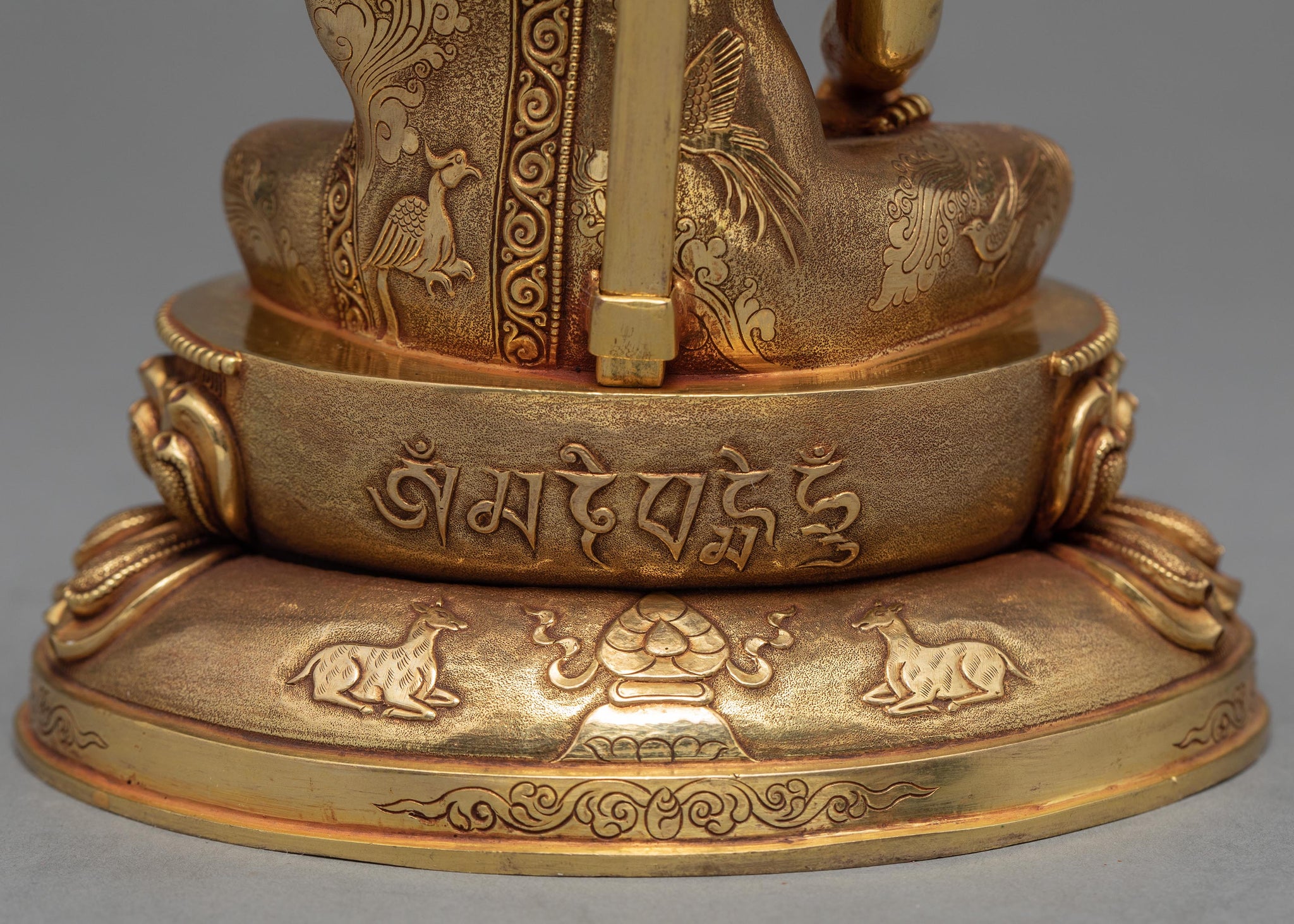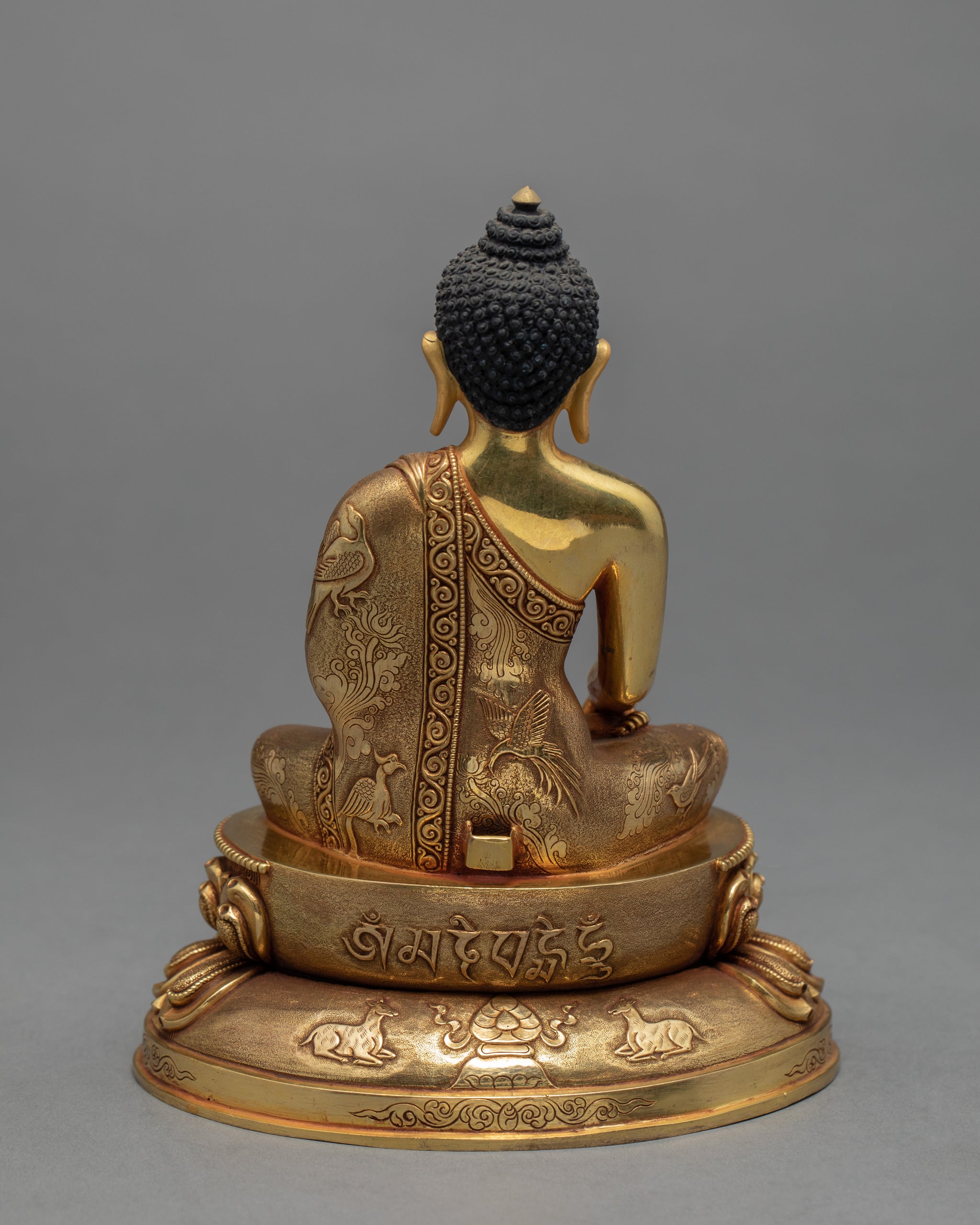 Shakyamuni Buddha Statue with a calm and peaceful face, seated in vajra posture on a lotus seat. This statue is hand-carved made up of copper and gilded with 24k pure gold.. His goal was to free all people from suffering, and his awakening was the realization of effective means for teaching everybody the path to awakening. He is regarded as the founder of the world religion of Buddhism, and revered by most Buddhist schools as a savior,[8] the Enlightened One who rediscovered an ancient path to release clinging and craving and escape the cycle of birth and rebirth.A perfect Buddha Statue for your meditation shrine.