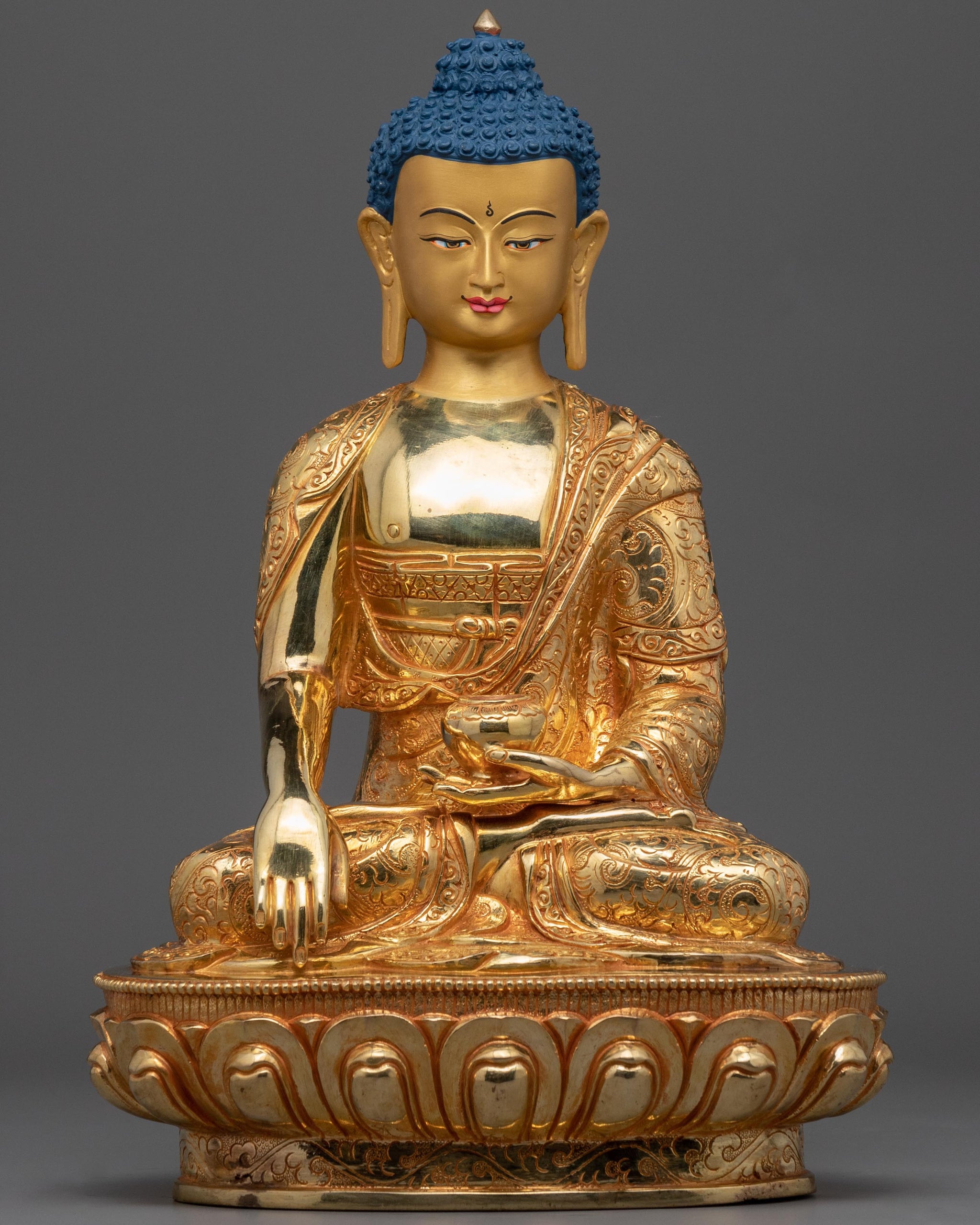 The Shakyamuni Buddha Statue Home Decor Statue was skillfully hand-sculpted in Nepal's traditional Himalayan art style. In this statue, he is shown seated on a moon-shaped lotus seat. His right hand is conducting an earth-touching mudra while his left is holding an alms bowl. The figure was molded from copper; then, 24K gold was used for gilding it. The statue's gilding in gold reflects its excellence and lends it a wonderful sheen. Beautiful design patterns have been hand-carved into the statue, especially on the lotus seat and the robe. To highlight the facial attributes of the deity, we used acrylic paintings.