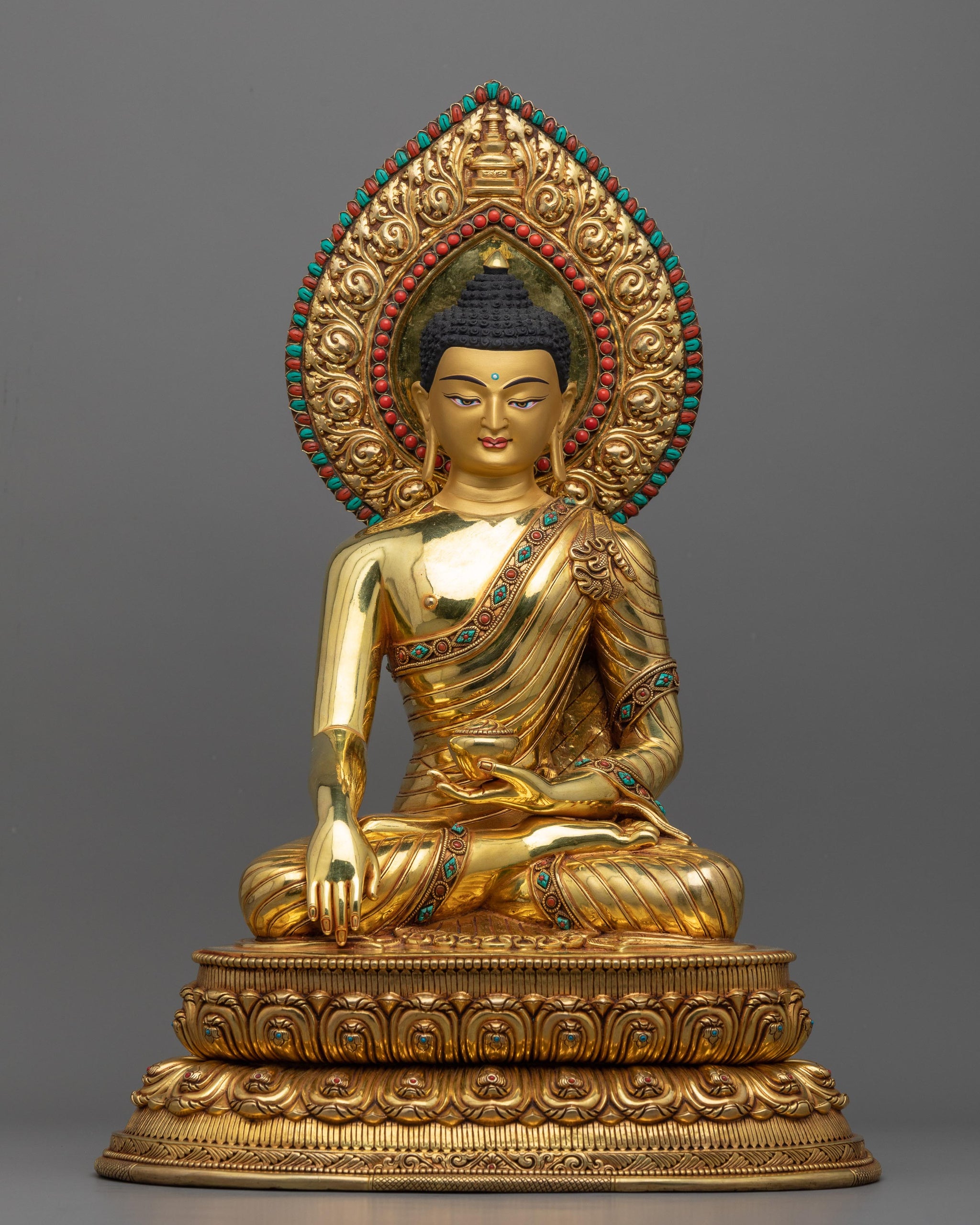 Discover the extraordinary 16.1-inch Shakyamuni Buddha statue's unmatched beauty and tranquility. This magnificent work of art represents the rich tradition of Tibetan Buddhist art. This magnificent sculpture, which was expertly handmade in Nepal using age-old lost wax casting methods, is 16.1 inches in height, 11.4 inches at the base, and weighs a hefty 6.25 kg. The delicate acrylic paintings and Triple Layer 24-karat gold gilding on the quality copper body perfectly depict the soul of the Enlightened One. Hand-carved gemstones fitted perfectly in the Halo and body robe. Very deeply designed intricated patterns make the statue even more divine and beautiful. This gorgeous Tibetan Buddha statue can enhance your home décor, meditation area, or gift-giving experience while embracing the spiritual teachings of Buddhism.