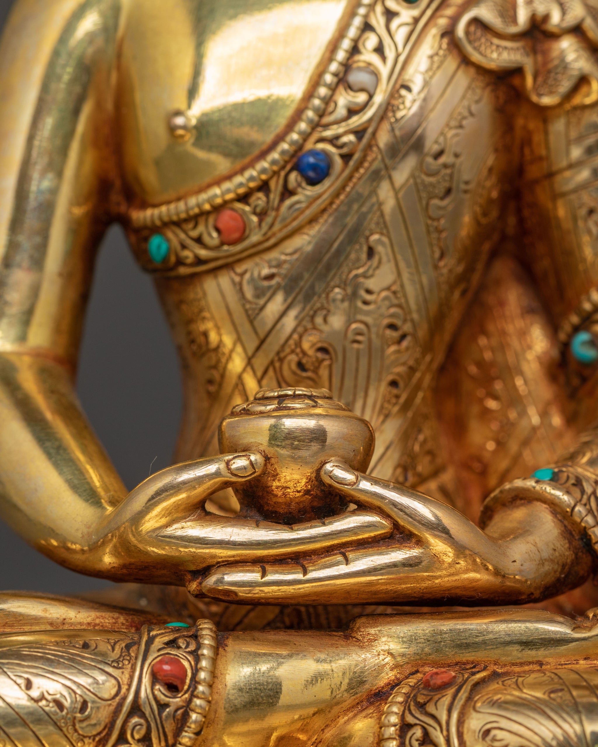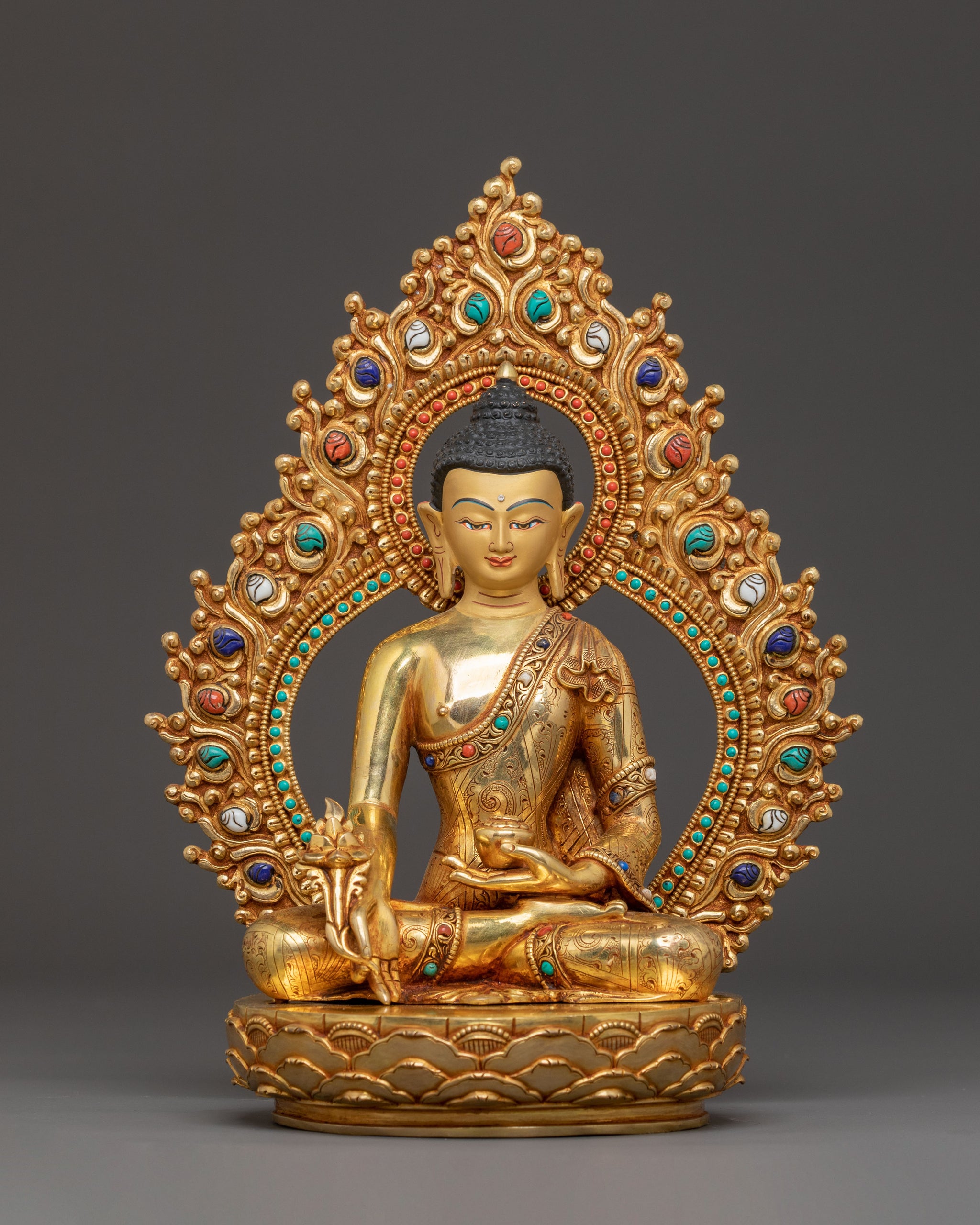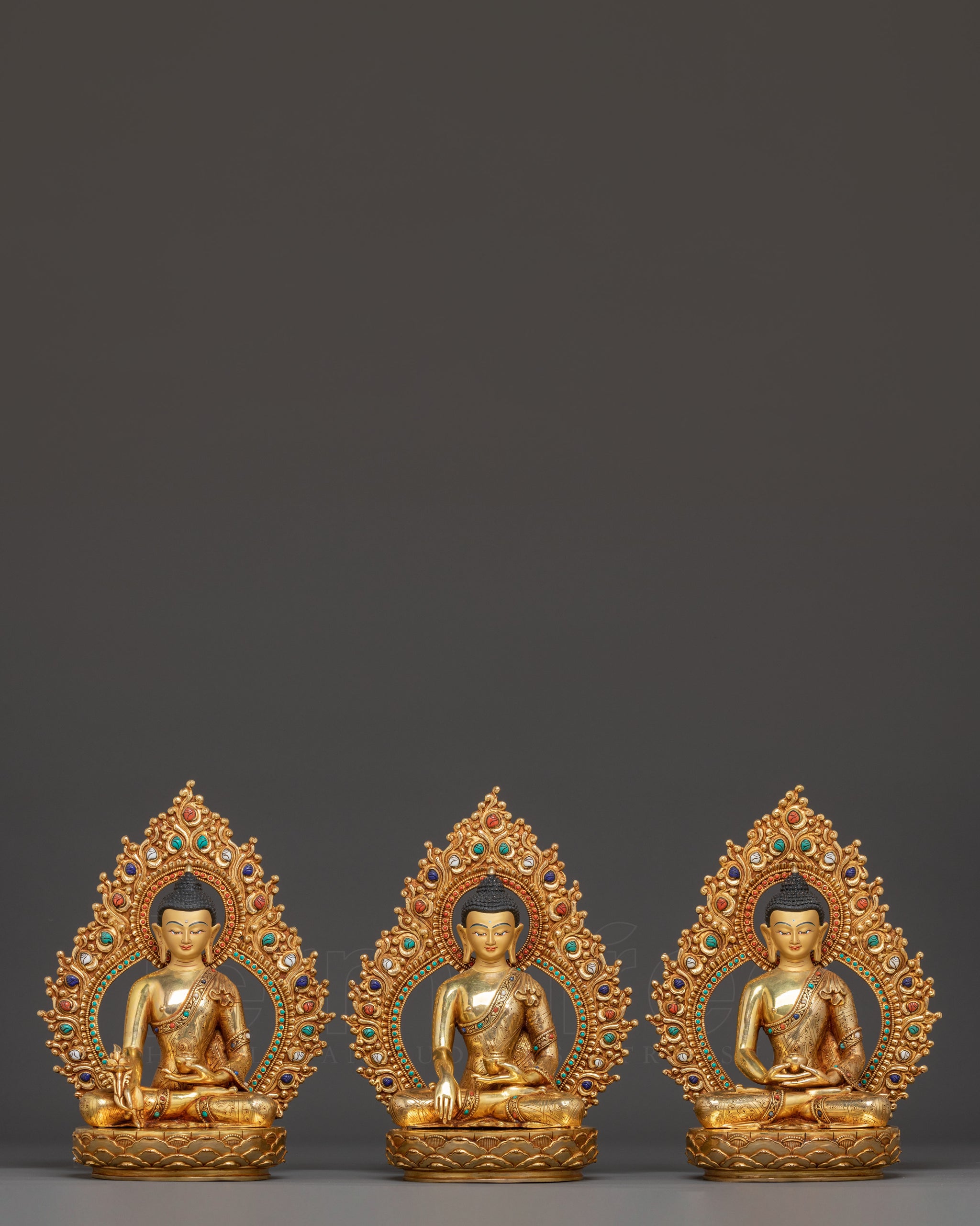 Radiating an aura of serene enlightenment, this Buddha trinity golden statue set, each standing 26cm tall with an integrated base, offers a profound focal point for spiritual contemplation. Crafted from solid copper, these meditation statues embody stability and grace, making them perfect for any sacred space or discerning collector. Forged by master artisans in Nepal, the statues are hand-gilded with a luxurious 24K gold finish, applied in multiple layers for enduring radiance. Intricate chasing and engraving adorn the robes, while hand-carved gemstones and subtle acrylic paintings embellish the halos and thrones, showcasing breathtaking Himalayan artistry. The deeply engraved carvings create a stunning 3D-like effect, enhancing the statues' timeless beauty.