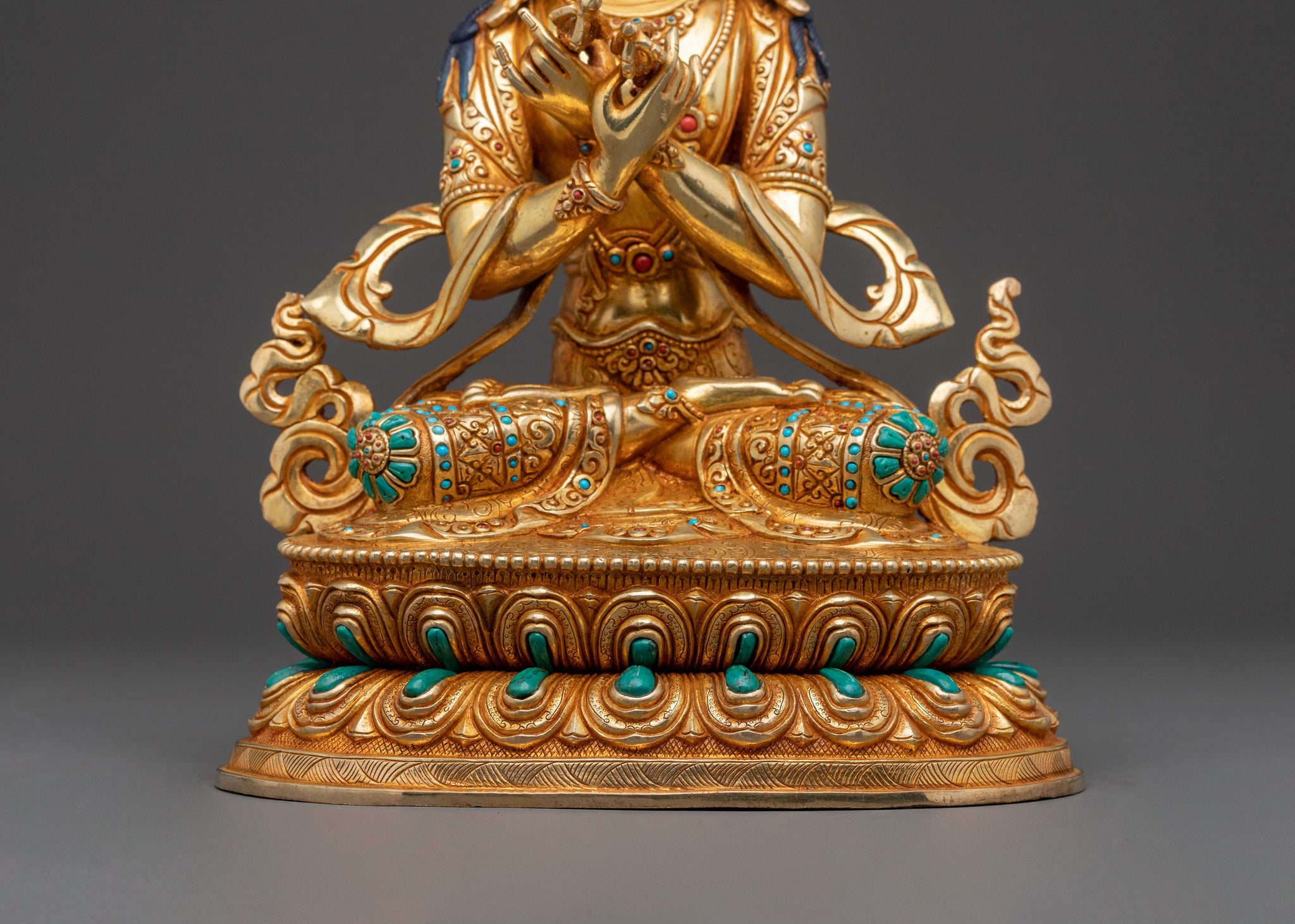Emerging from deep meditation, this exquisite copper statue of Buddha Vajradhara captures the primordial essence of enlightenment. Standing 31 cm (12.2") tall, with a 21.5 cm (8.5") base and weighing 2.91 kg, it features a radiant 24K gold-gilded finish and delicate acrylic paintings, emanating profound spiritual tranquility. Covered with a triple layer of 24K gold gilding and intricately carved with deeply engraved details that produce a magnificent 3D-like effect, this handcrafted piece of Buddhist art serves as a powerful focal point for devotion and inner peace, reflecting Nepal's rich artistic legacy.